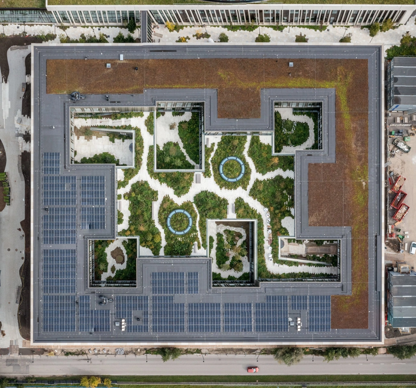 The building and landscape at Steno Diabetes Center Copenhagen are closely interwoven, creating a seamless connection between indoors and outdoors. This relationship helps make the landscape omnipresent and supports the fundamental vision of architecture that places human wellbeing and health at its core. SDCC is organised around four green courtyards and a publicly accessible rooftop garden, ensuring that natural elements are ever-present. These outdoor spaces introduce daylight into the building’s interior, offering views of the sky and first floor.