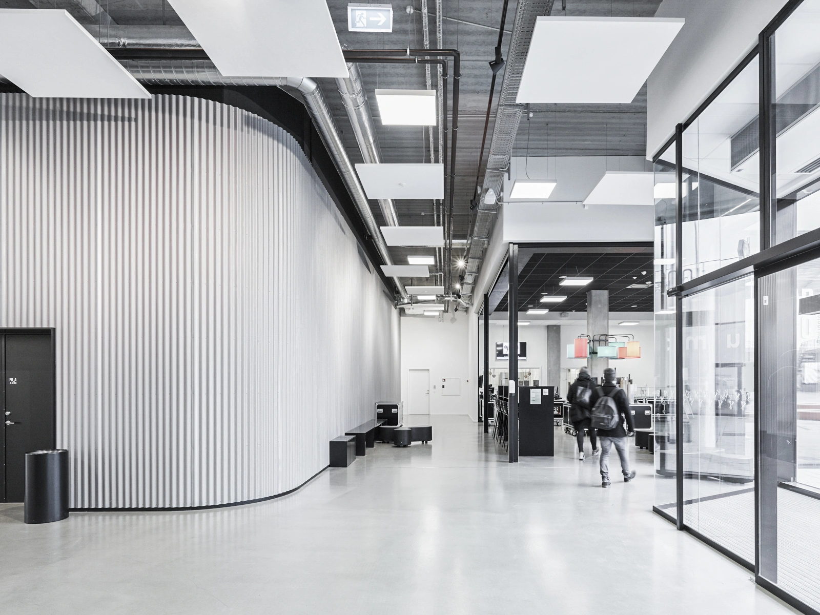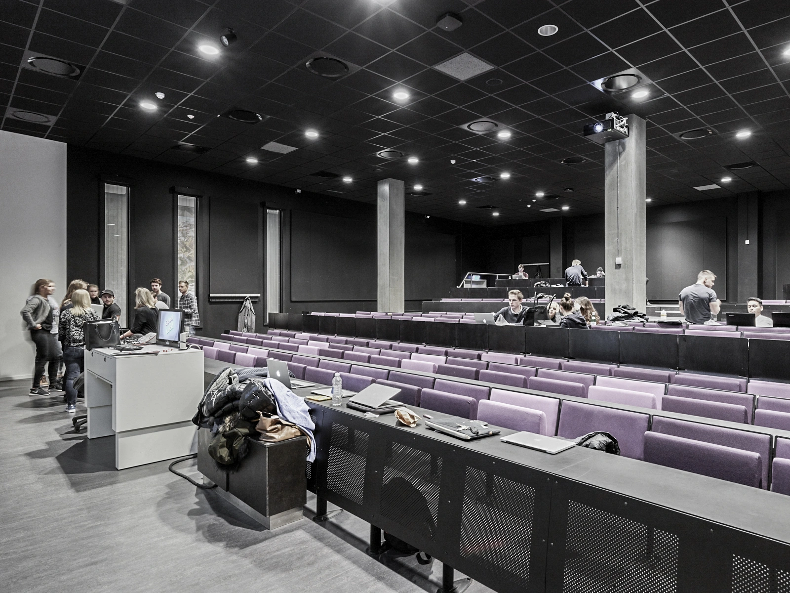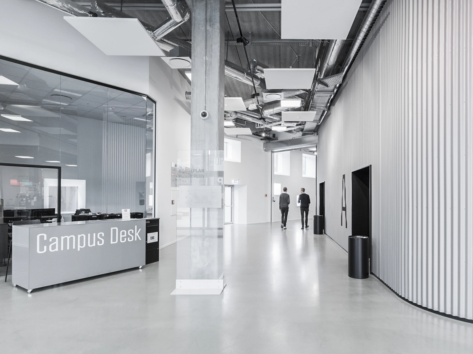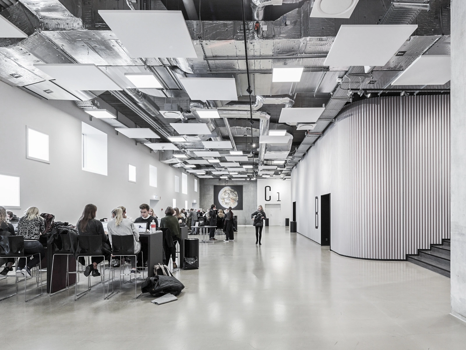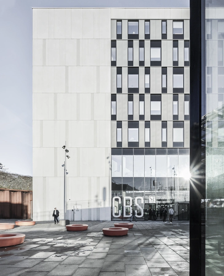 CBS’s department in Flintholm Company House is spread over 2,200m2, and designed for lecture theatres, open study areas, and supplementary facilities such as a student café, a Campus Desk, and a printing room for the students. There is a vibrant atmosphere in the double-height premises, where CBS students occupy the open spaces surrounding the fixed lecture theatre cores. The lecture theatres, behind the corrugated façade cladding, can be subdivided to create three to four rooms and can accommodate up to 600 students. There is a delicate rake inside the lecture theatres, forming a focused setting for lectures and teaching.