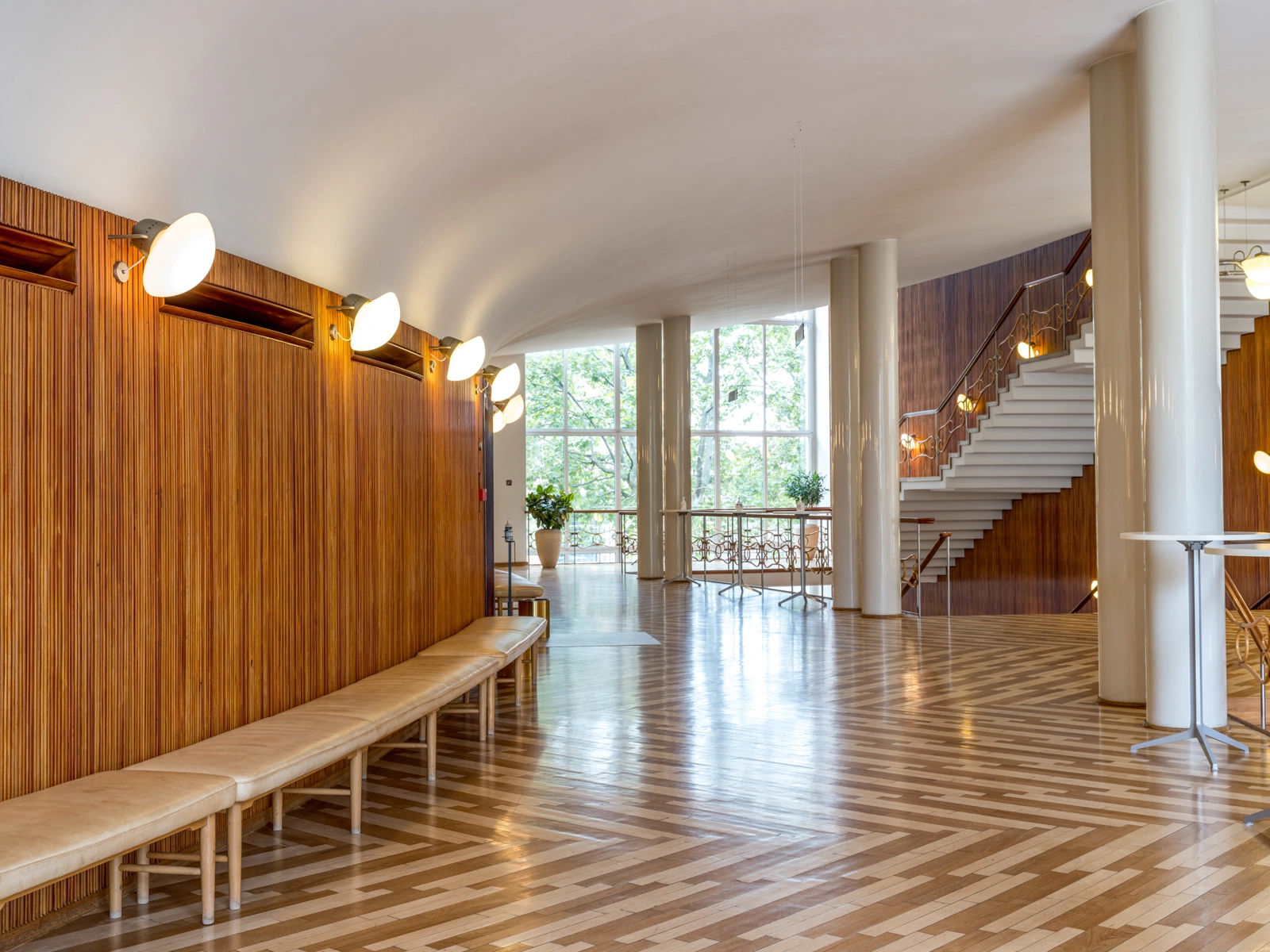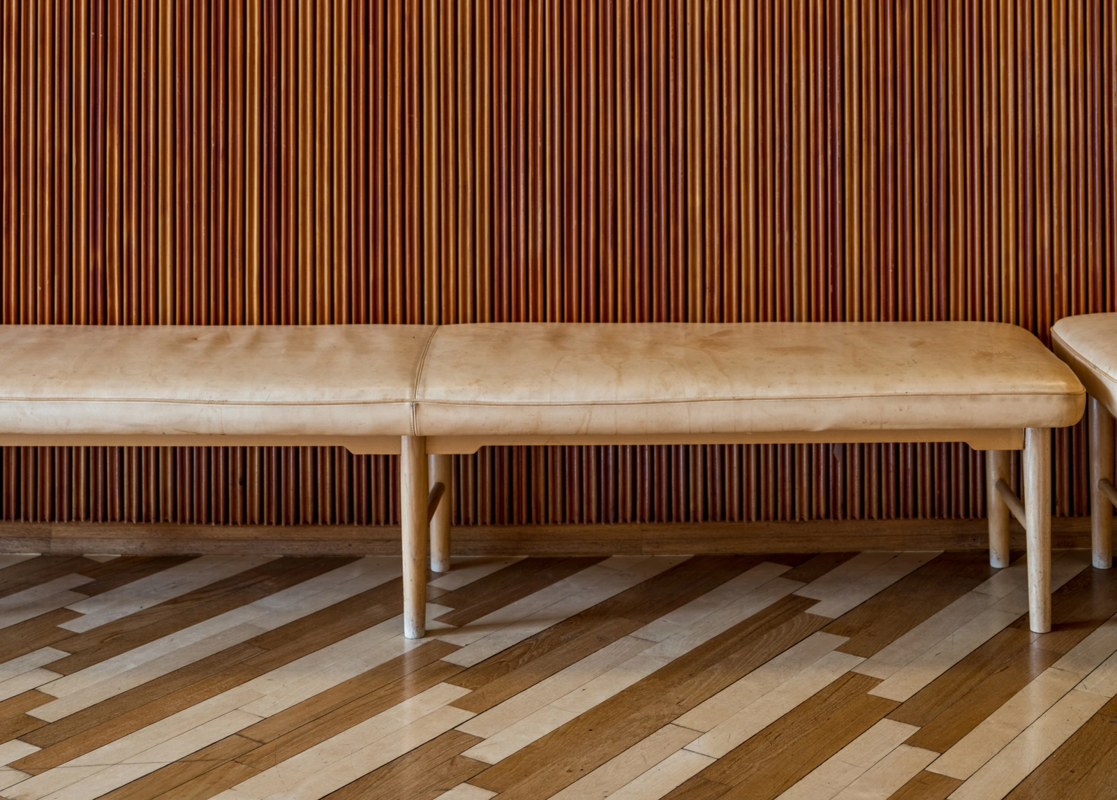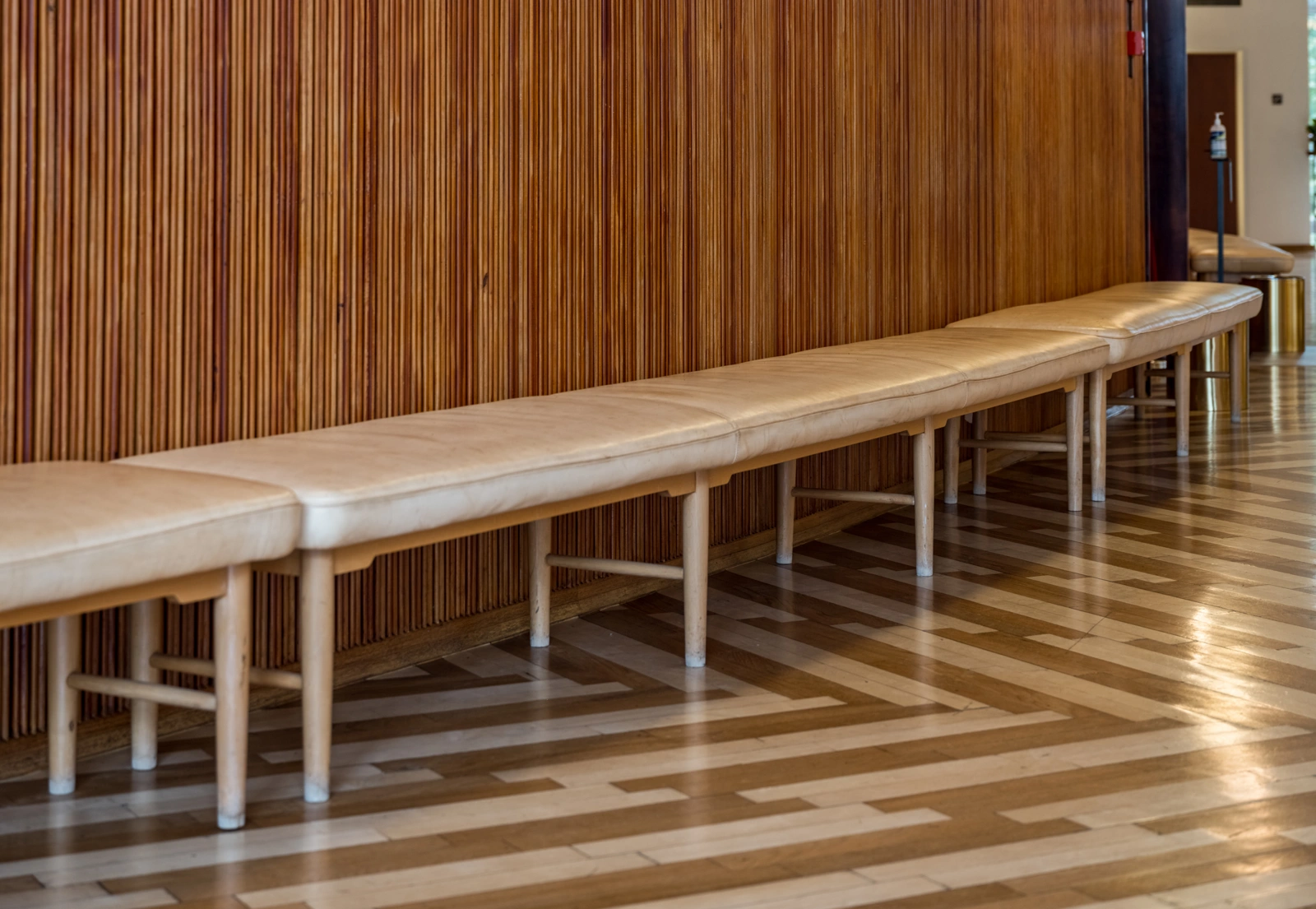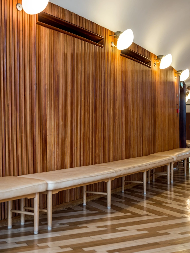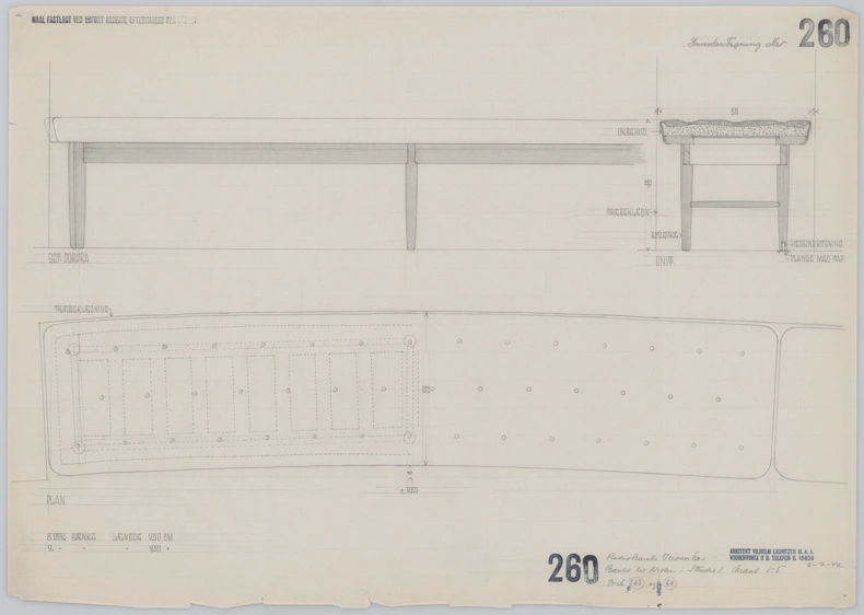 Originally produced in 1945 to be placed alongside the curved wall surrounding the concert hall on the first floor of the Radio House's main building. The bench served as a social meeting place for Radio House's guests as they entered the building. In this way, the furniture remains a prime example of Danish functionalism, where form follows function. This particularly showcases Vilhelm Lauritzen's expertise as a furniture designer and architect.