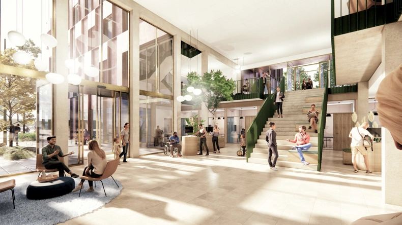 When visitors enter, they are greeted by the heart of the building - the vibrant civic square that autonomously embraces citizens and employees alike. The central continuous staircase acts as a focal point for visitors and is clearly marked with a green semblance. The common staircase creates transparency into the many municipal functions throughout the building and creates a greater interface between departments, whilst also serving as a connection point between employees and citizens.