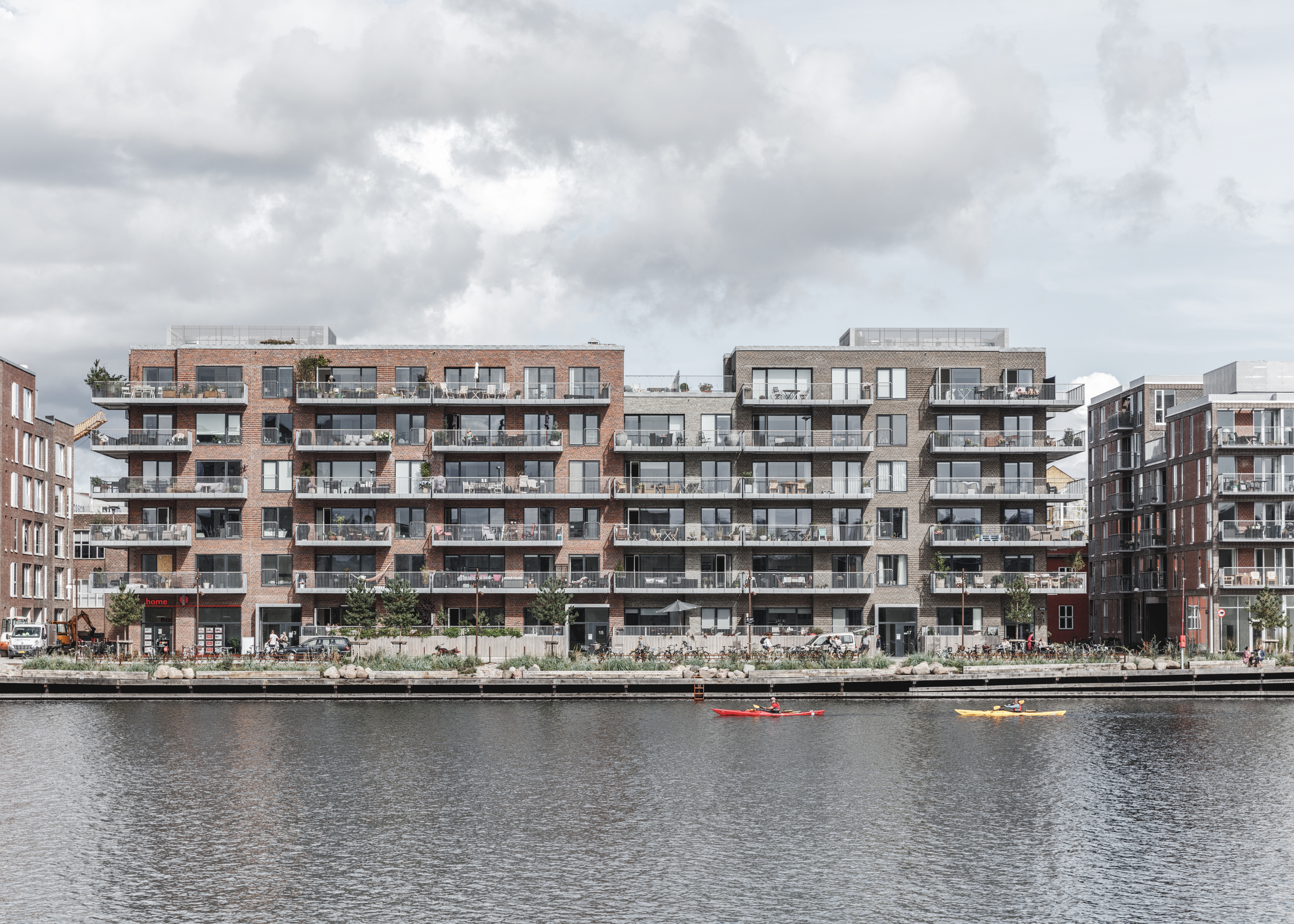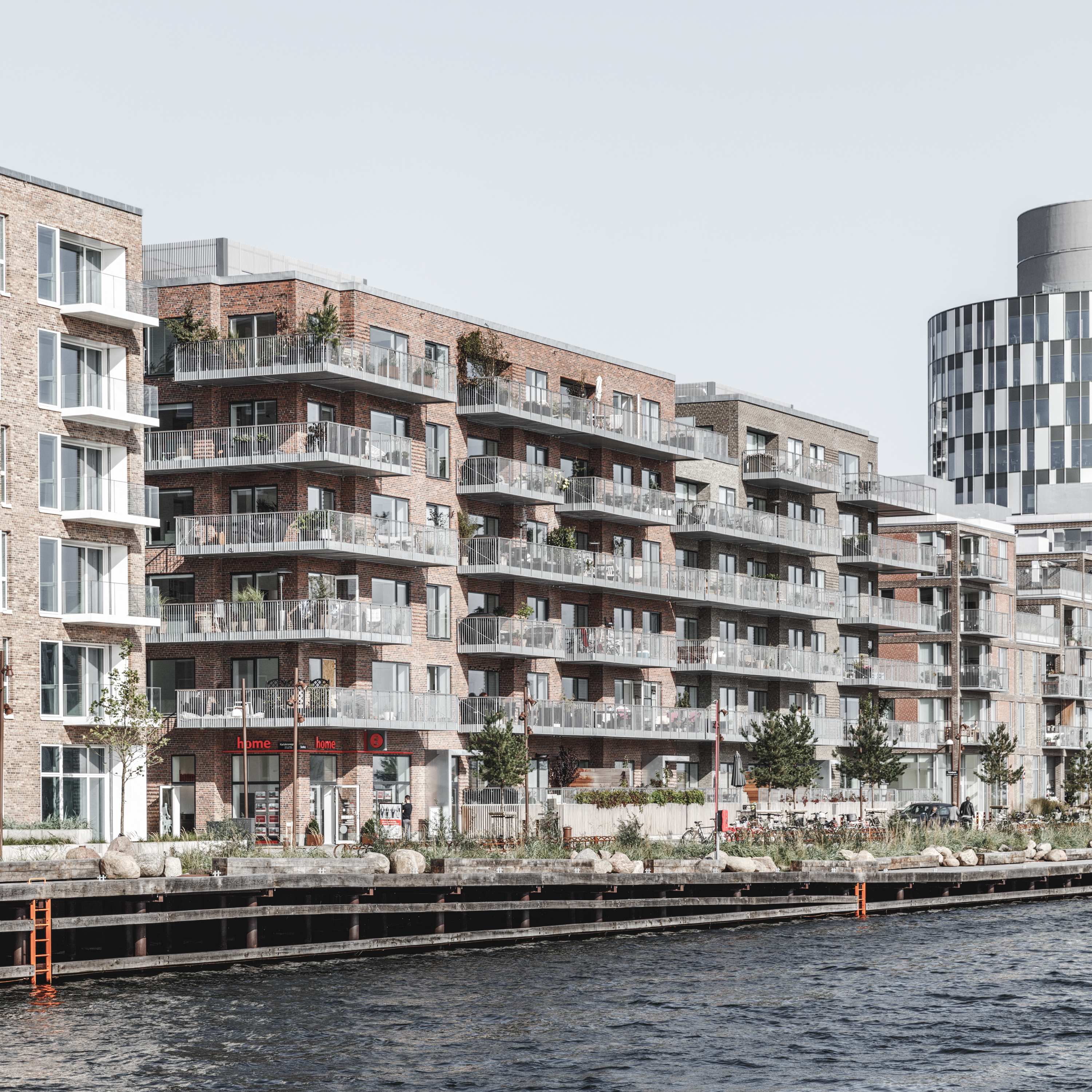 On the south-facing promenade along Sandkaj, there is a row of apartment blocks, many of them with cafés and shops at ground level, creating small, outward-oriented meeting places between the buildings and the harbour basin.