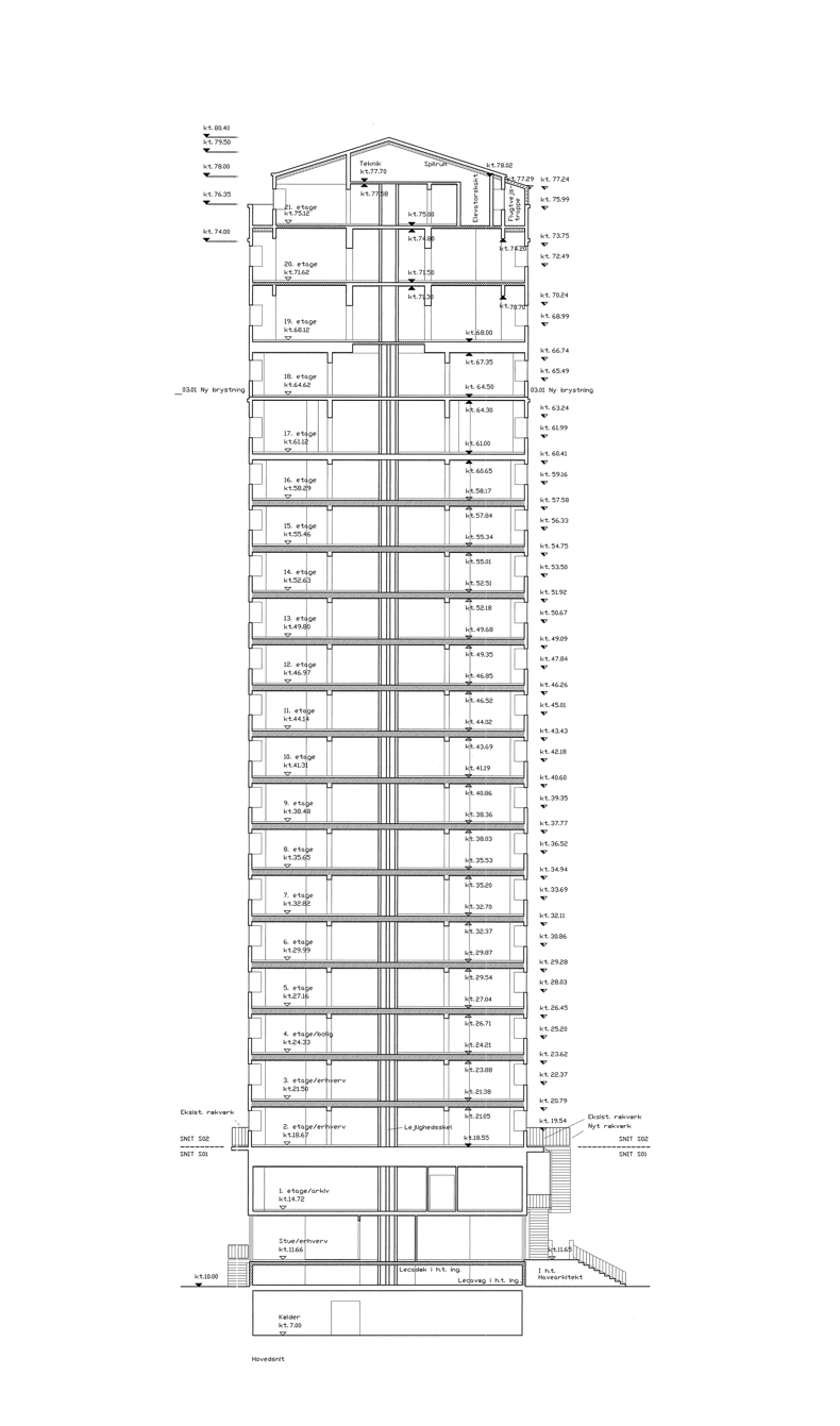 The 65 metre high silo building from 1957 was renovated and converted into a 22-storey residential tower. At the same time, the former white beer brewery Kongens Bryghus was converted from industrial use to 89 apartments and 3000 m² of commercial space.