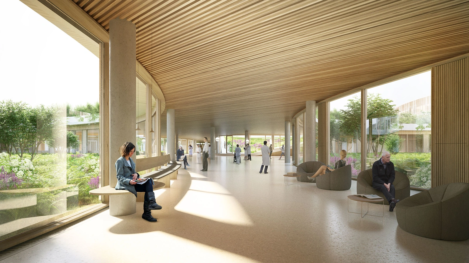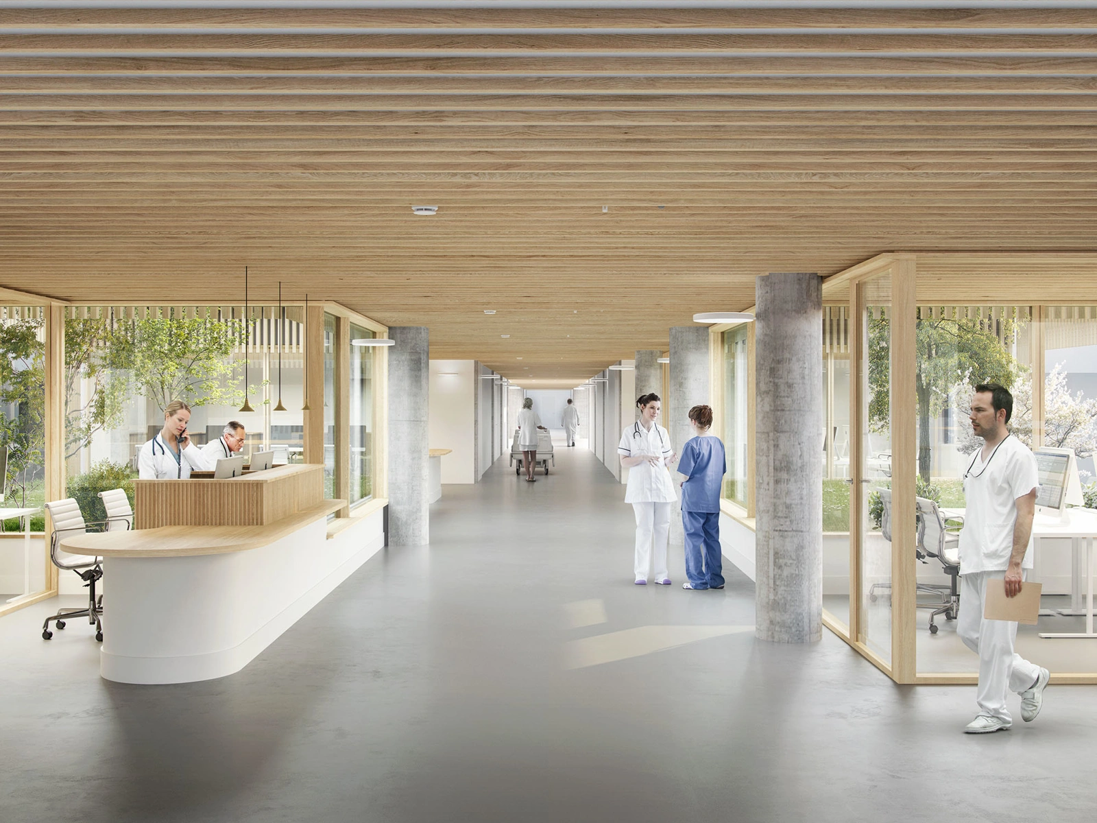 Hence, all rooms are single rooms that allow patients to experience less stress and an expected faster recovery. Similarly, wood is a recurring element in the hospital’s interior and facade. The soft shapes, daylight and view of the inner green garden create a more homely atmosphere and feeling, where nature is always present. Despite its monumental area of 118,000 square meters, the building and its organic shapes have been scaled to fit humans. In harmony with the surrounding natural landscape, it will offer homeliness and a sense of safety to everyone who visits the hospital.