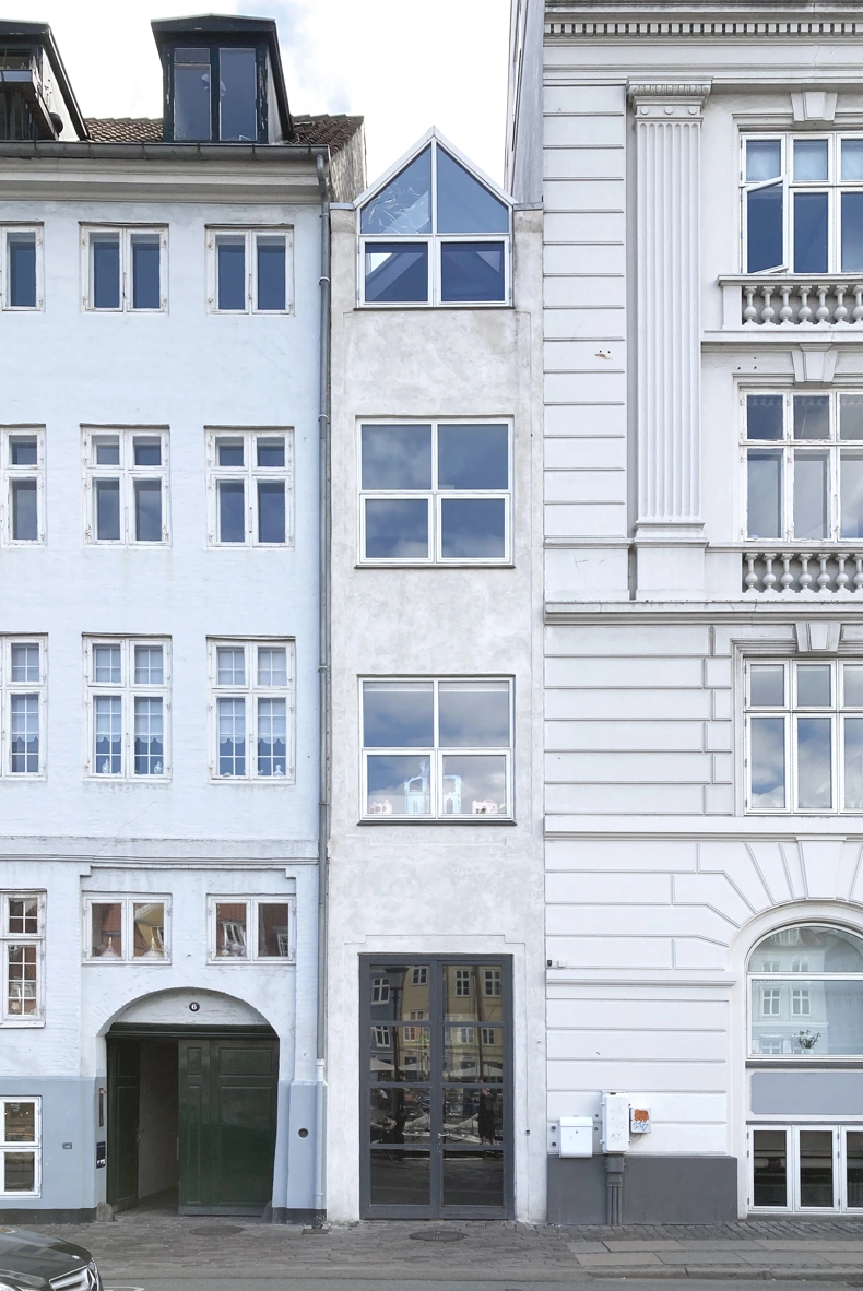 The narrow house connects to the corner house, Heibergsgade 18, creating a new entrance with a entrance from Nyhavn. The construction of the house ensured an established staircase from the gatehouse to the ground floor of the existing house.