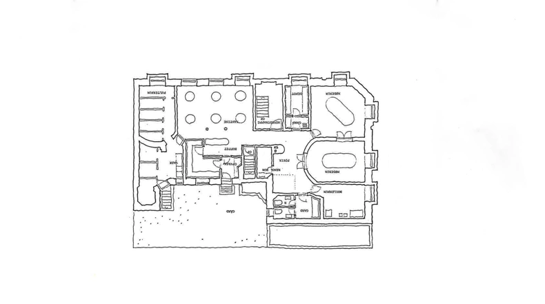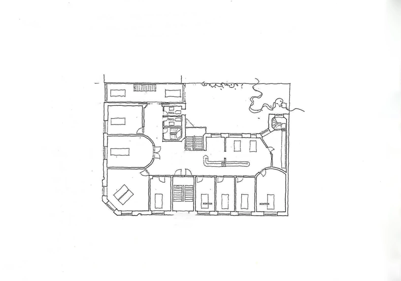 The middle building is made of plastered brickwork and the window and door sections are made of slender steel profiles. The floor separation and stairs are made of in-situ cast concrete, which is covered with carpeting. The floor on the ground floor is made of gray granite tiles.