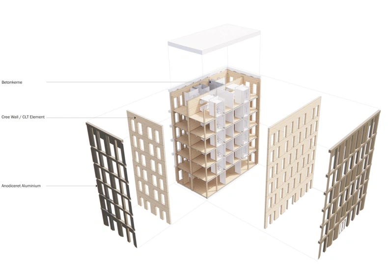 The construction of the tall building will be faster, cheaper and with a smaller CO2 footprint than with a similar building built in concrete. The supporting structure is made in a new modular system from Austrian CREE, called Life Cycle Tower. The modular system is based on prefabricated hybrid elements that combine wood and concrete. The building system allows you to build up to 30 floors.