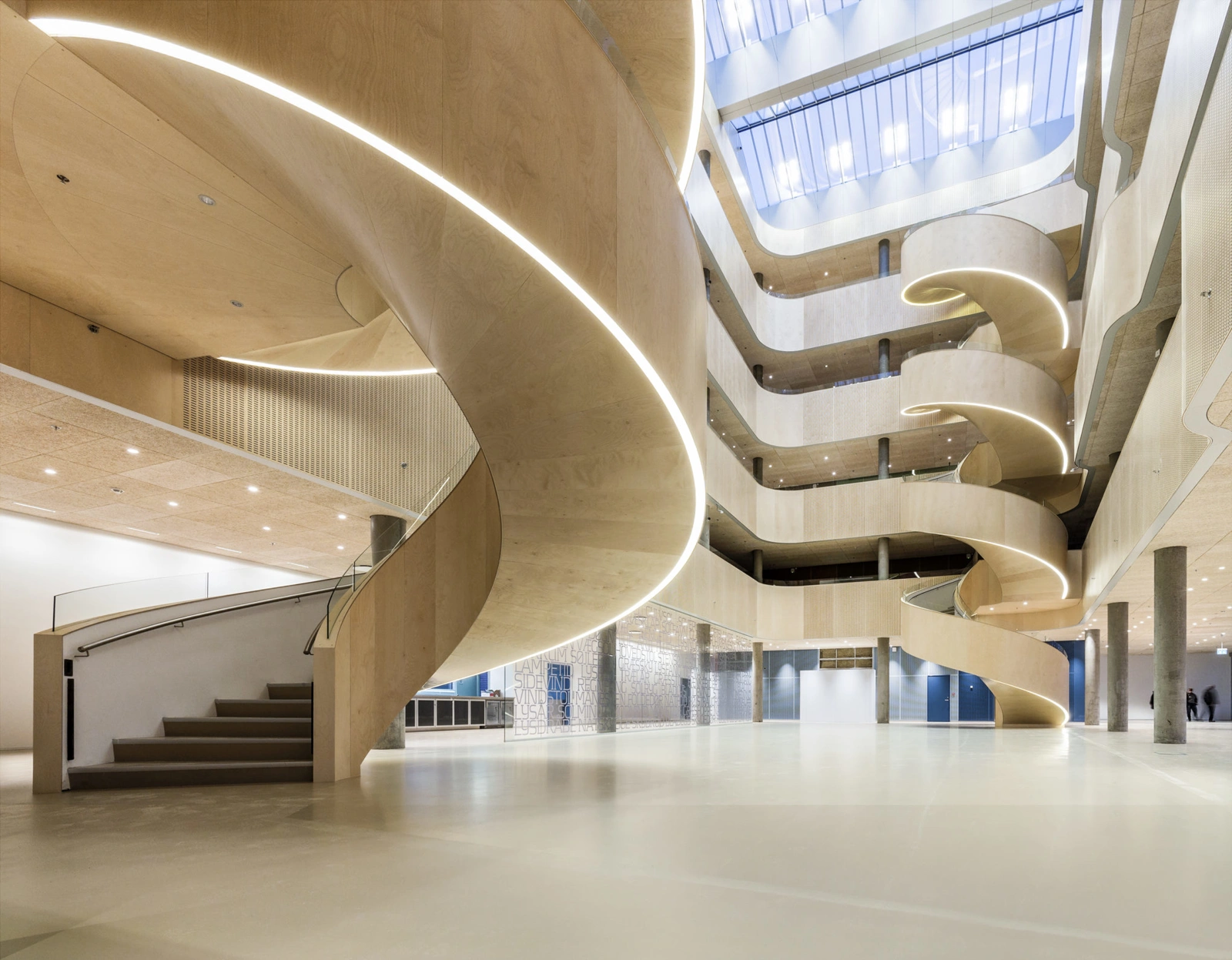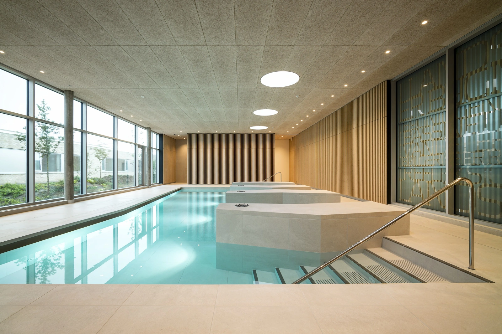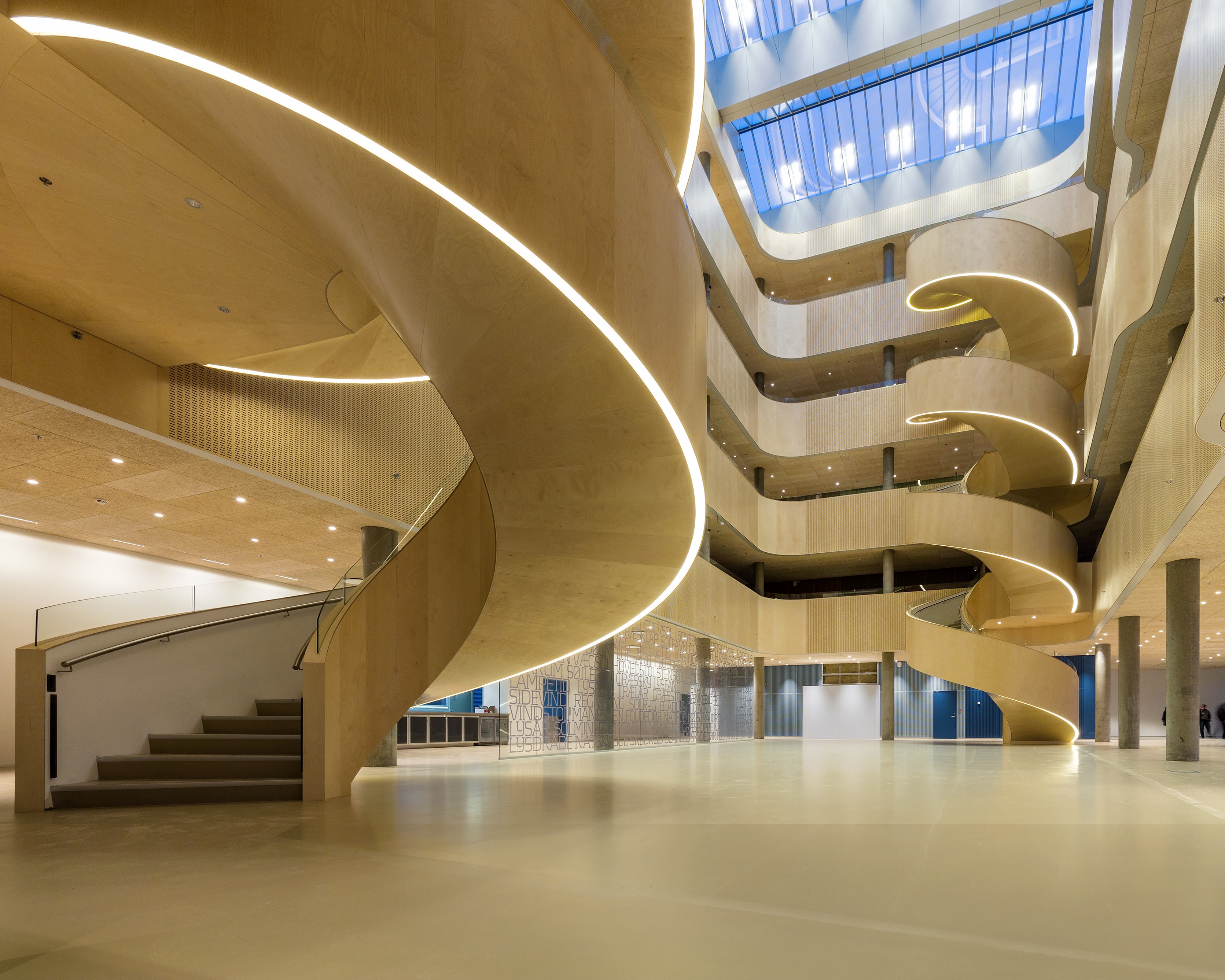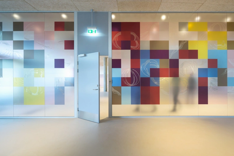 Colours influence people, and the colour scheme is therefore carefully selected to create a sense of safety for patients. The palette of soft, muted tones is composed by visual artist Malene Landgreen, and complemented by poetry of writer Ursula Andkjær Olsen, it adorns the walls throughout the building. The words and phrases are centred around the tangible surroundings – the light, the gardens and the architecture itself – and the metres of poetry help anchor patients in the environment they are in. At the same time, the artwork on glass walls provides varying degrees of covering, required in different settings.