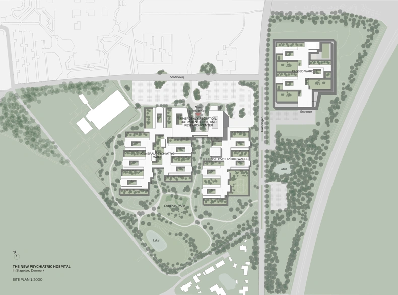 Situated in green surroundings close to the somatic hospital, Slagelse Psychiatric Hospital forms, together with the somatic hospital located close by, a new integrated health campus. At 44,000 m2, it is the largest psychiatric building project in recent times and accommodates194 beds: 114 in general psychiatry, 50 in forensic psychiatry, and 30 in the Secure Unit.