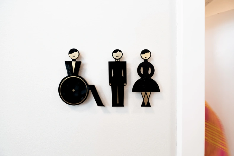 Former men’s lavatories have been converted into unisex facilities, with the sinks placed where the urinals once were, making use of the existing pipework. In addition, accessibility toilets have been added on all floors, with supplementary signage designed to match the existing style.