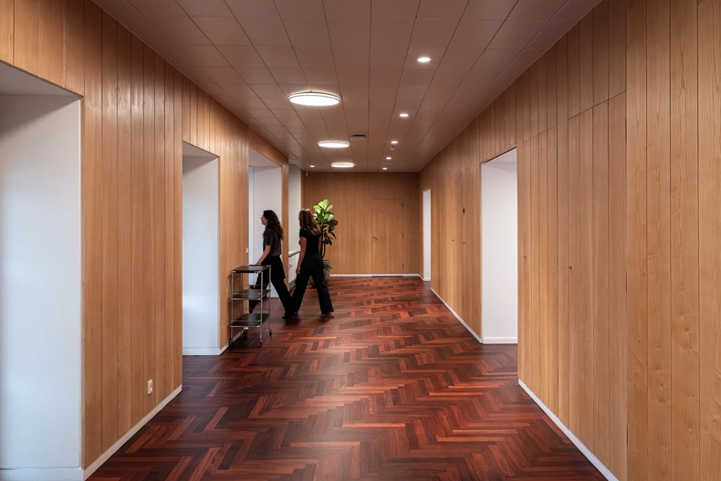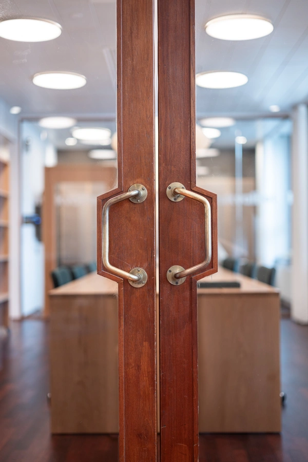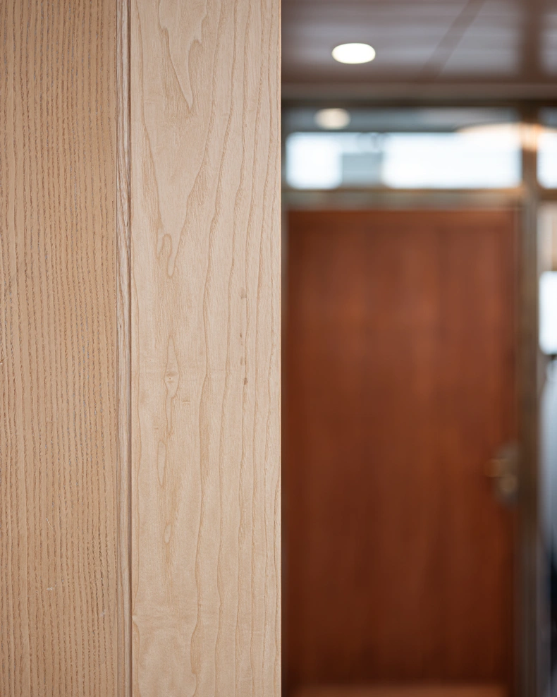 One of the most extensive interventions was the opening of a passage through a load-bearing wall, creating a connection to a previously overlooked area that now serves as an open co-working space with meeting rooms. This area retains an authentic character, with original double doors – once stored in the basement – set in a bespoke timber frame stained to match the restored teak. Likewise, the double doors leading to new meeting rooms on the third floor were created by adapting two earlier single doors for reinstatement in a new setting.