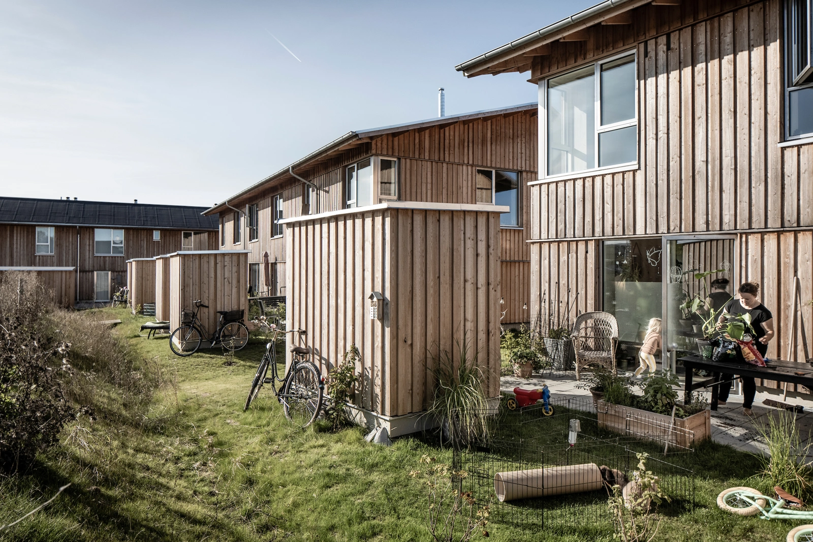 You arrive in the middle of each garden space, and if you arrive by car, the car is parked centrally, so that the areas around the buildings are kept clear for walkways, gardens and recreational zones for playing and socialising.