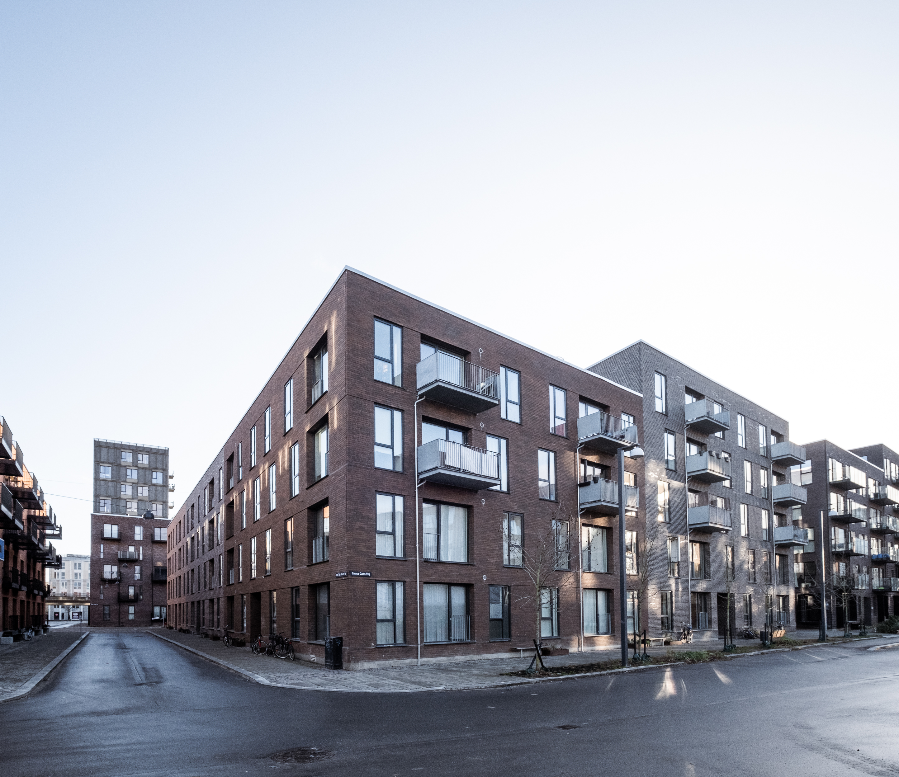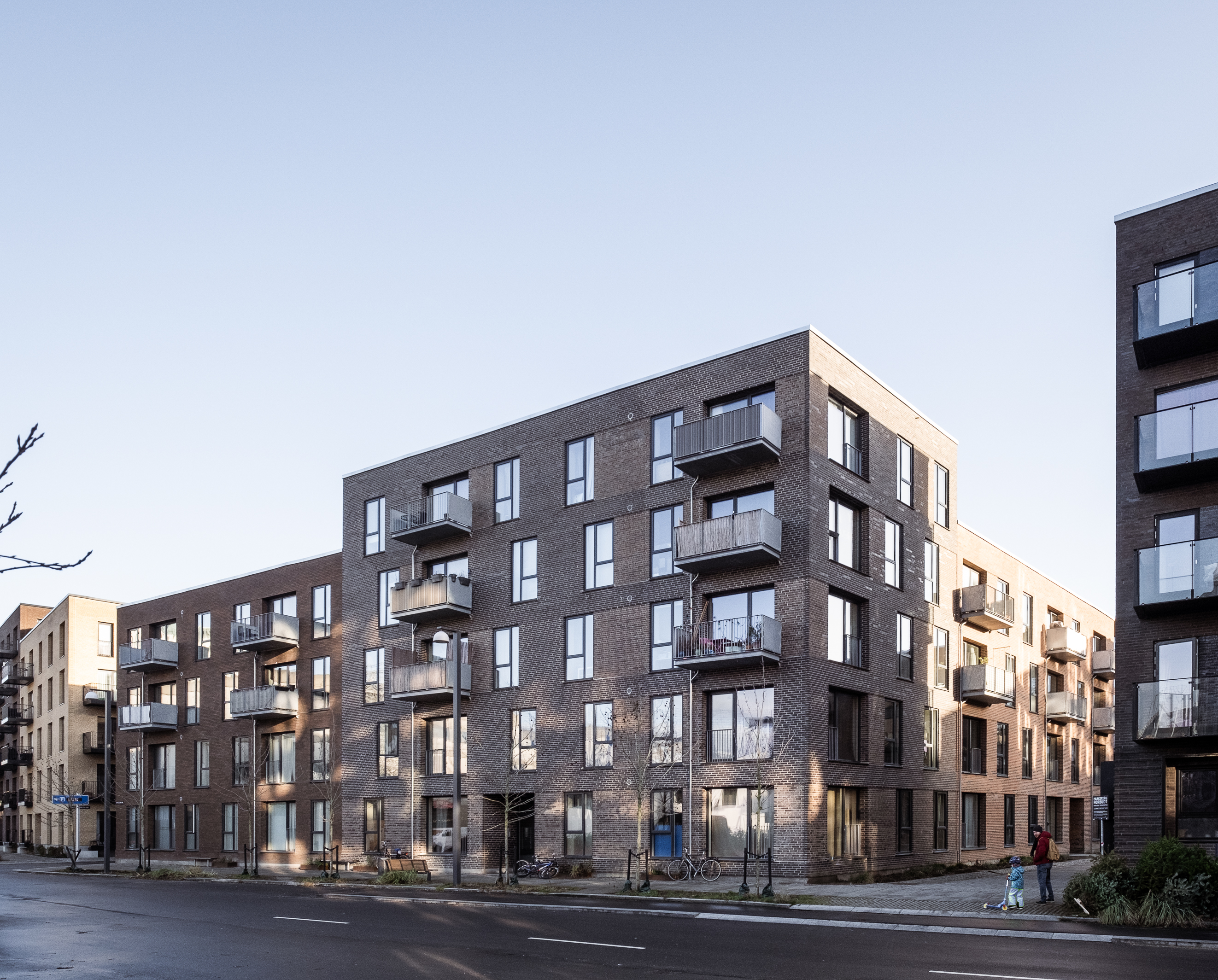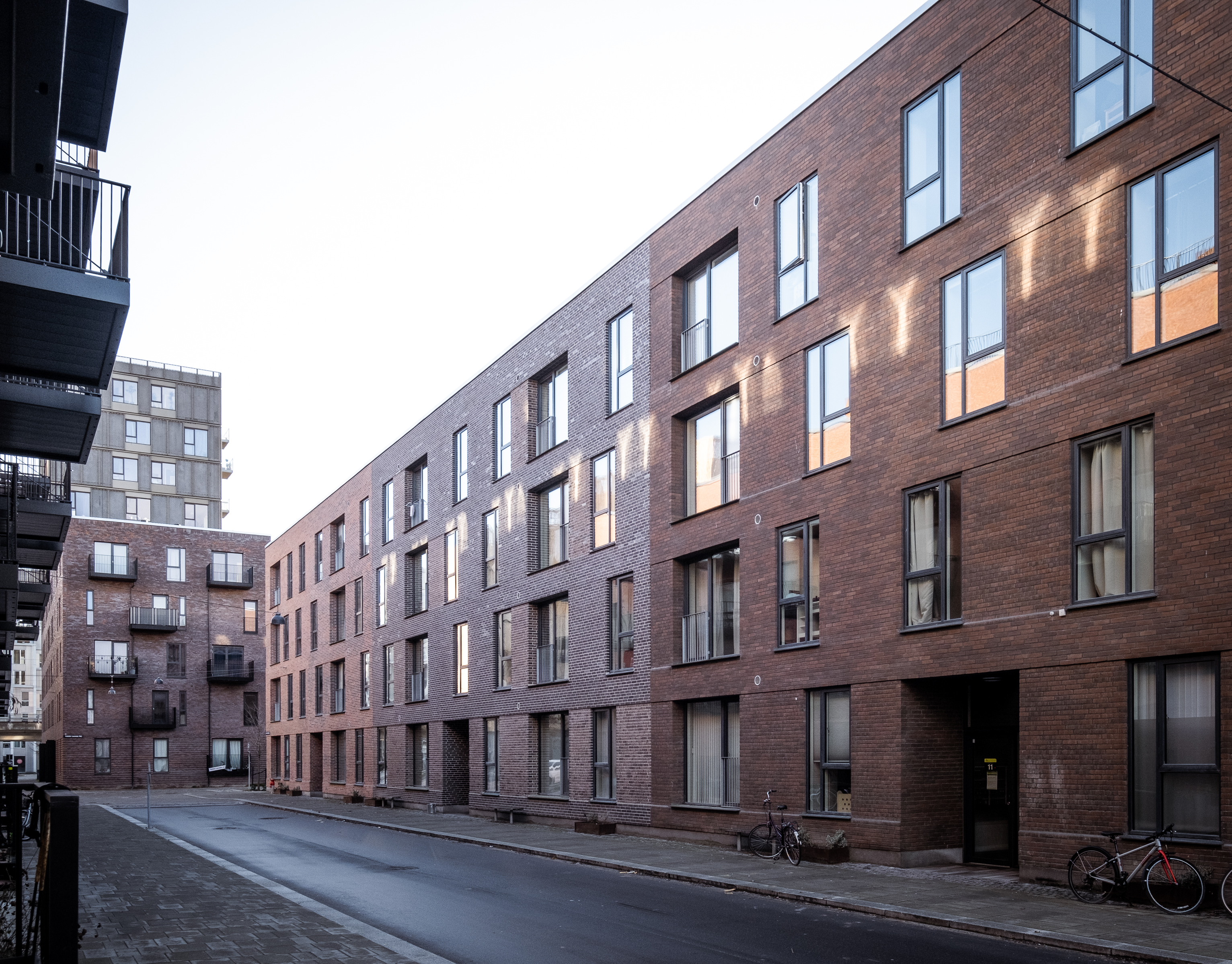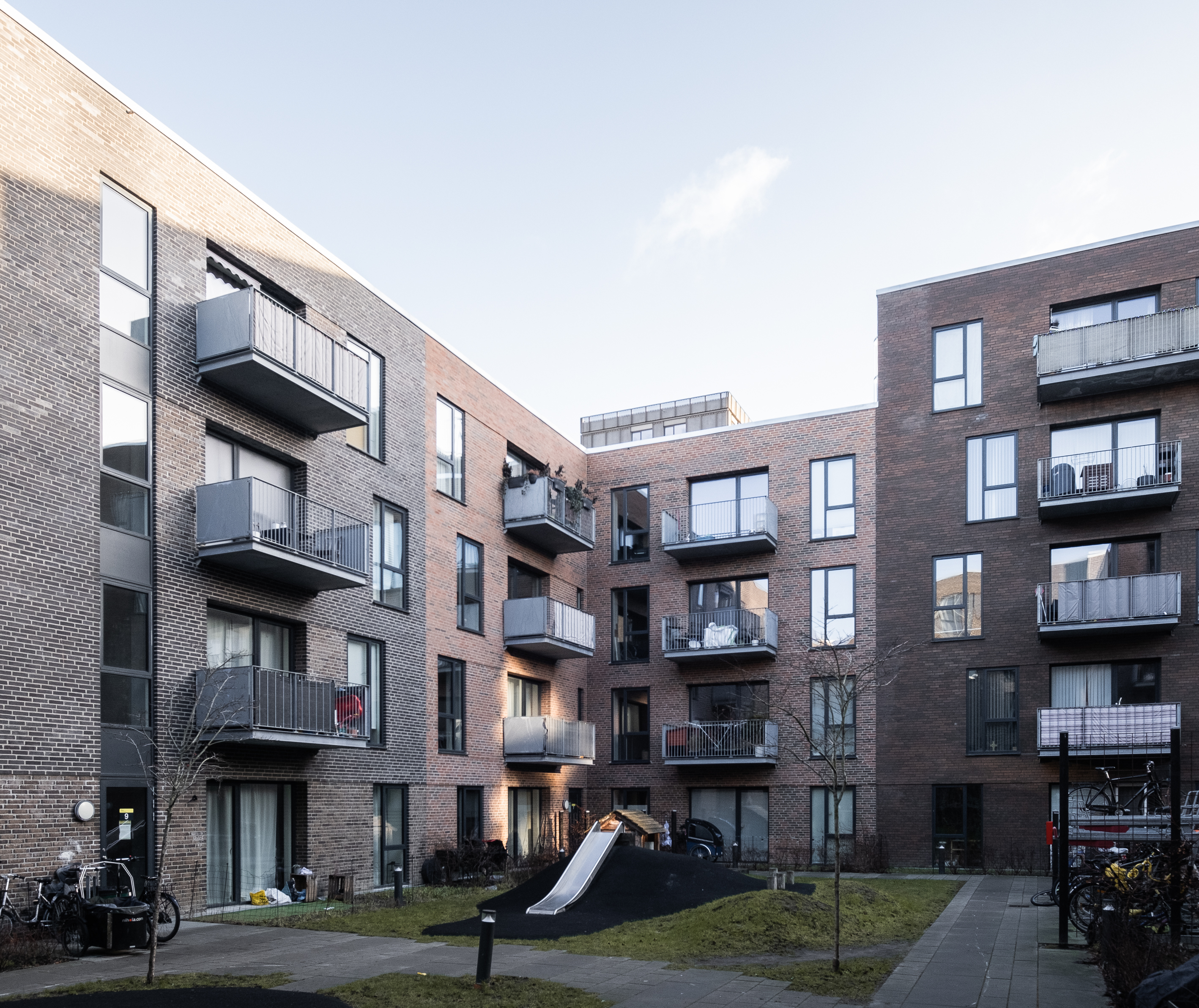 The building is divided into 2 units that lie around a courtyard. The building heights vary from 4-6 storeys and help to create optimal light conditions in the courtyard. The buildings consist of an angled residential pole and a solitary point house in line with the local plan.