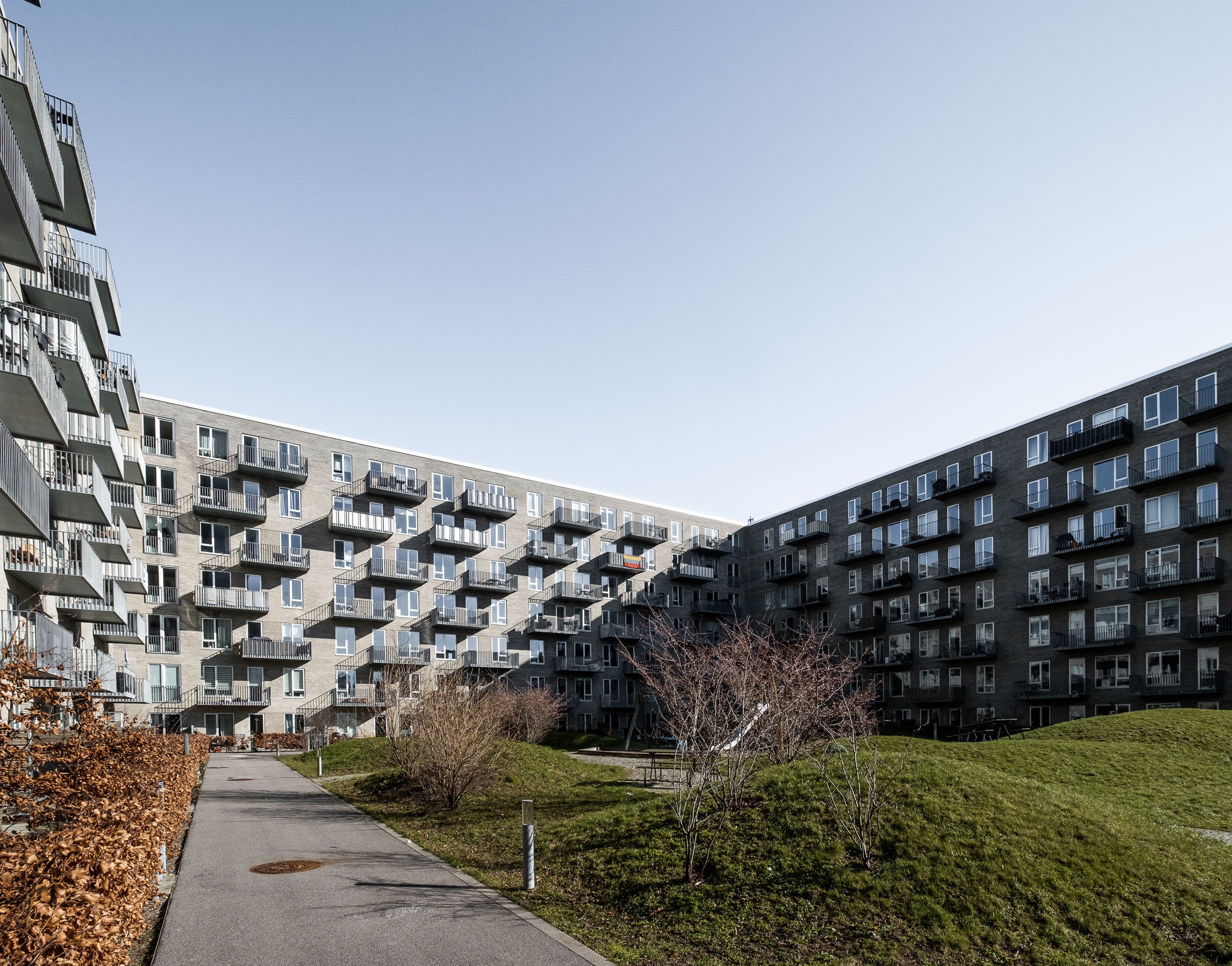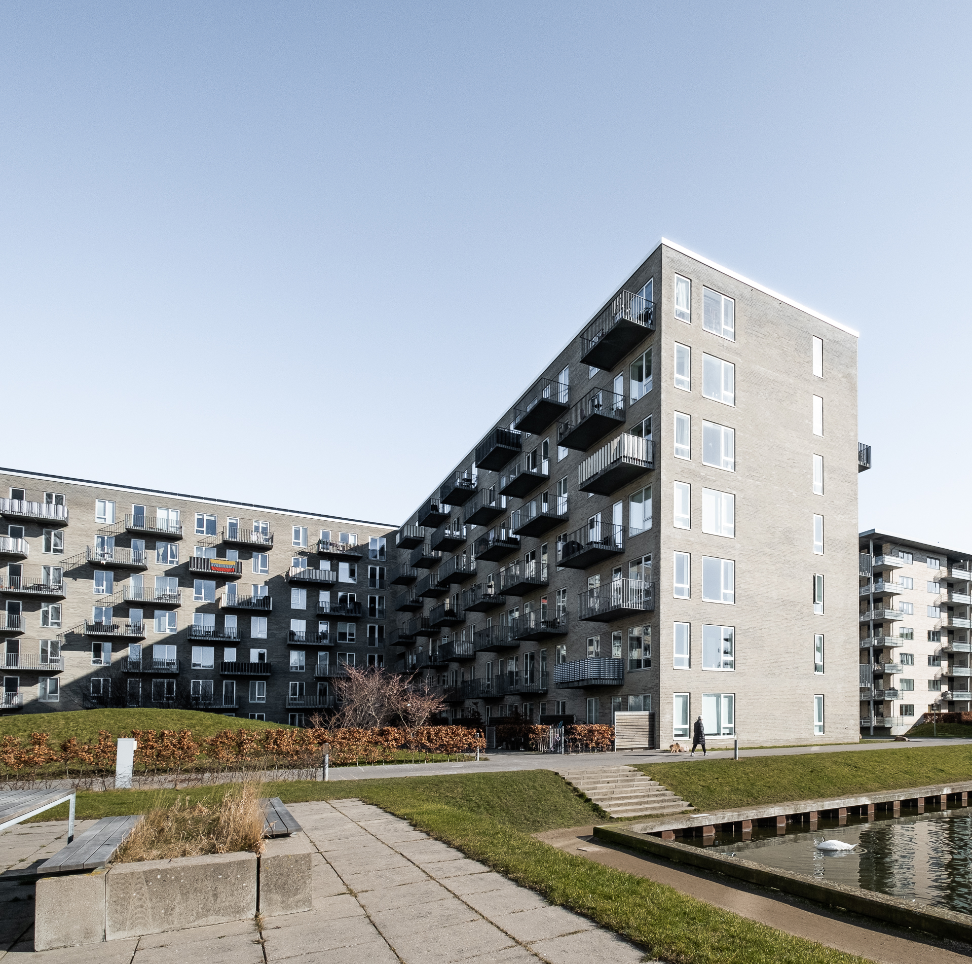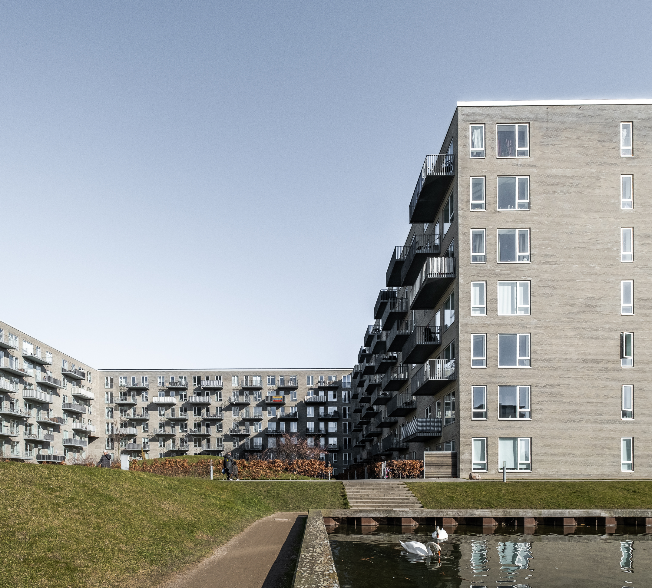 The orientation towards the lake creates a very bright courtyard with large sunny and green areas. There is shelter and plenty of opportunities for play and relaxation. The sun reflects off the water and sends a beautiful play of light up the facades and into the individual homes. Combined with the private balconies and terraces, the courtyard ensures that residents have easy access to several different types of outdoor spaces.