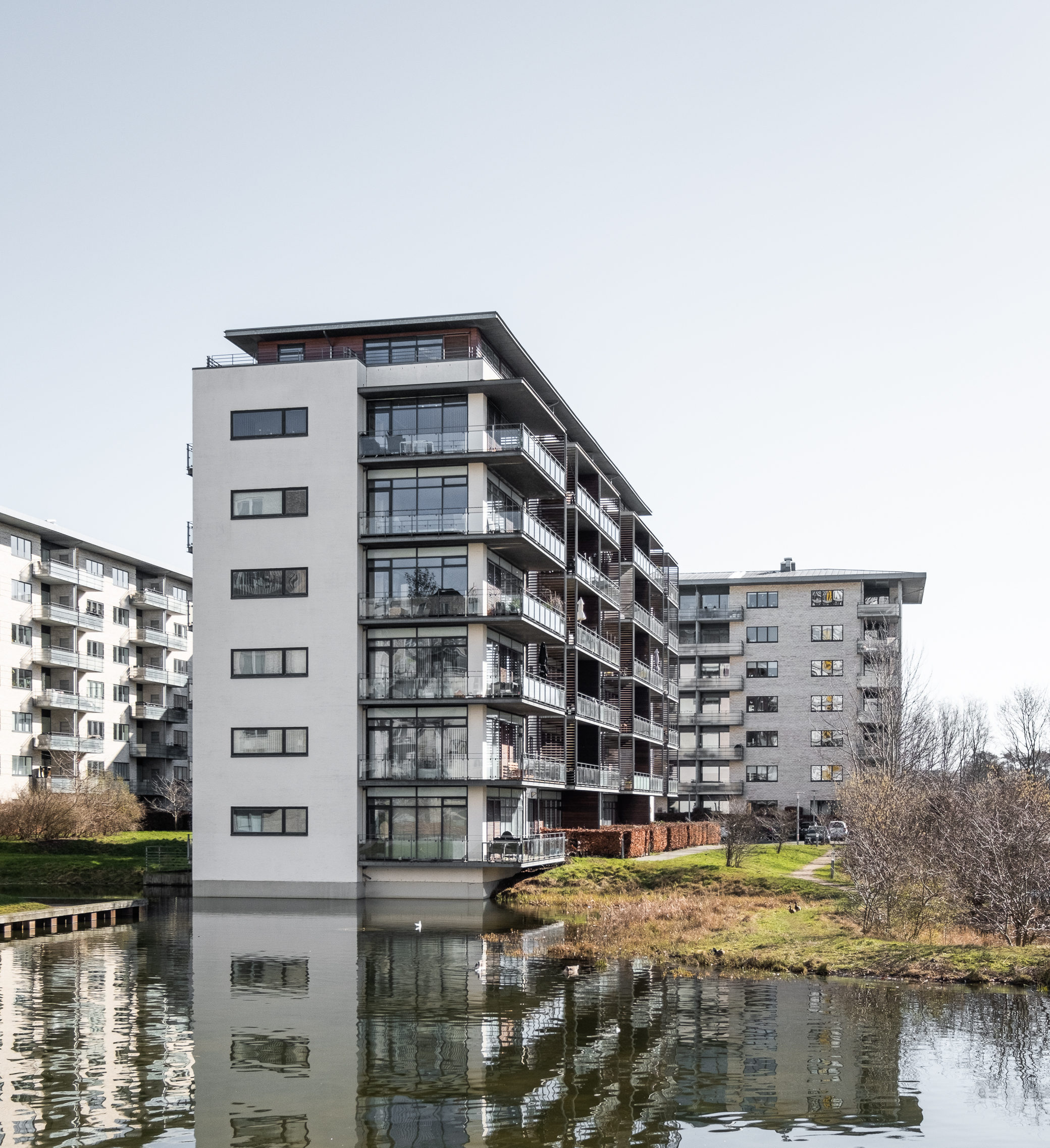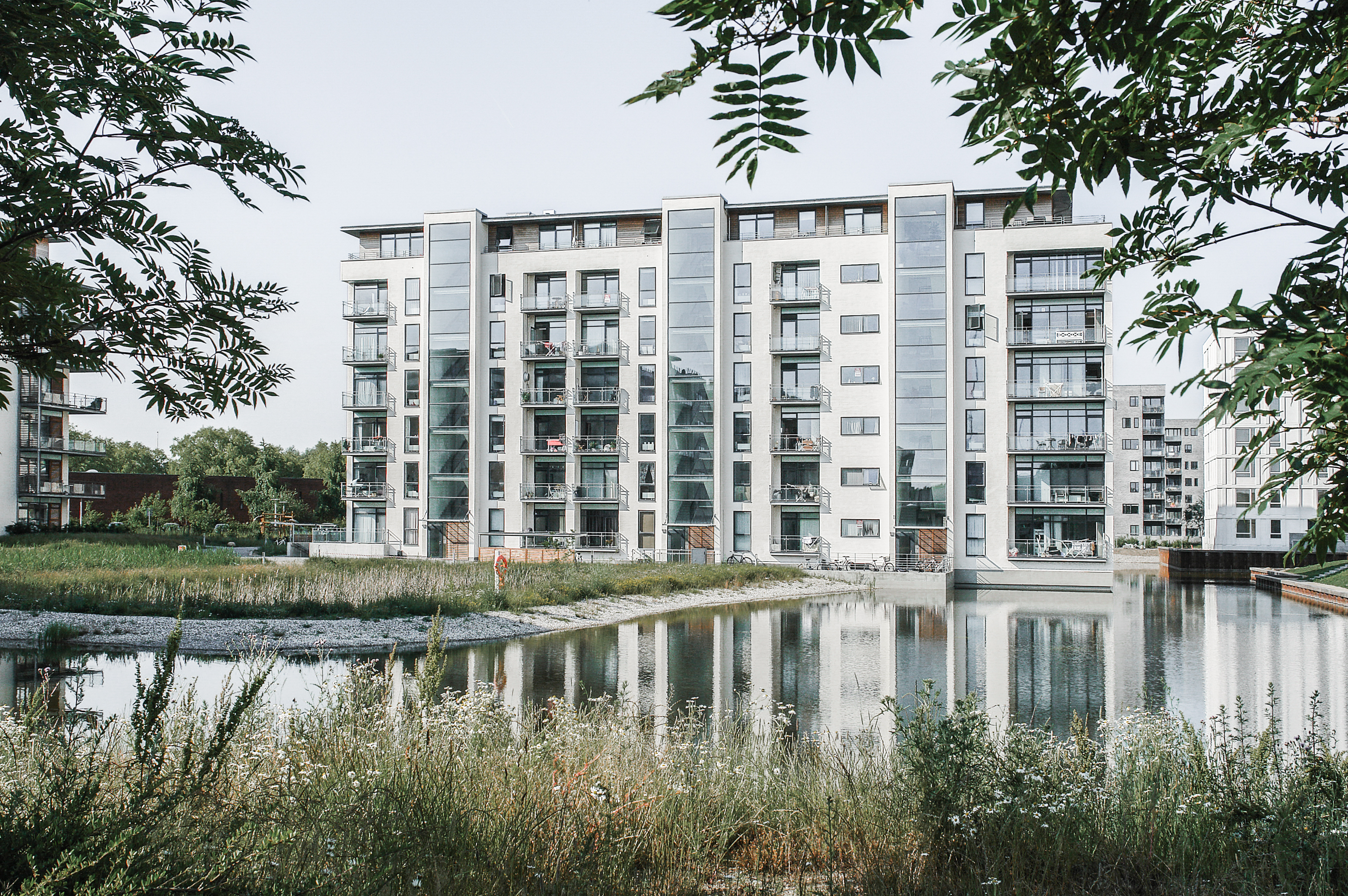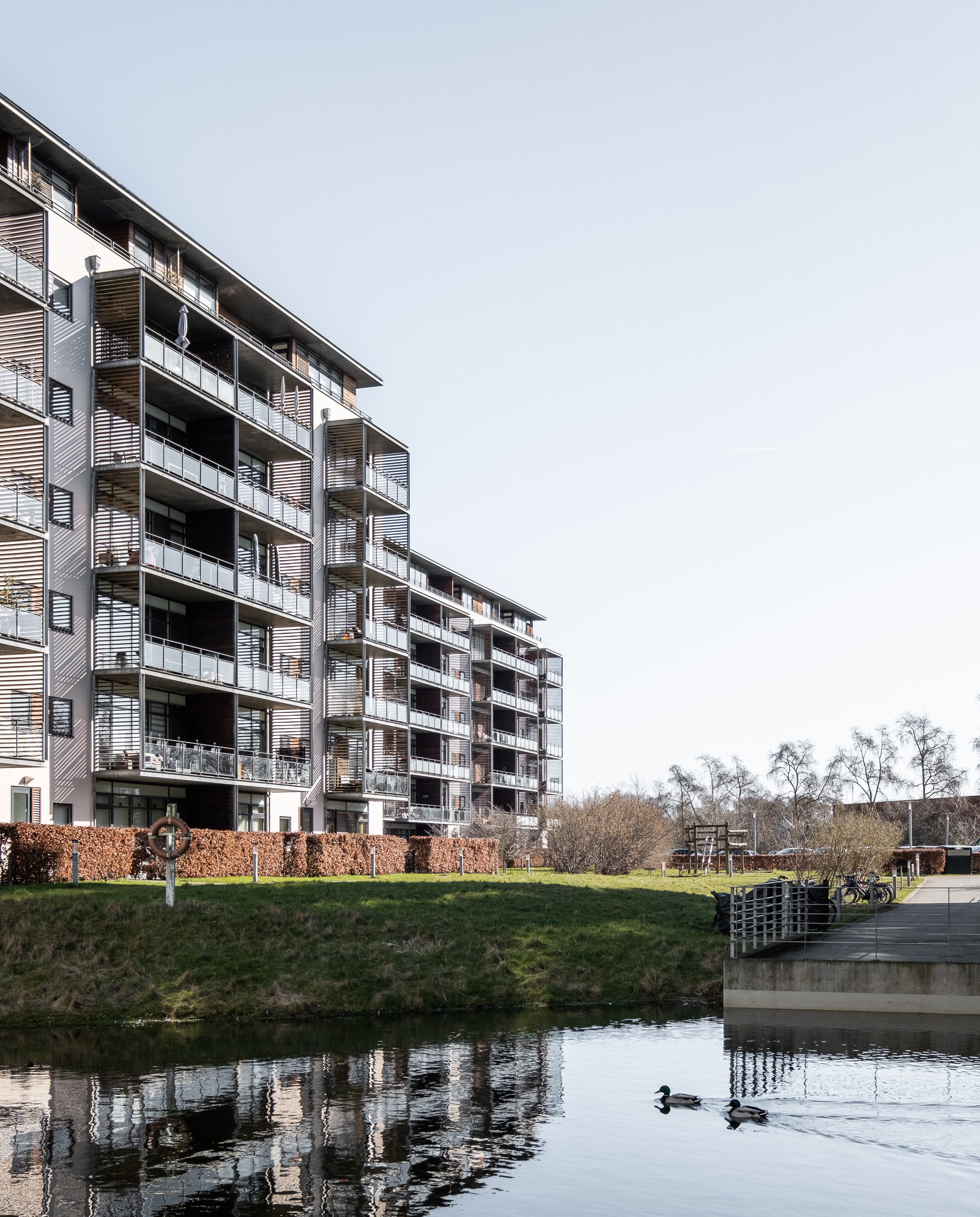 Søterrasserne is a part of Søborg. The dwellings comprise four, north-south-facing blocks on the banks of the lake. The four housing blocks are gently anchored in the landscape.