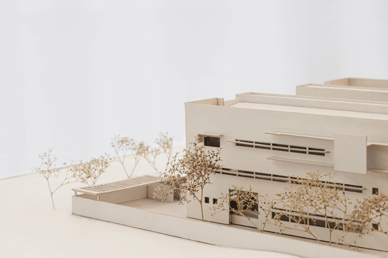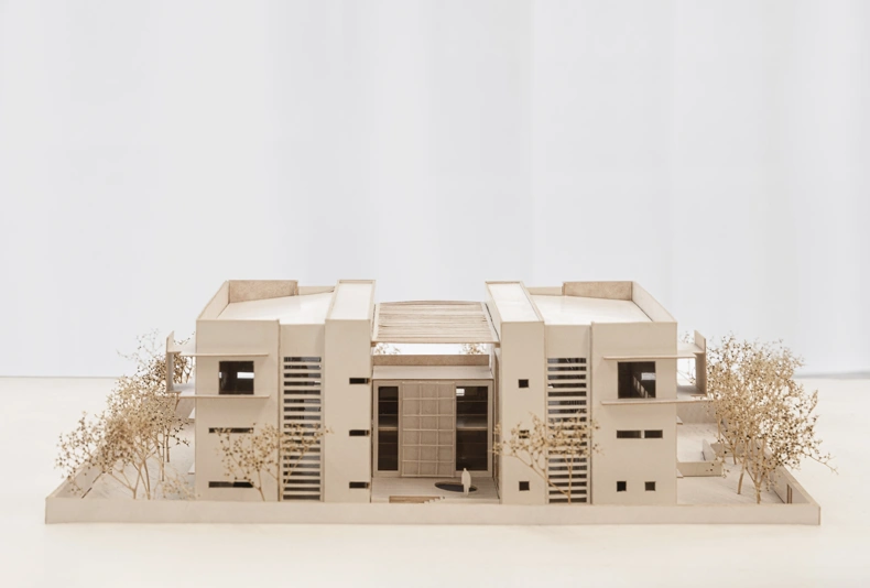 The embassy appears as a streamlined monolith, subdivided into two independent representations with a common building in between. A roof-height steel pergola underpins the concept of an overall entity and the joint facilities that the users share: the library, meeting rooms, the canteen, and the kitchen. In materiality, volume and window proportions, the building relates to the local climate.