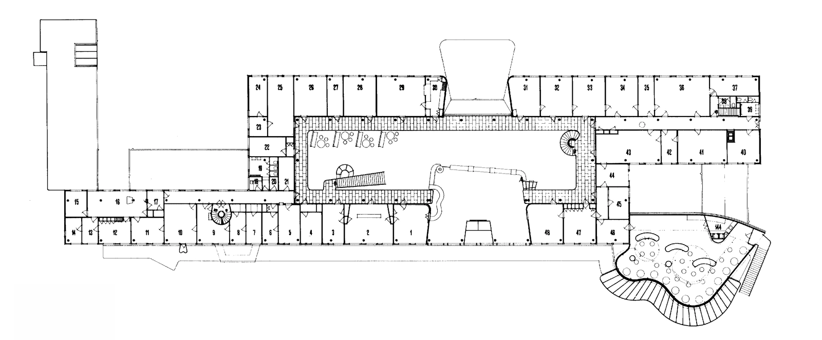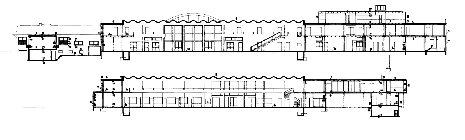The entrance and exit to the runways are located in one-third of the terminal at one end, lending a sense of gravity to the busiest end of the concourse. The restaurant’s double-curved façade shape is an element that frequently occurs in Lauritzen’s architecture and that of other architects of the time. It can be regarded as a loan from Cubist painters such as Picasso and Braque, whose pictures often feature the outlines of guitars.