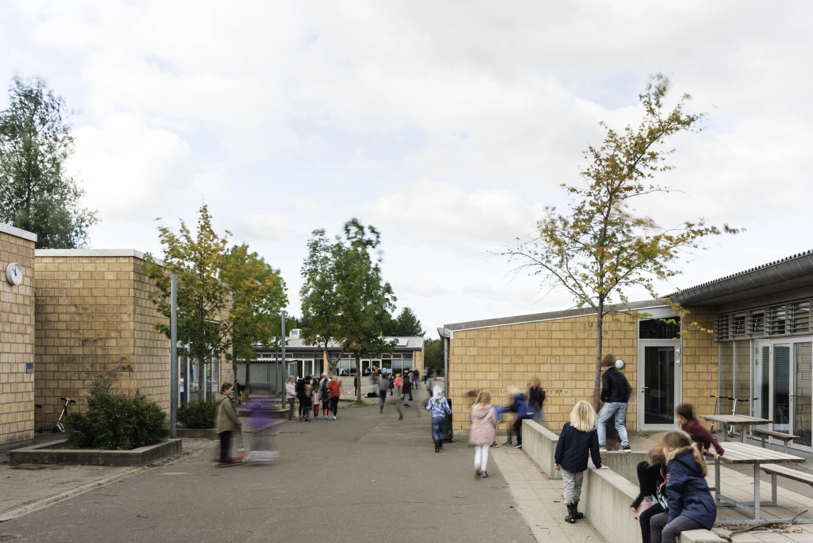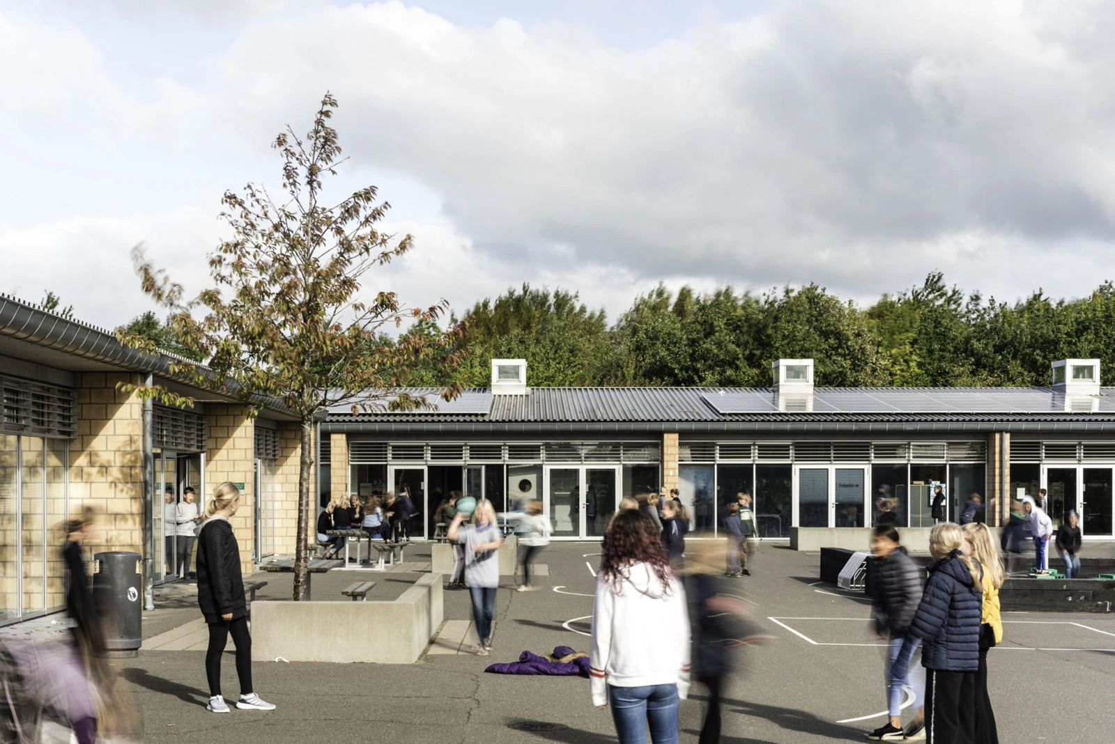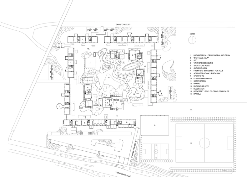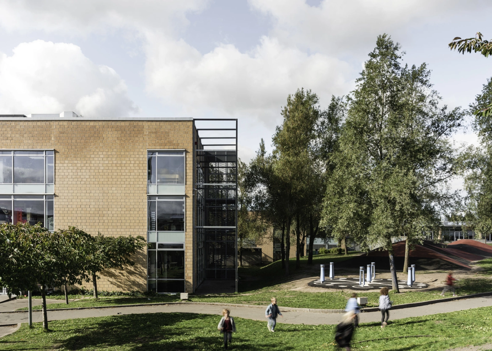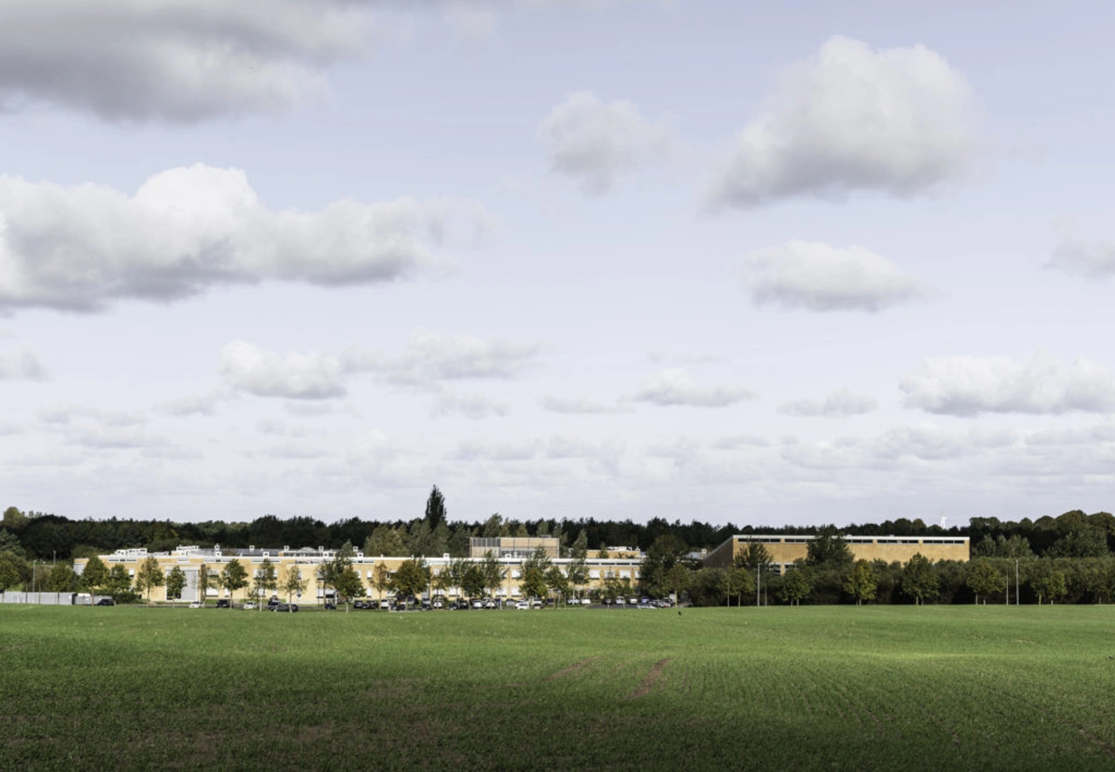 The school is situated in a hilly landscape with four surrounding wing houses, containing the ‘home areas’ for tutoring. The remaining school programs are placed centrally in the school. Here you have the school kitchen, workshop, SFO, auditoriums, football pitch, and many others. In this way, the seasons and the landscape become an integrated part of the education.