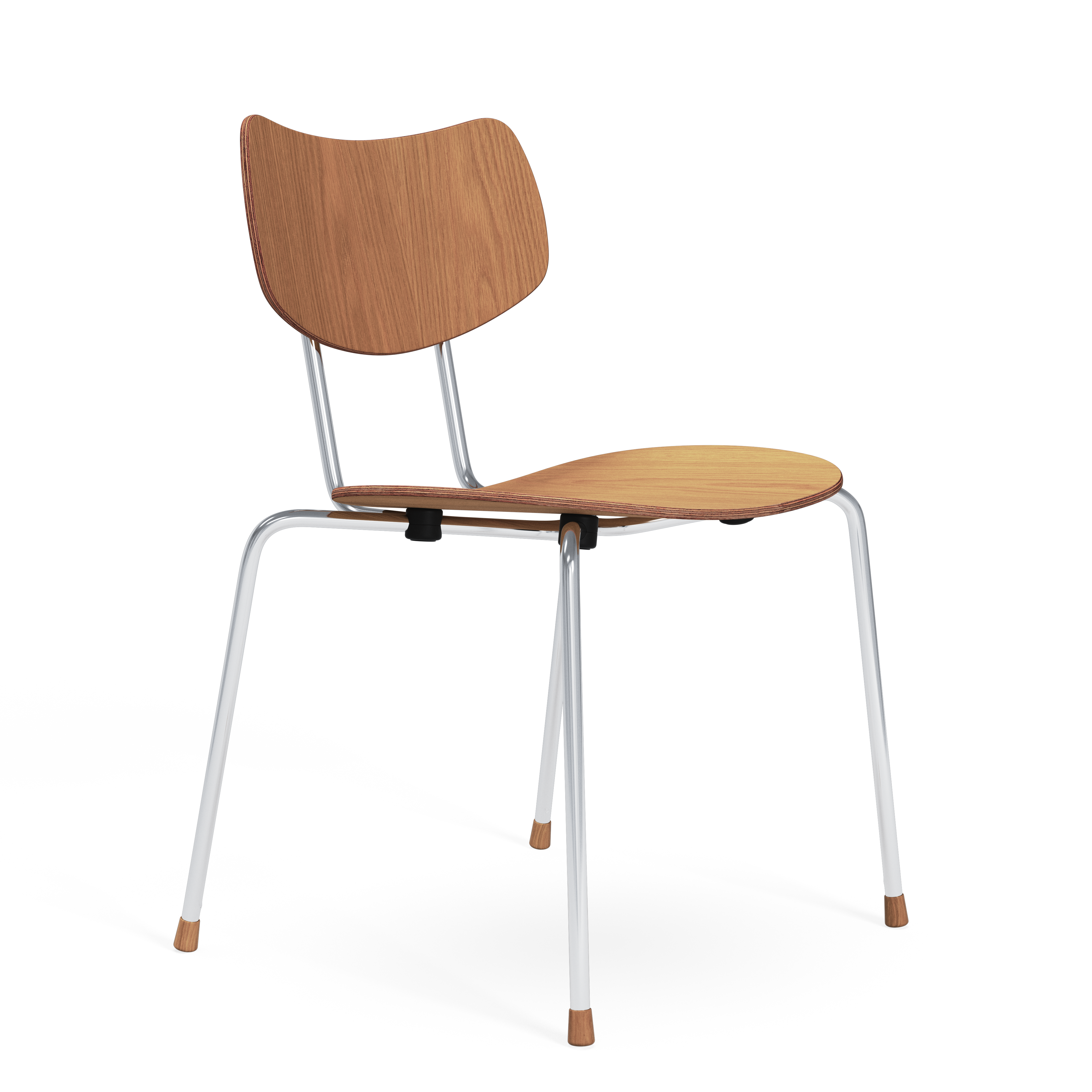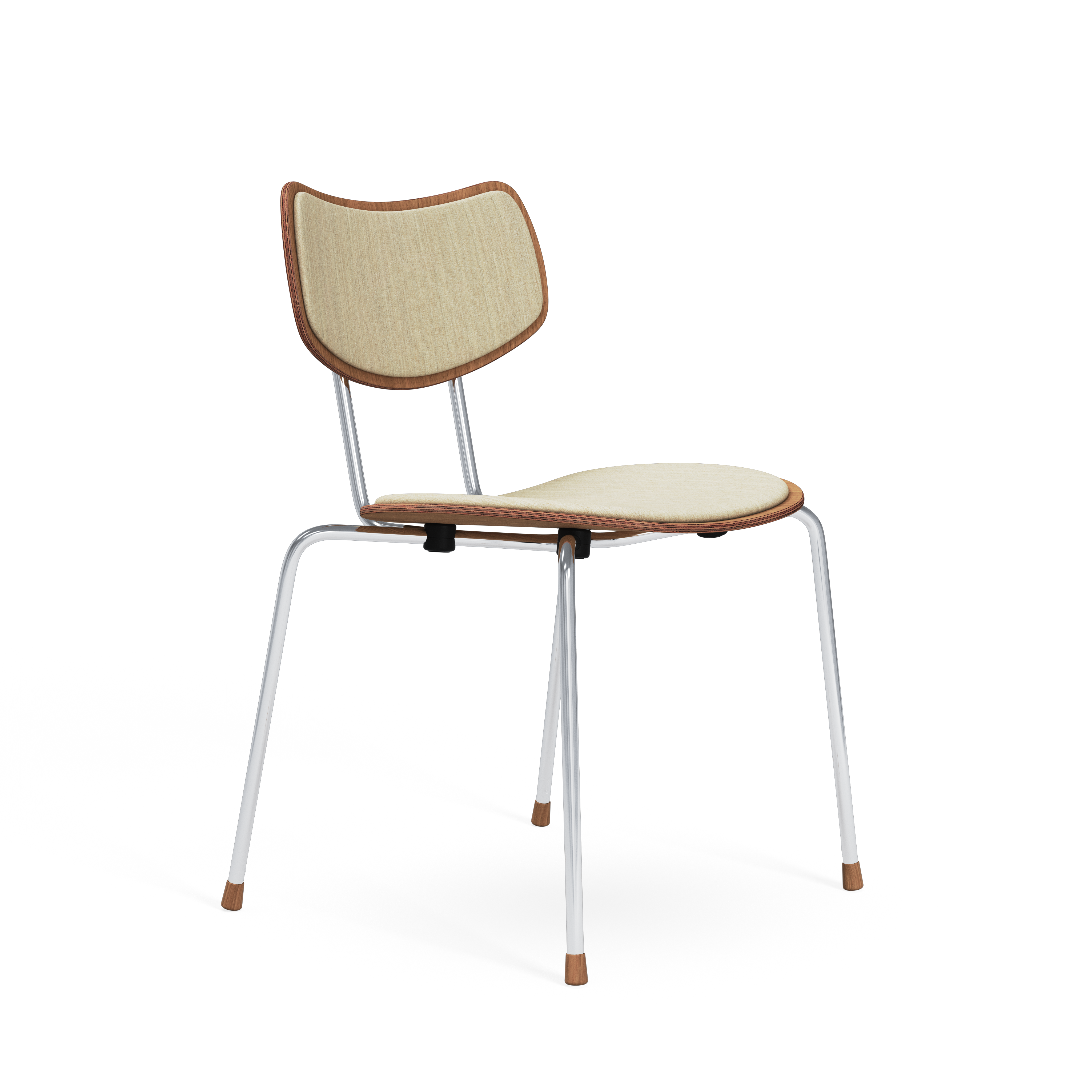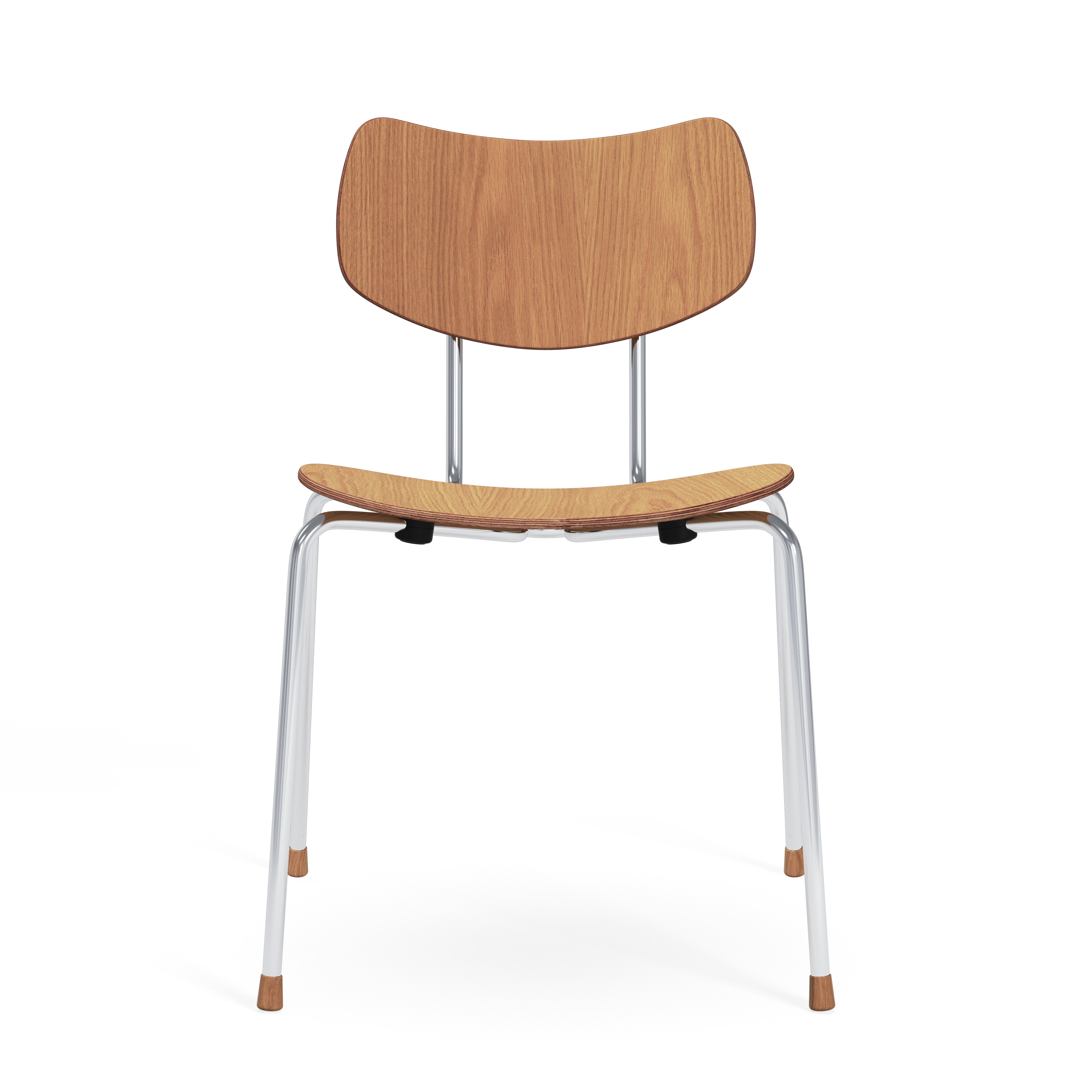 Vilhelm Lauritzen's uncompromising attention to detail is also evident in the stackable Vega Chair, which comes in an elegant material mix of steel, wood and textile or leather. The precise upholstery on the seat and back gives the chair a sleek and refined look. For a more pared-down look, the chair is also produced without upholstery, bringing the tactile oak into full focus.