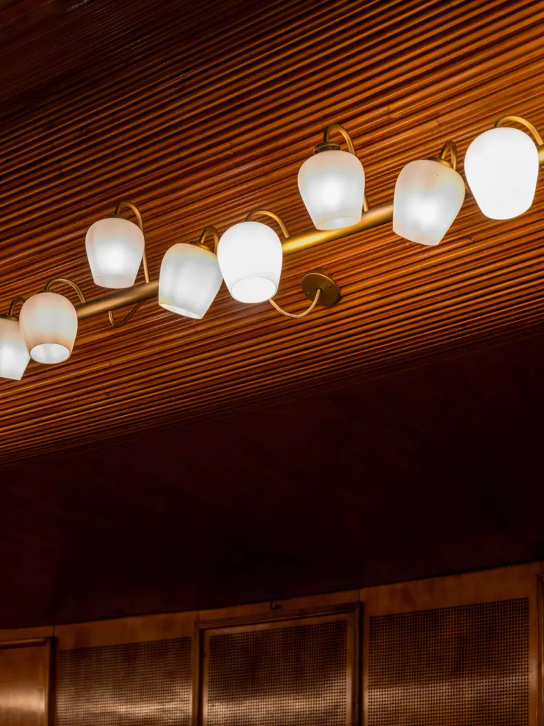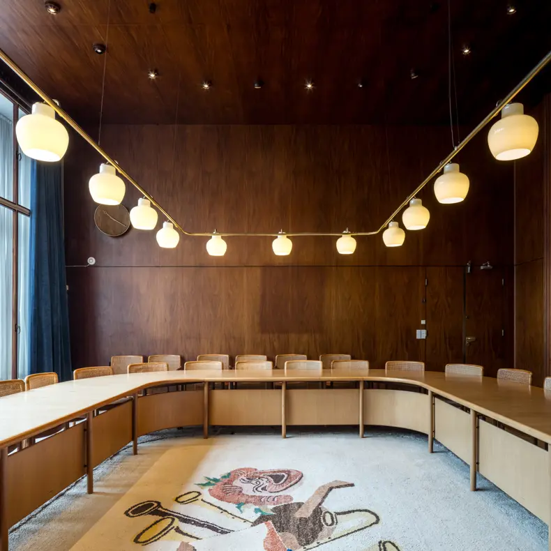 The materials used in the Radio House are exclusive both inside and out. The facades are made of Greenlandic marble, and the furniture and furnishings are designed in materials like dark mahogany. The ceiling in the foyer is divided into sections of oxhide, stretched directly over mineral wool.
