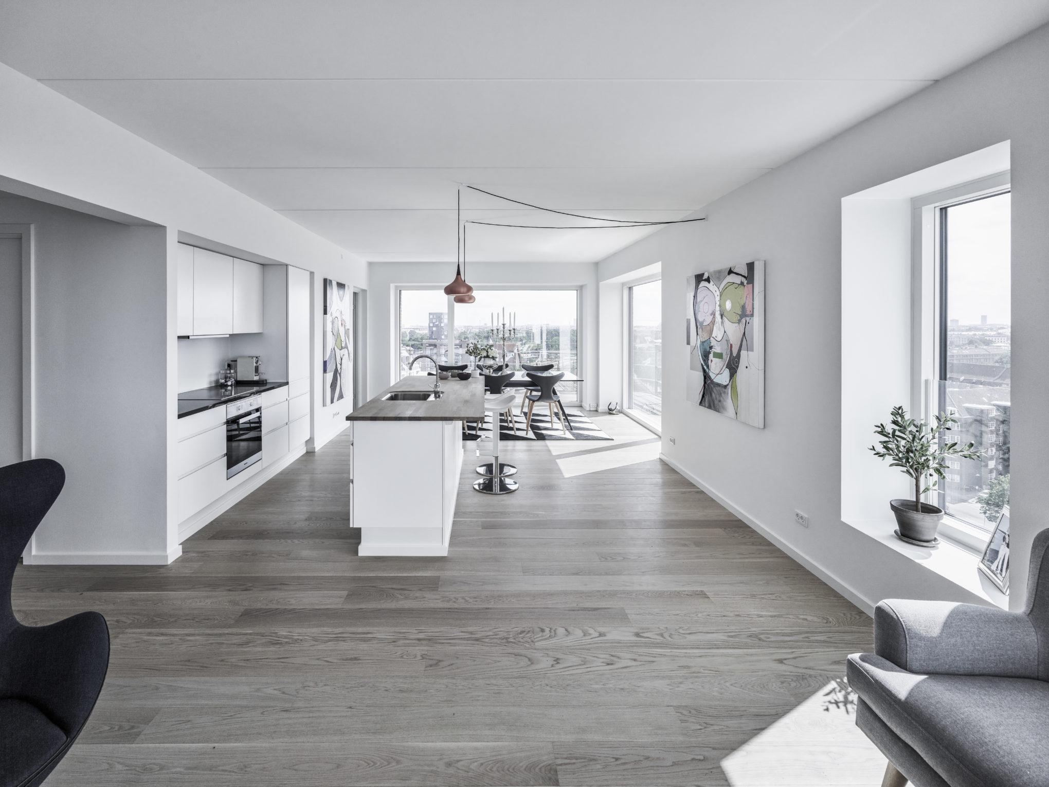 Alle lejligheder er indrettet med lyse trægulve og badeværelser i lys sandfarvet sten som smelter godt sammen med trægulvene, så boligen fortsættes i det samme lyse miljø.
