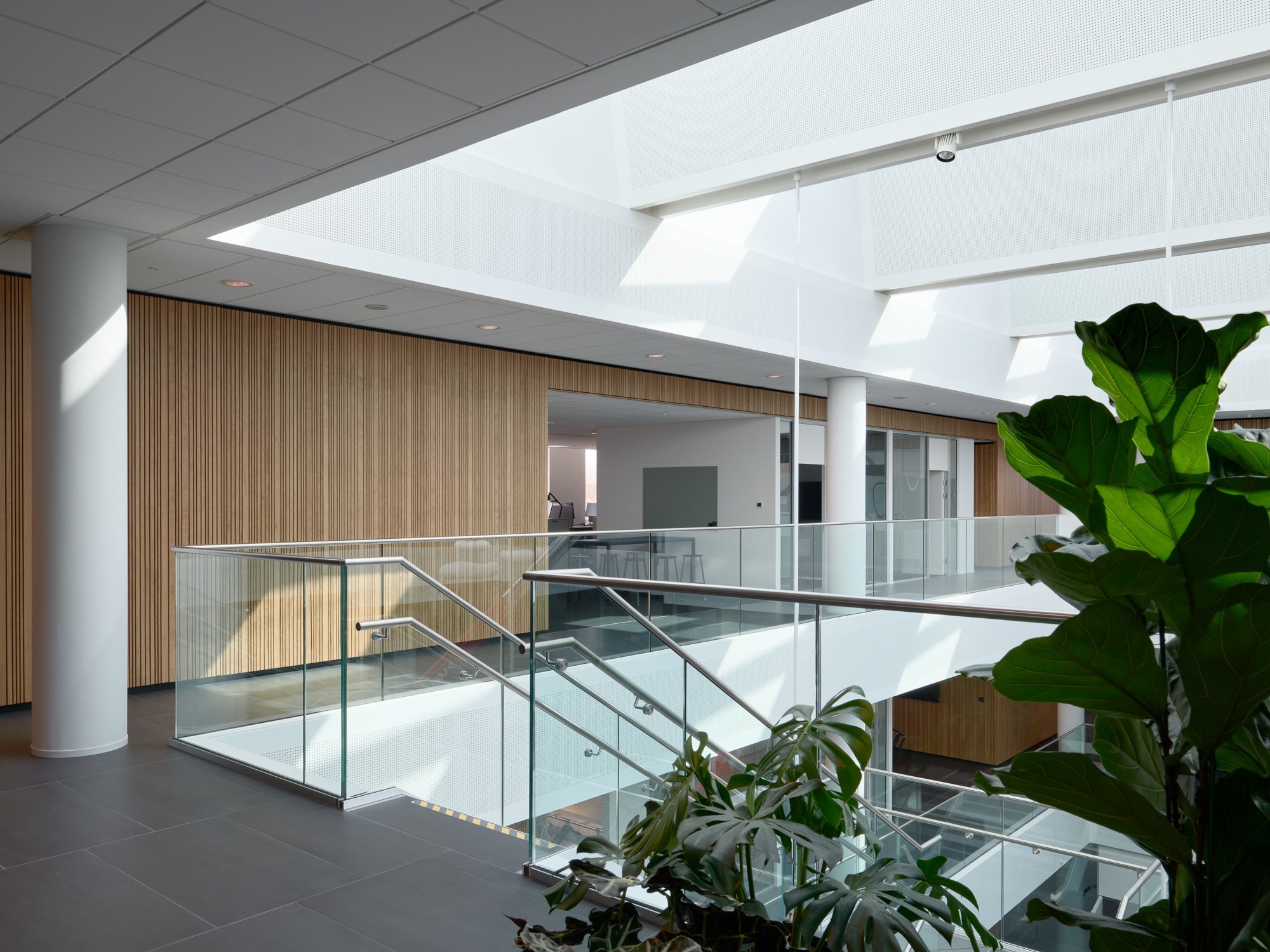 Bygningen består af fire kvadrater, der mødes i hjørnerne og indeholder henholdsvis laboratorier, kontorer og hver sit atrium. Sammen med hovedindgangen, receptionen og mødecenteret ligger kantinen og multirummet i stueetagen og danner et levende mødested for brugere og besøgende. Gennemgående for det nye campus løber et hovedstrøg, der både samler bygningen og fordeler bevægelsesflowet og samtidig indeholder kaffeøer og uformelle møderum.