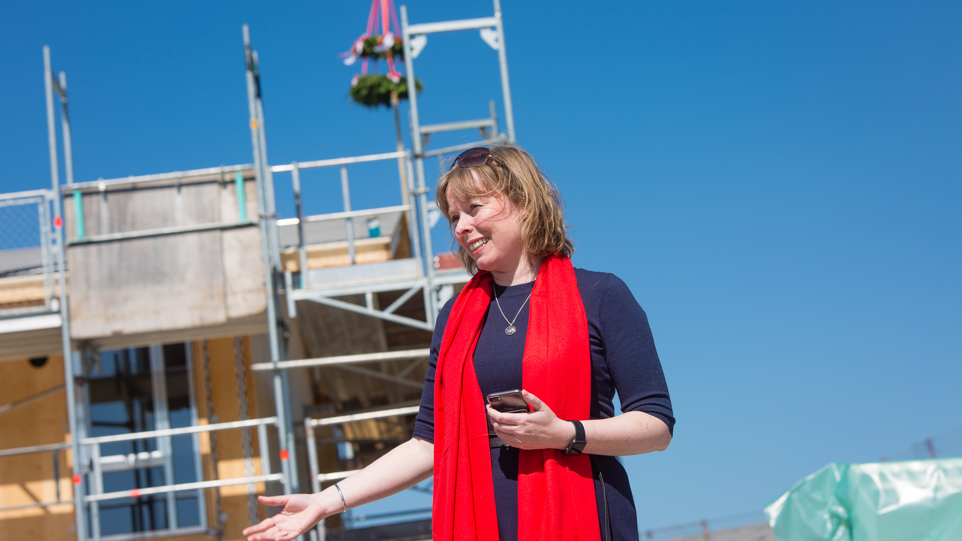 ”Det er vigtigt, at vi tænker bæredygtighed ind i alle byggerier i kommunen, hvis vi skal passe på miljøet. Det er derfor inspirerende at se et byggeri som dette, og byrådet og jeg ser frem til at følge udviklingen,” sagde Joy Mogensen til Licitationen, da hun besøgte byggepladsen i marts.