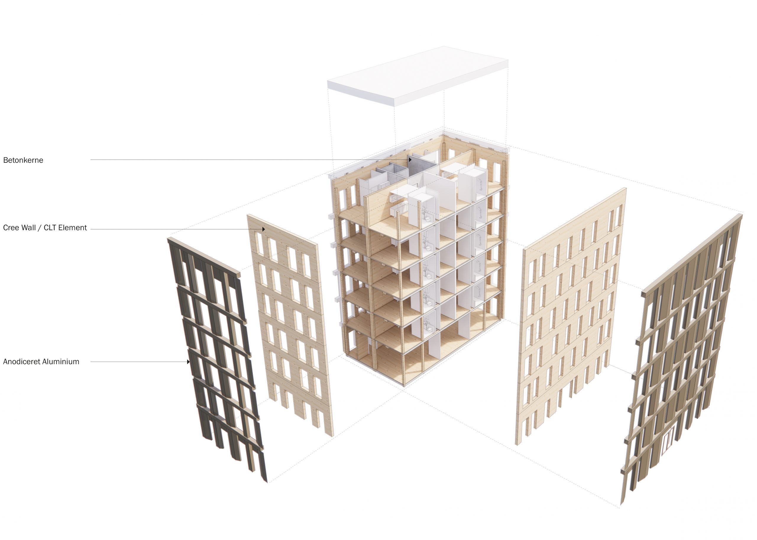 Det nye seks-etagers træhus i København bliver opført i et træ-hybrid system med en facade i anodiceret aluminium. De bærende konstruktioner er i træ, men styrken fra beton bliver udnyttet på udvalgte, kritiske steder.