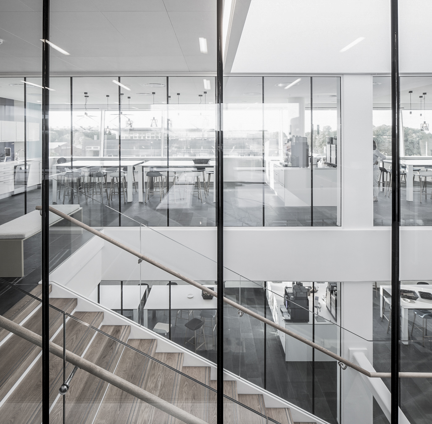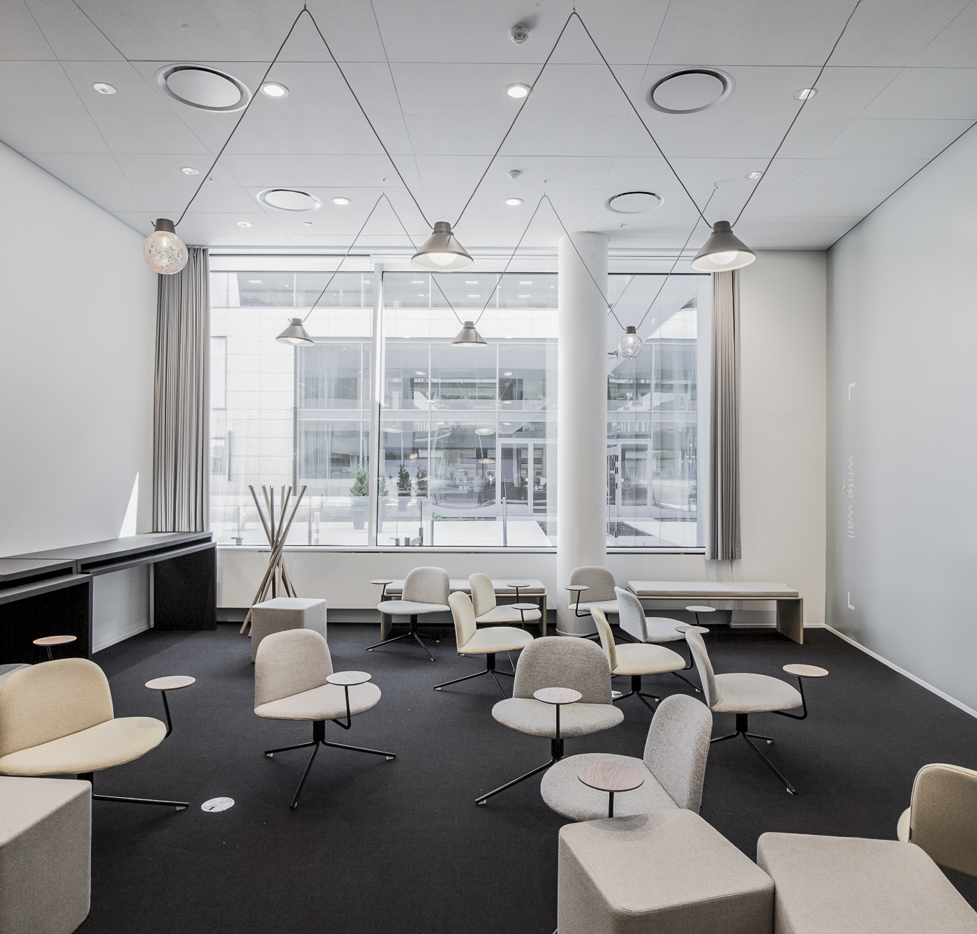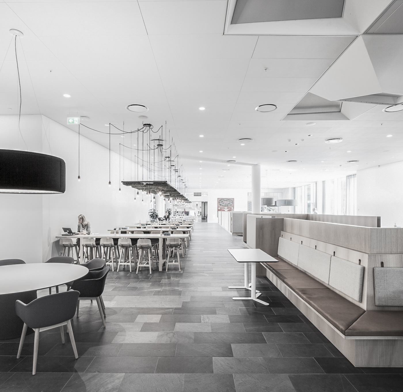 lyst og luftigt i det dobbelthøje rum. Loftet udgøres af et indskudt dæk, der er trukket tilbage fra de let udadvinklede glasfacader. Rummets kerner er beklædt i lyst træ og står på en gulvflade af ølandssten, der danner en stoflig base for det luftige interiør. Trapperne står med trin i lyst træ og hvidmalede vanger.
