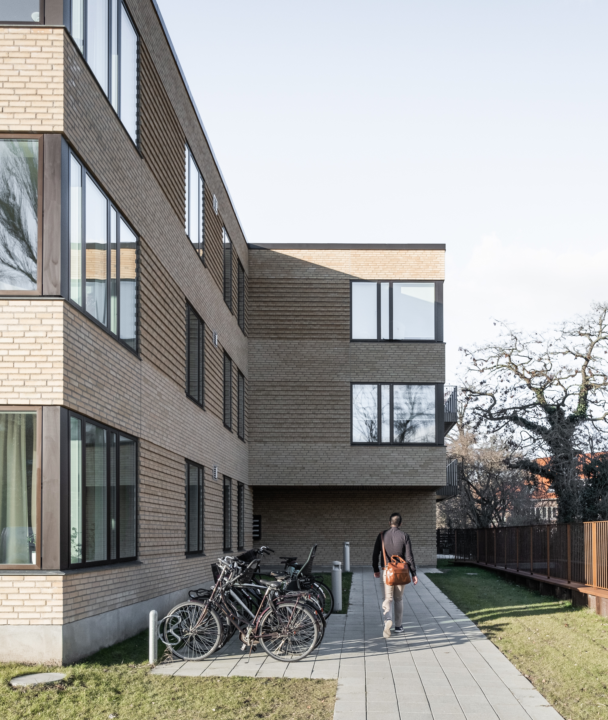 Bygningens ydre består af en lys sandfarvet teglsten med et naturligt spil og harmoniske fuger, der matcher stenens nuancer. Resultatet er en rolig, samlet murflade, der skaber en indbydende, helhedsorienteret æstetik.