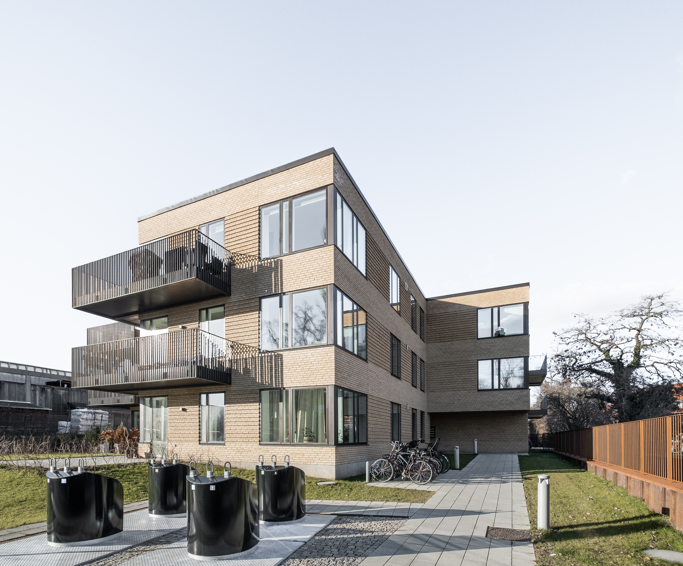 Under bygningen er der etableret en rummelig parkeringskælder med plads til 12 biler, 12 depotrum på 3 m² hver og 24 cykelpladser. Teknikrum er også placeret i kælderen, så tagfladen holdes fri og enkel. Hver bolig er udstyret med hjørnevinduer og private altaner, der sikrer både lys og udsigt.
