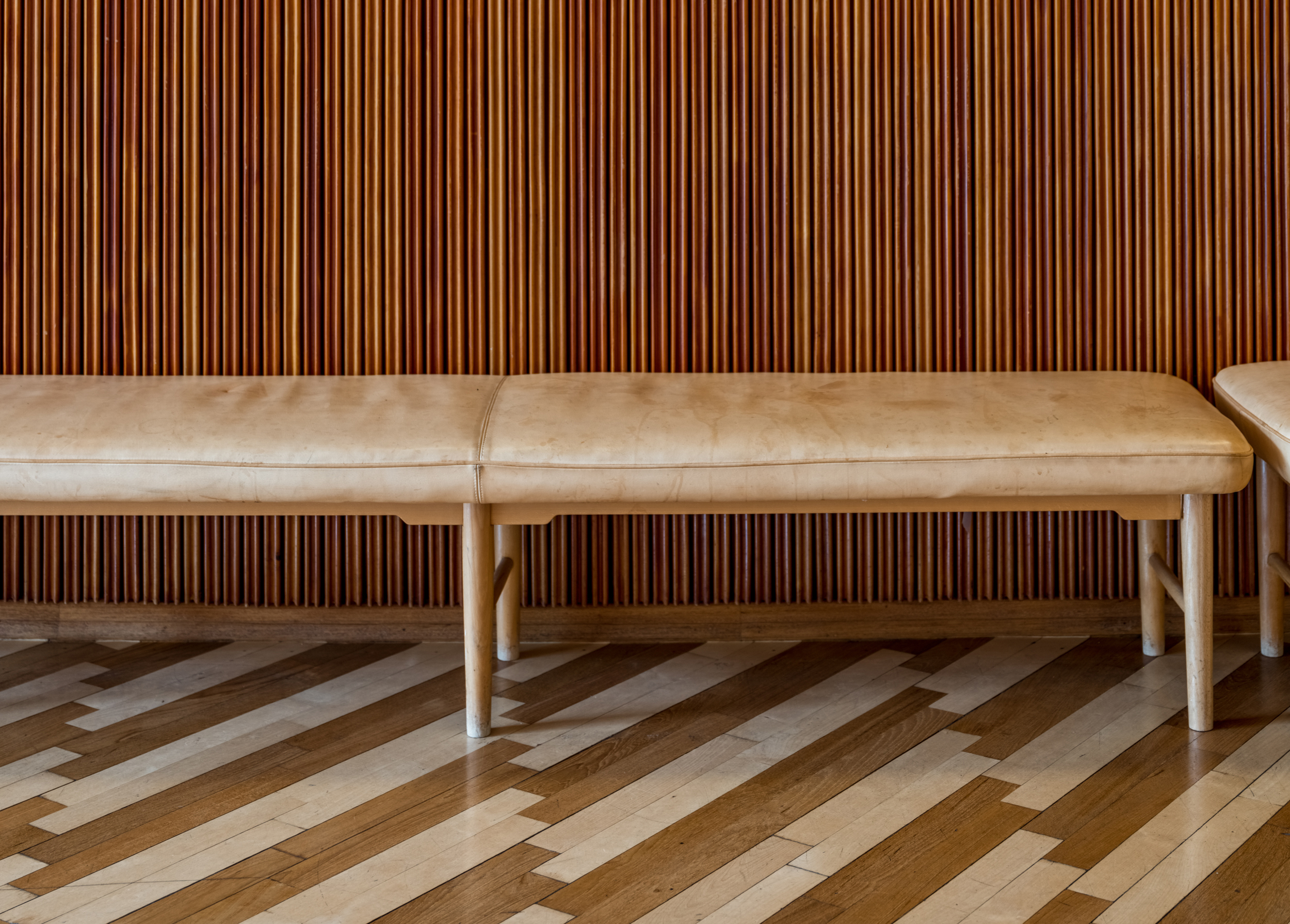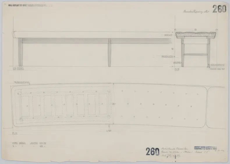 Oprindeligt produceret i 1945 til at stå op ad den krumme væk omkring koncertsalen på 1. sal i Radiohuset forhus. Bænken fungerede som et socialt mødested for Radiohusets gæster, når de først trådte ind i bygningen. På den måde forbliver møblet sit eget eksempel på dansk funktionalisme, hvor form følger funktion. Hvlket særligt viser Vilhelm Lauritzen ekspertise som møbeldesigner og arkitekt.