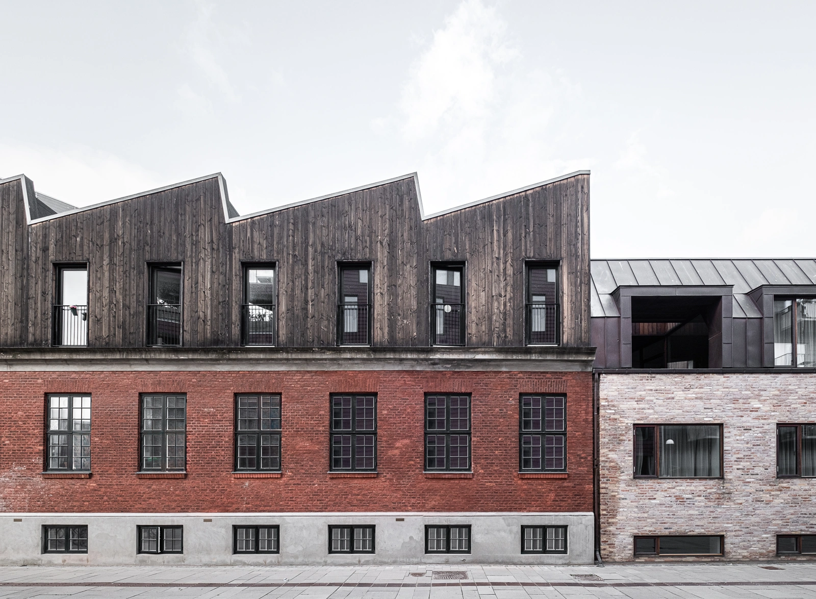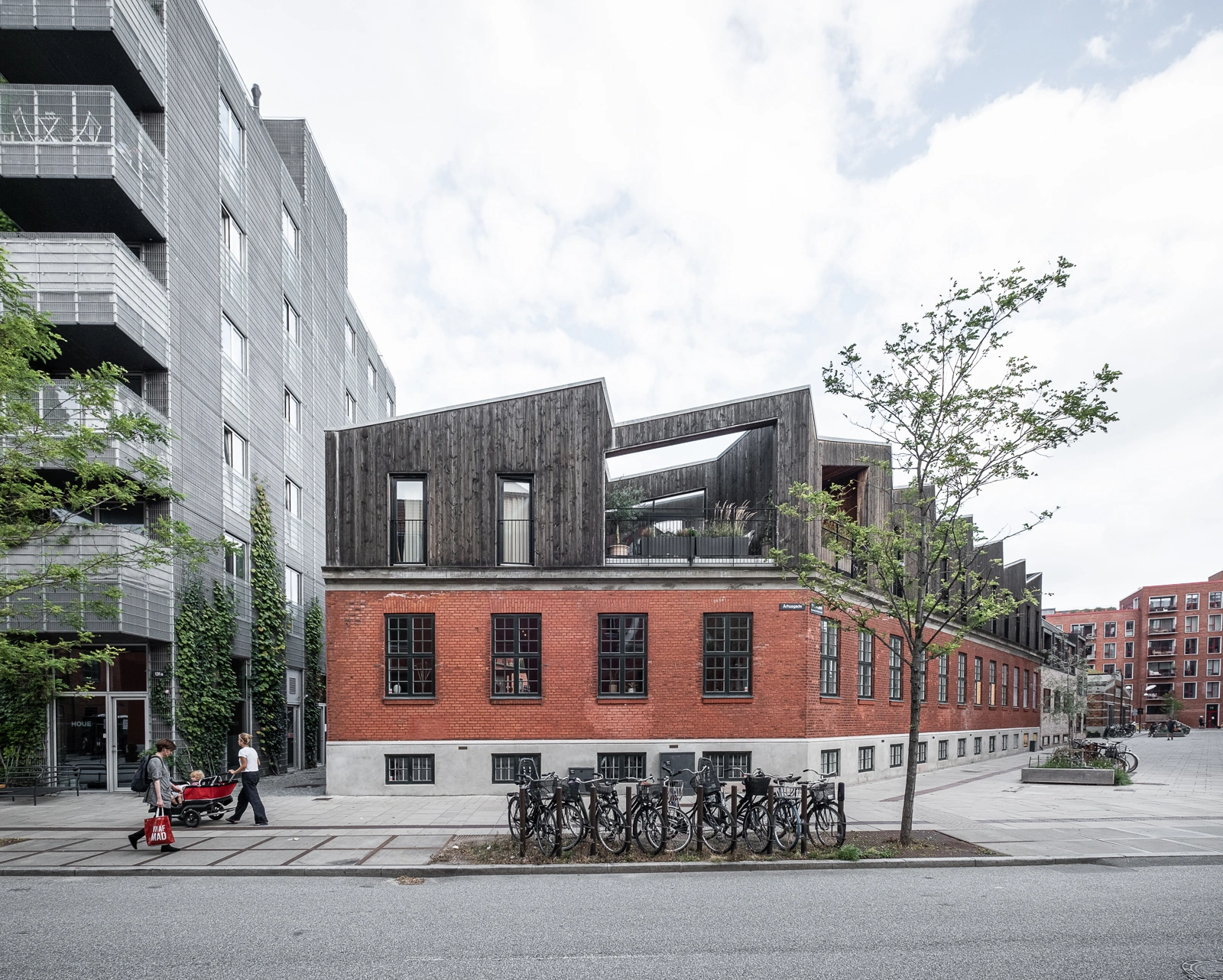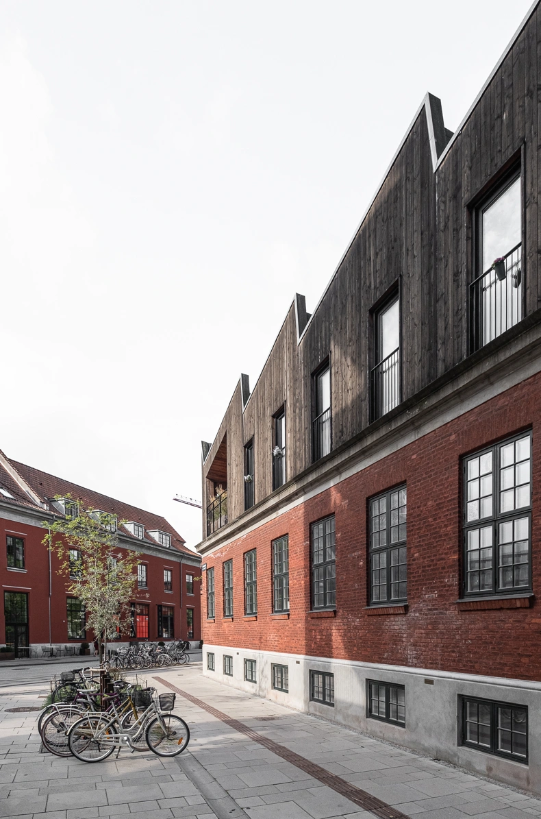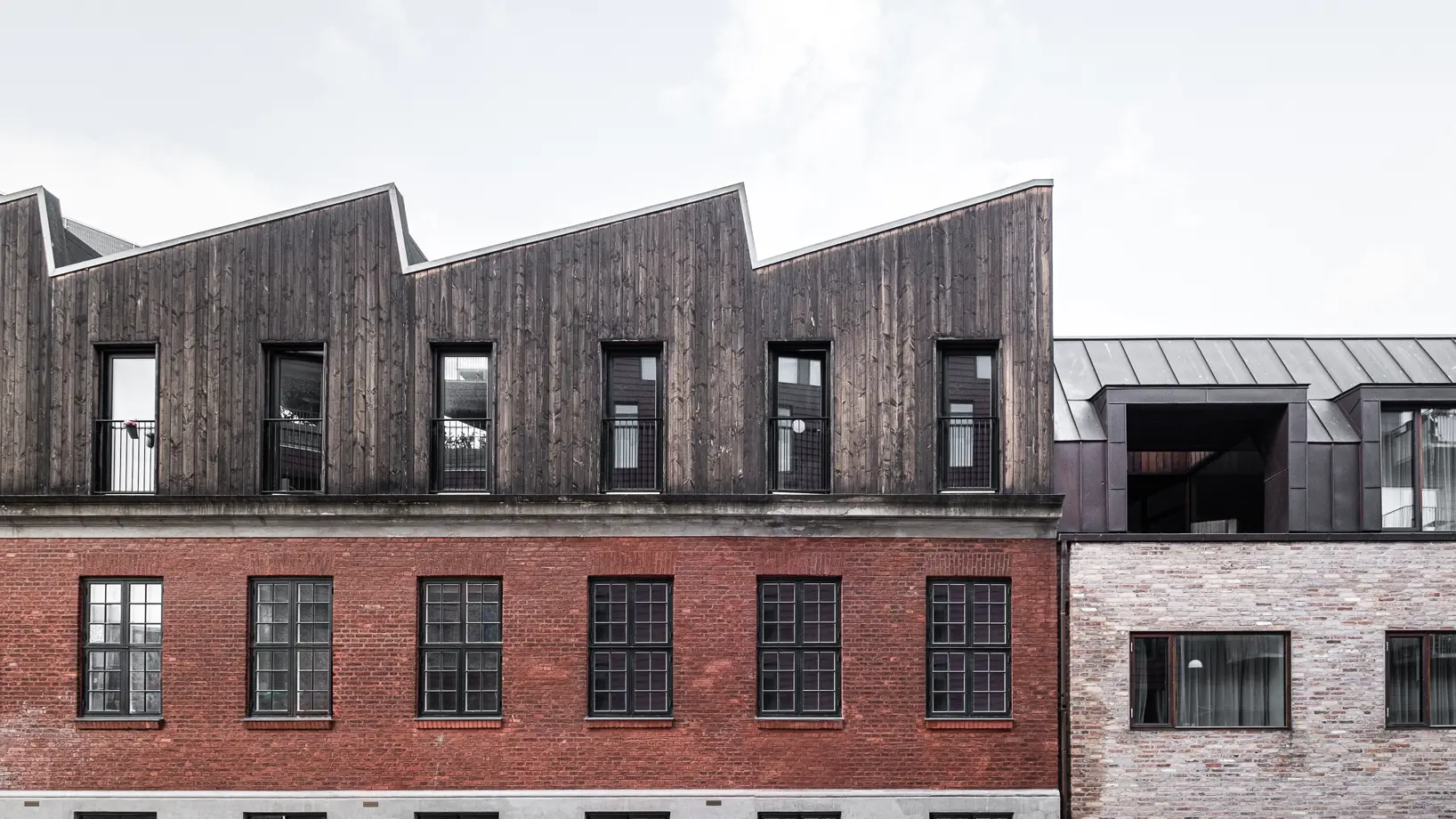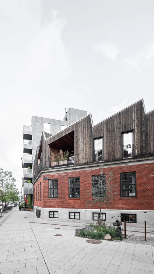 Det takkede tag i skur-stil er en reference til områdets industrihistorie, men det skulpturelle design og kontrasterende facadebeklædning giver en selvstændig nyfortolkning af en tidligere industribygning med en klar kontrast mellem nyt og gammelt.