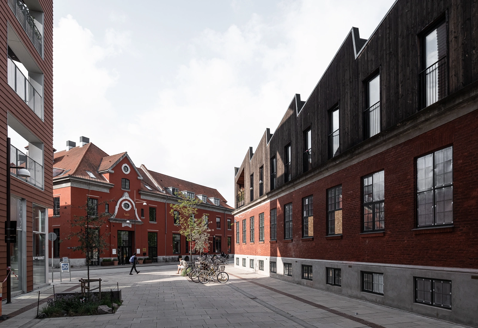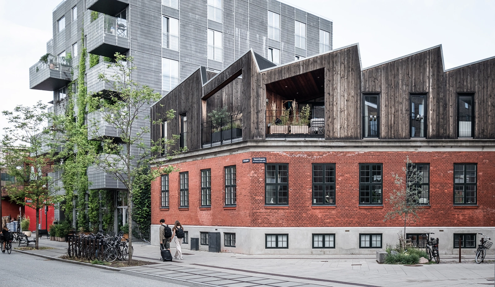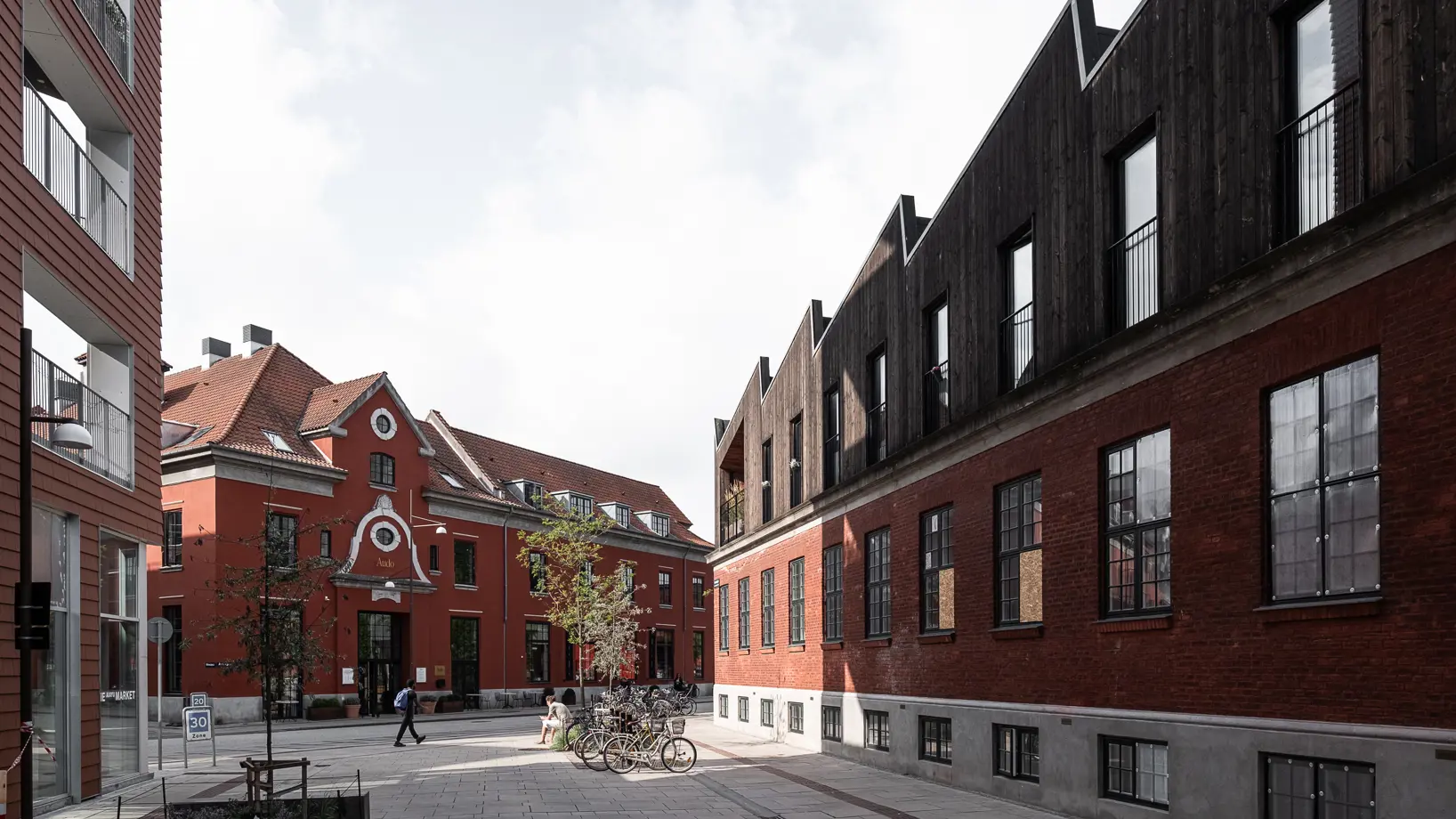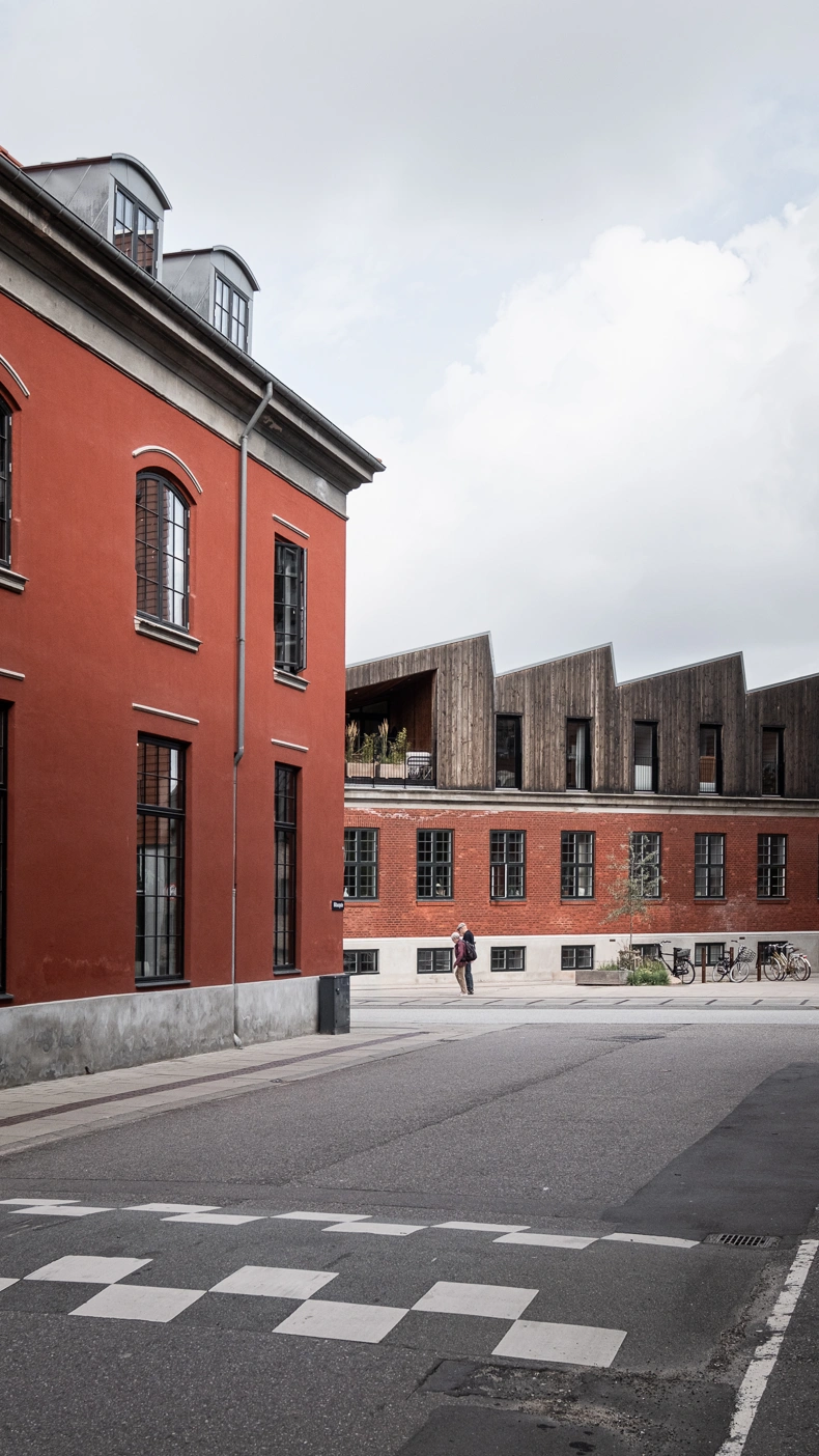 Det takkede tag i skur-stil er en reference til områdets industrihistorie, men det skulpturelle design og kontrasterende facadebeklædning giver en selvstændig nyfortolkning af en tidligere industribygning med en klar kontrast mellem nyt og gammelt.