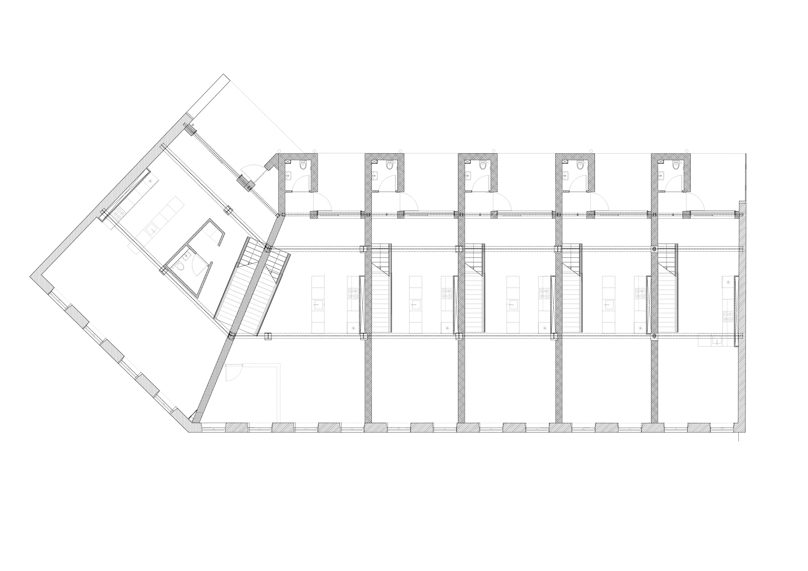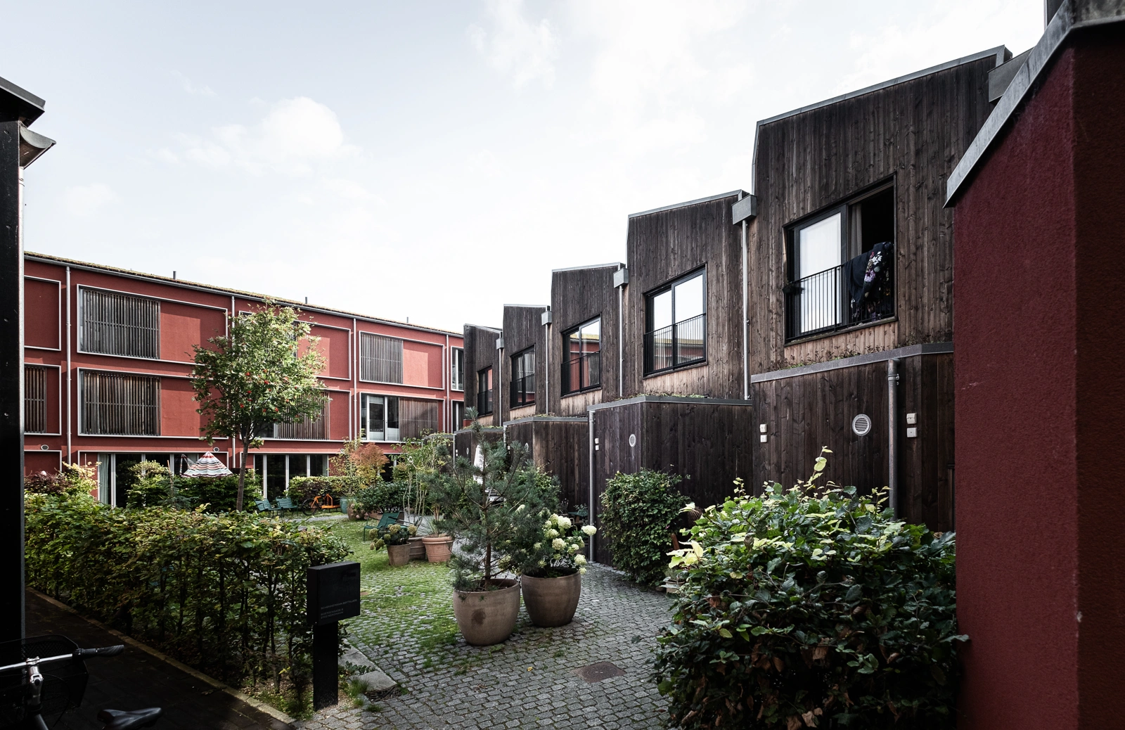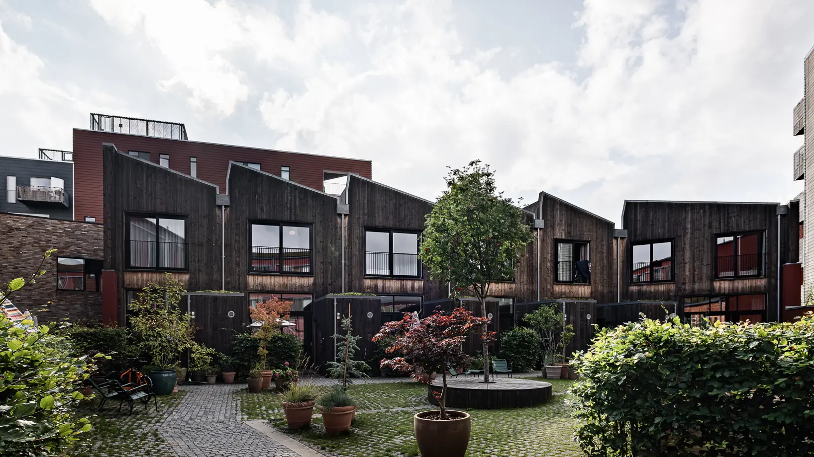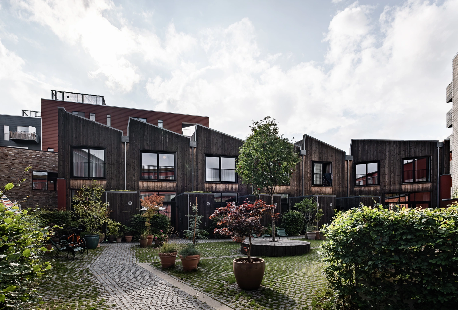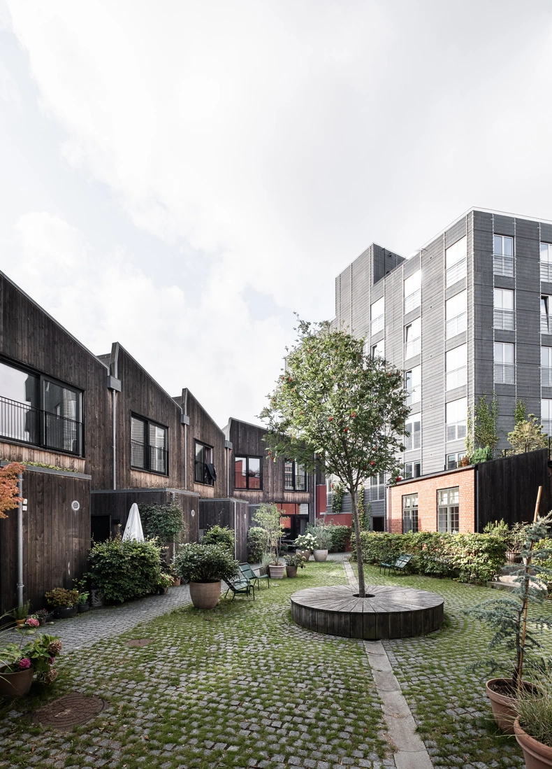 Indgangen er gennem en fælles gårdhave, hvilket gør det til en blid overgang fra gaden til boligerne. Fra gården fører gange til store tværbelyste opholdsrum med spisepladserne ud mod gården. Stuerne vender ud mod gaden og køkkenerne er placeret i de centrale zoner. Loftshøjder er generøse: op til 3,5 meter over stueetagerne og med plads, der åbner sig videre mod ovenlysvinduerne i tagene via de luftige opgange, der fører til både 1. sal og kældre. De seks rækkehuse har hver især et etageareal på 114–201 kvadratmeter.