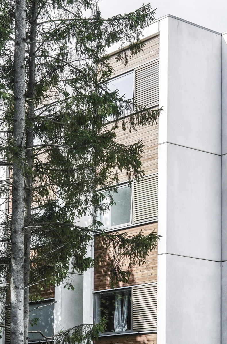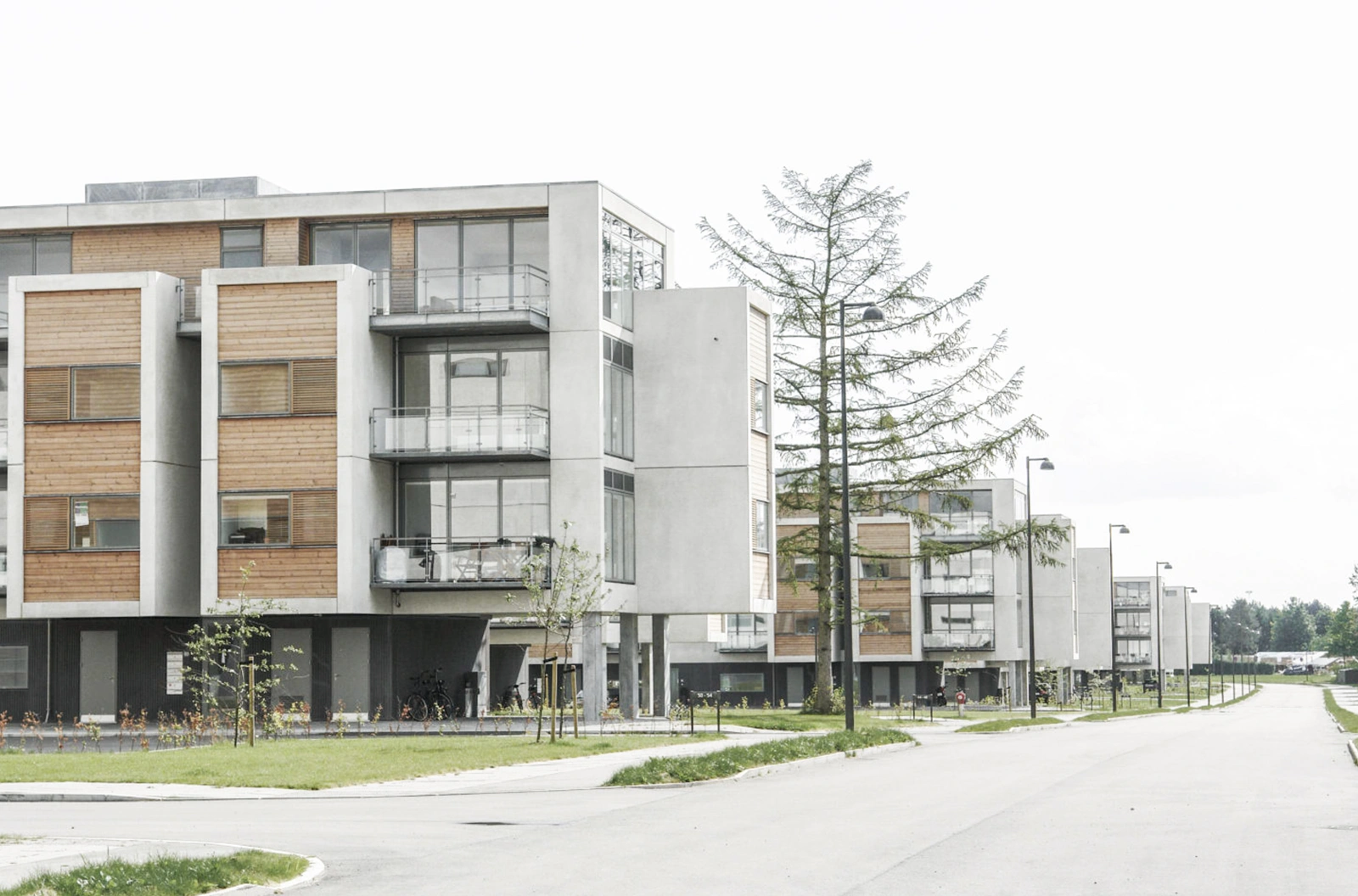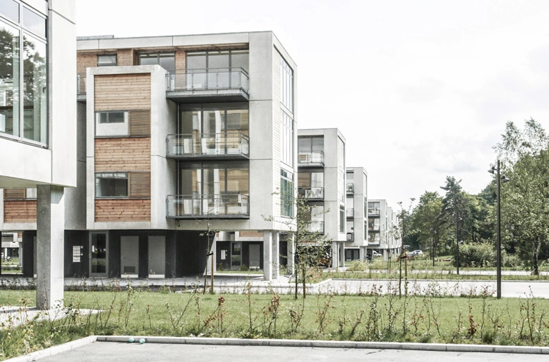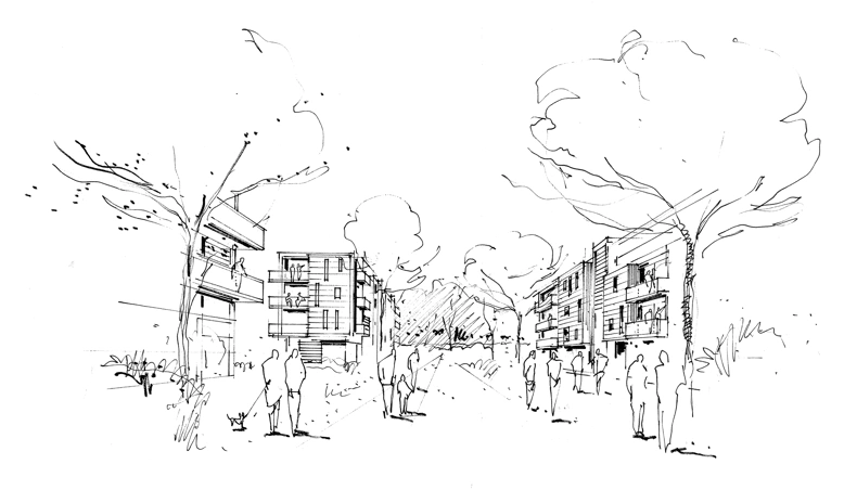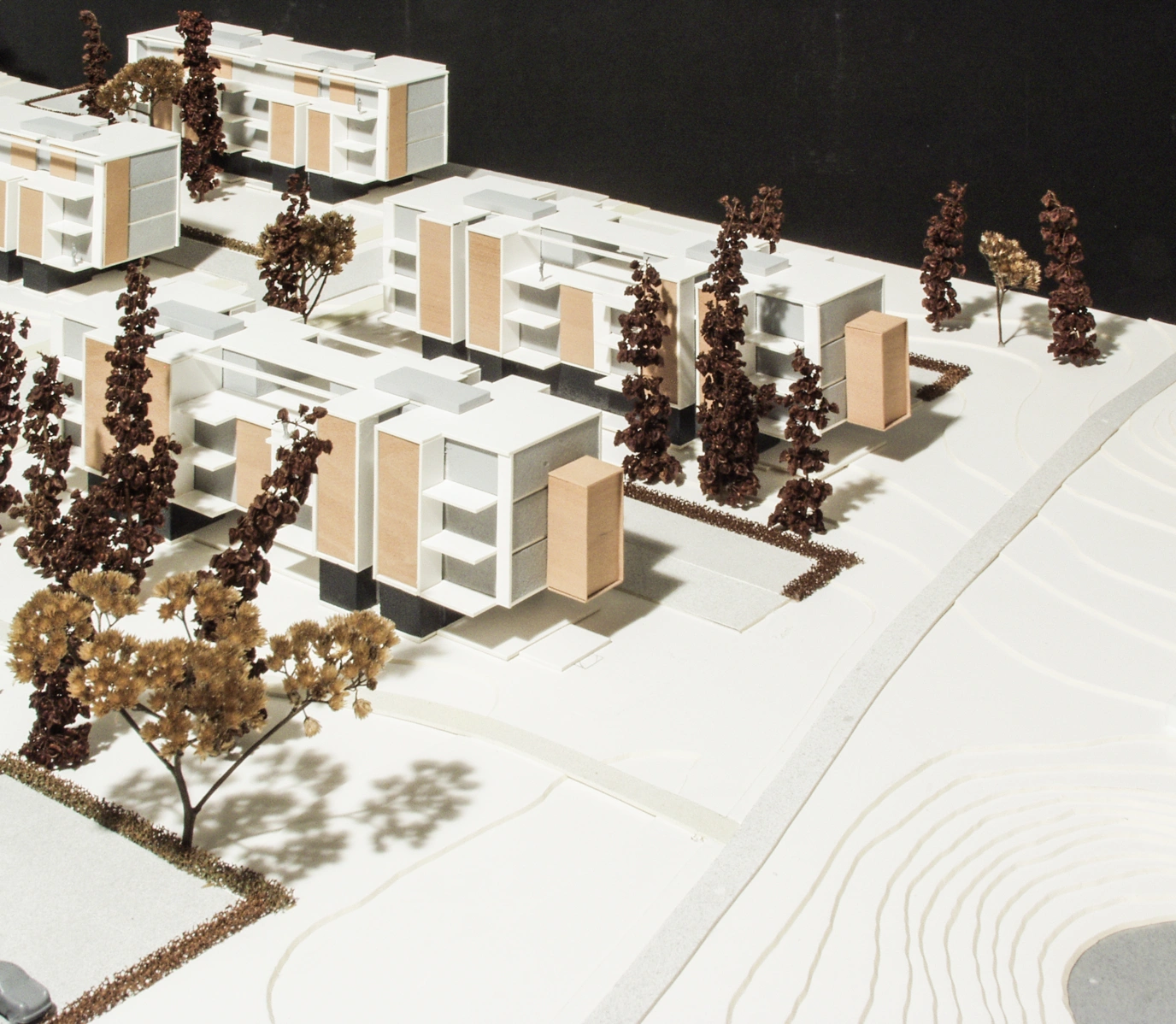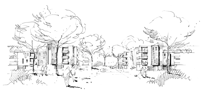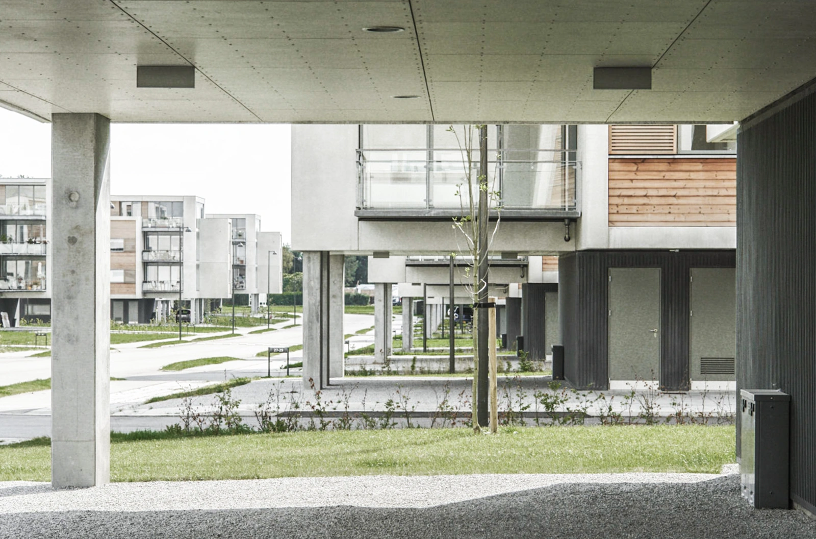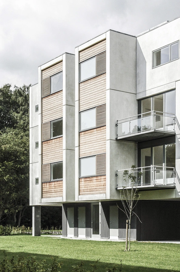 De 206 boliger hæver sig over terrænet – stueplan er trukket ind fra de øvre etager, hvorved bygningernes bærende søjler blotlægges. Arealerne i stueplan er forbeholdt fællesrum, opgangenes ankomstrum, parkering, cykelskure og depoter. Boligerne er hævet med udsigt over det naturrige område. Længernes fire etager opleves nedtonede i skala set i kontrast til den tilstødende høje skovbevoksning. Der er opnået en sammenhæng mellem natur, kulturlandskab og den samlede arkitektur, med en dialog mellem boligernes rum og uderummene.