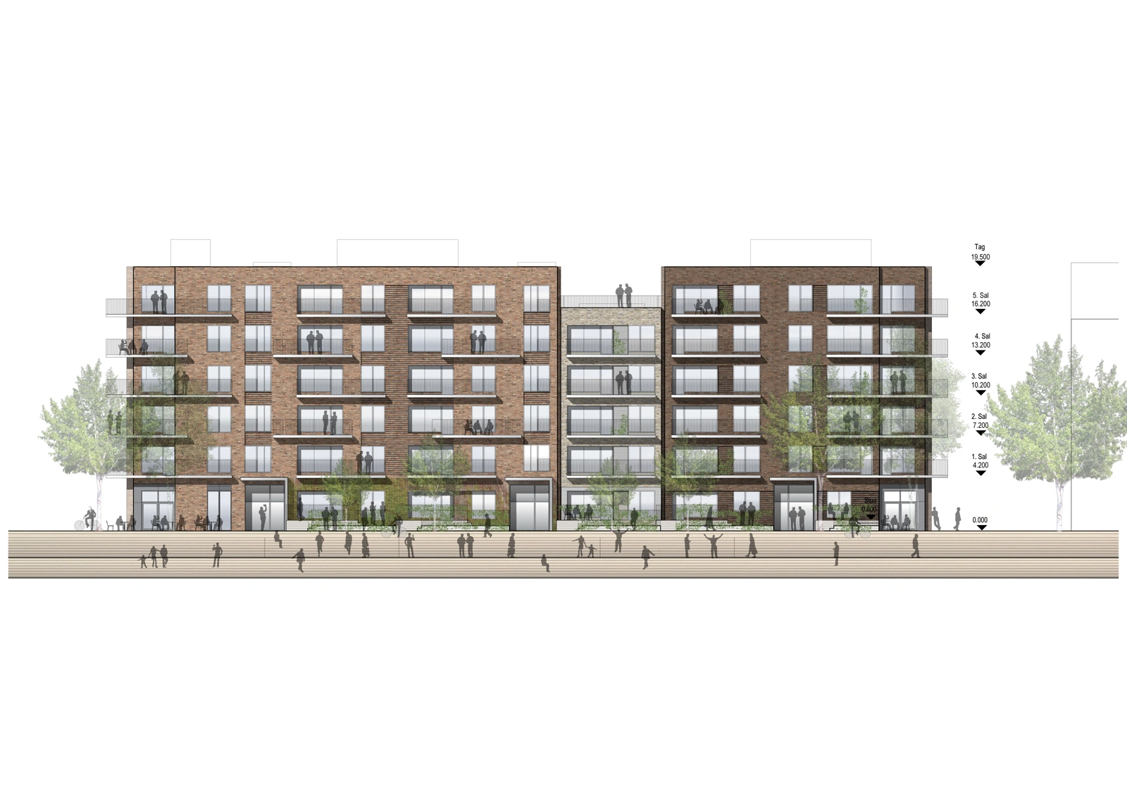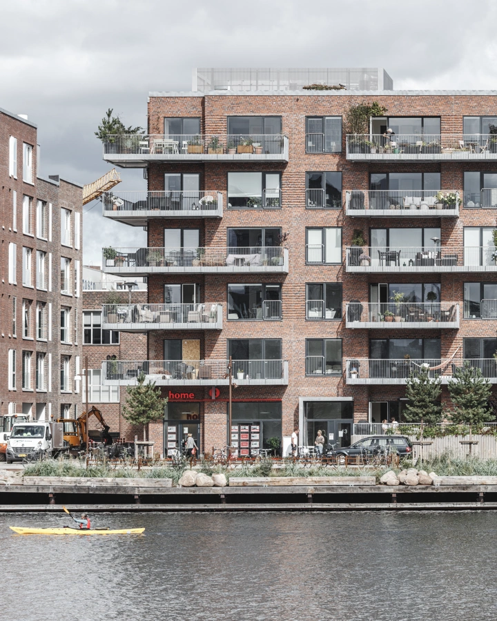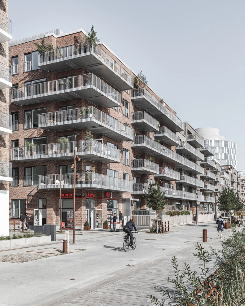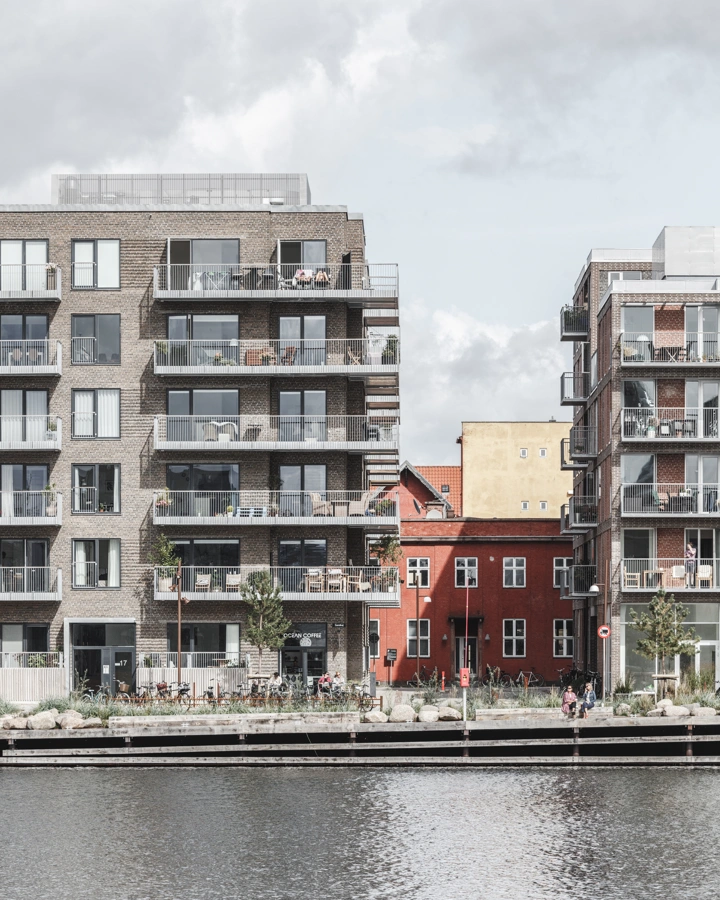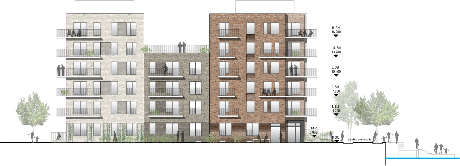 På det sydvendte promenadestrøg langs Sandkaj ligger en række etageboliger, hvor flere af dem har caféer og butikker i stueplan, der skaber små udadvendte mødesteder mellem bygningerne og havnebassinet.