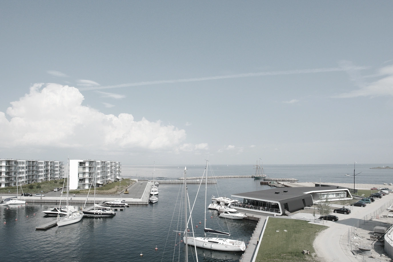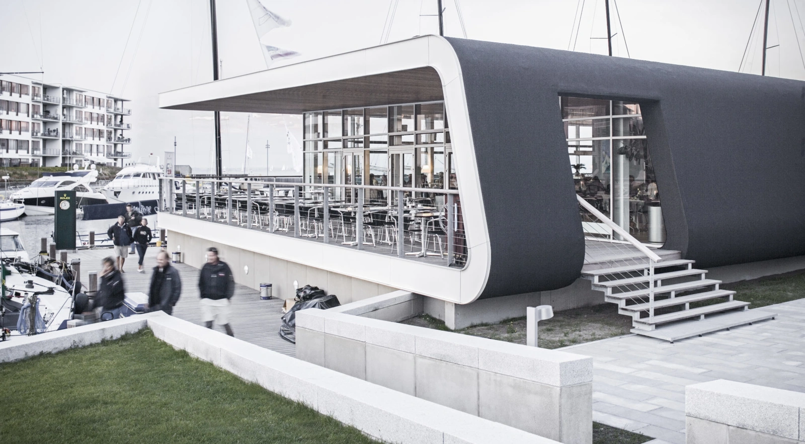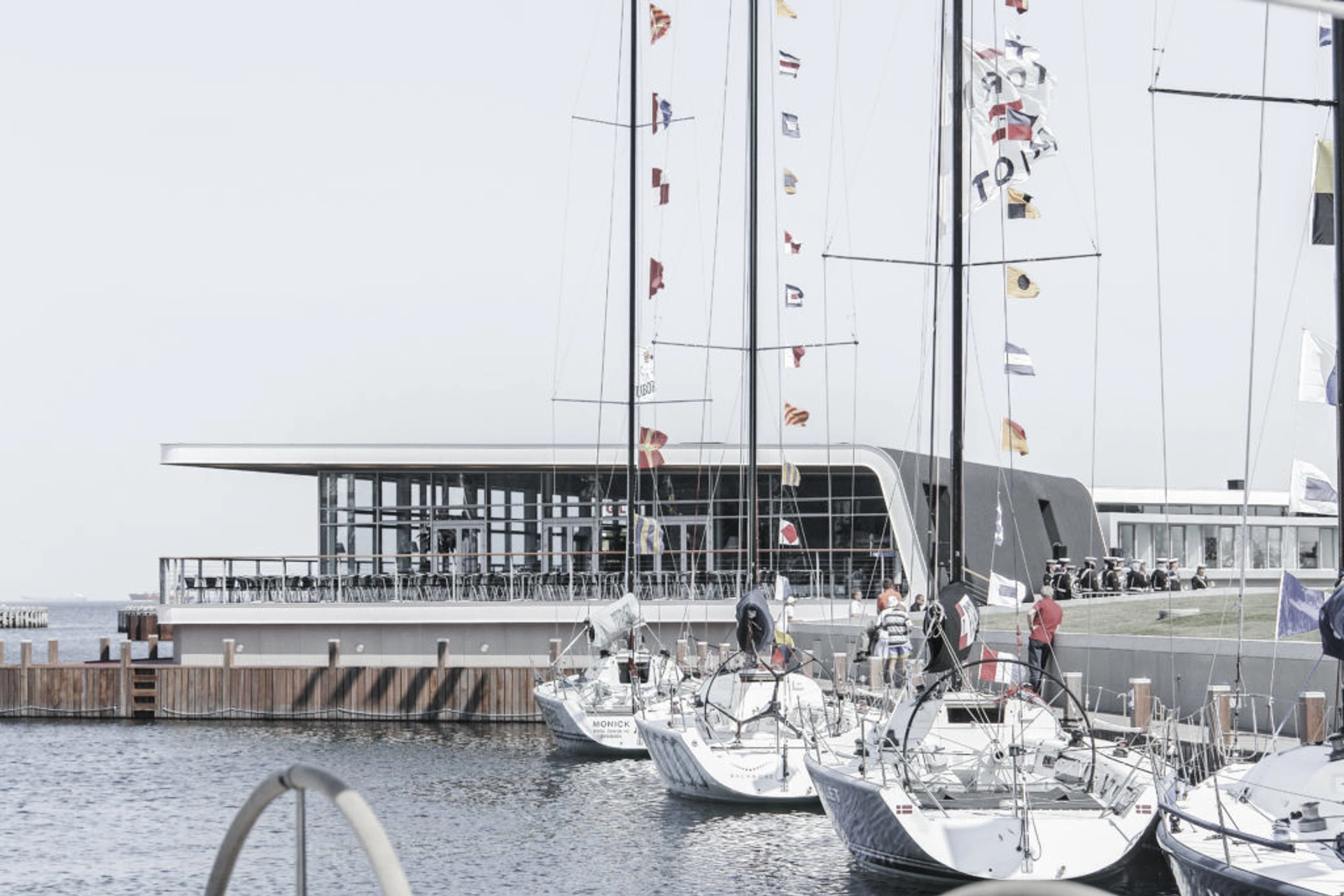 Med sin vinklede vifteform deler klubhuset havnen op i to sektioner. Den vinklede effekt og den nordlige orientering sikrer, at den offentlige restaurant byder på udsigt over havnen gennem gulv-til-loft vinduer. De vest- og sydvendte terrasser bader i den sene eftermiddagssol.