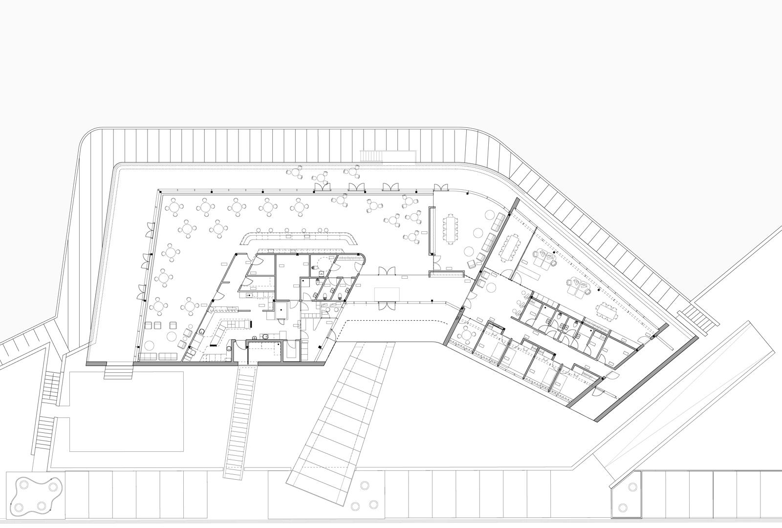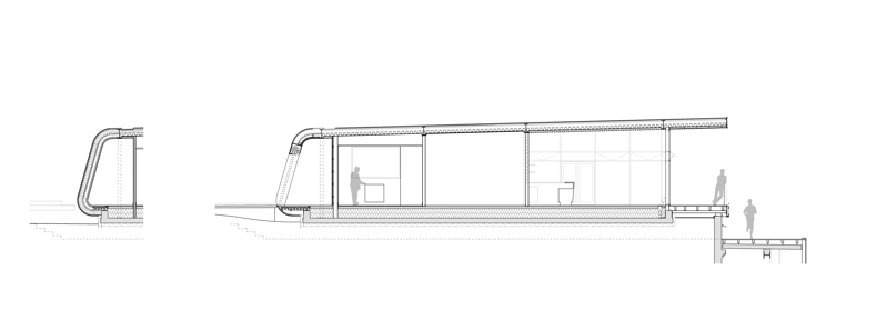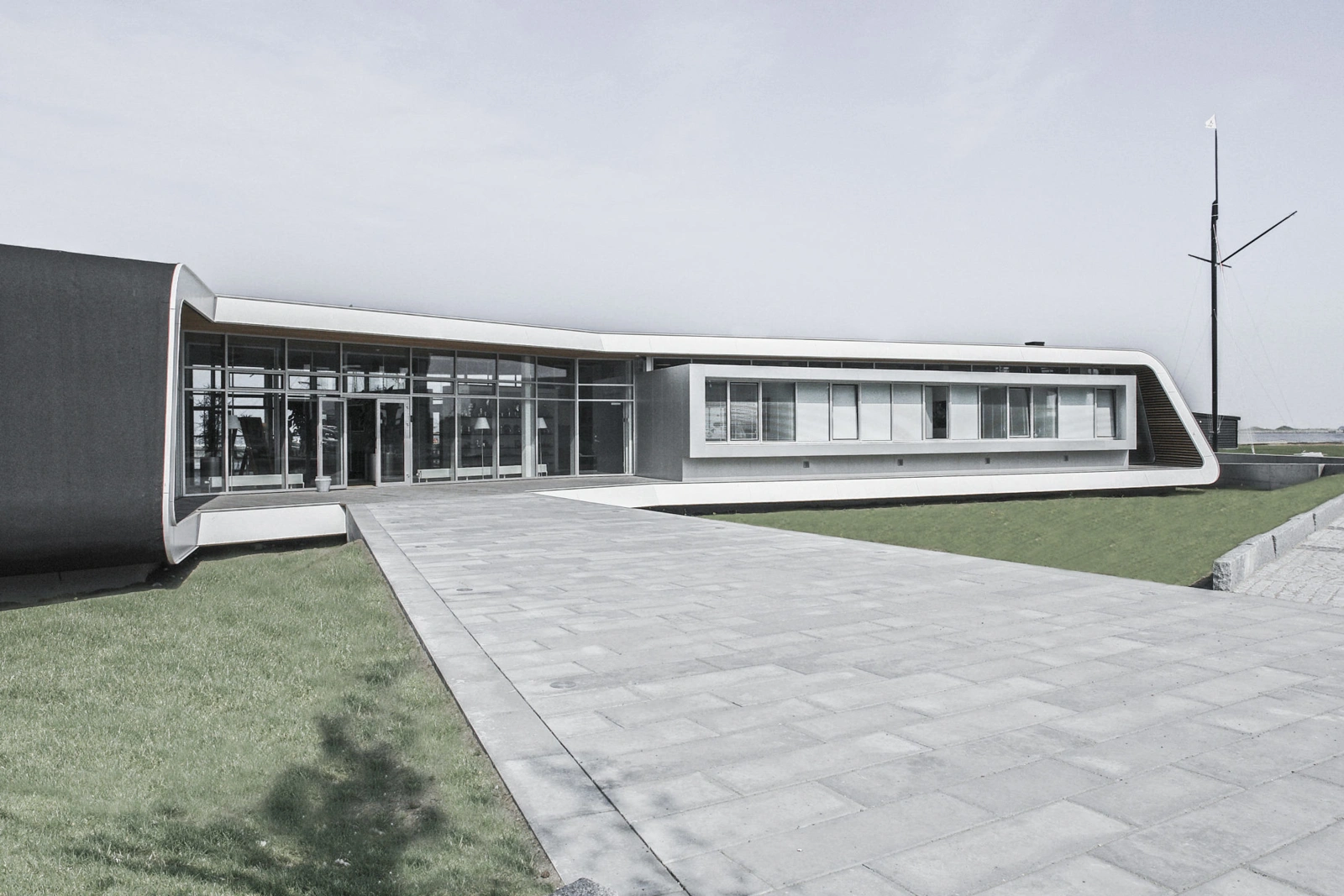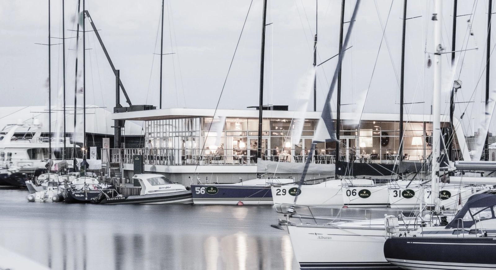 Med sin vinklede vifteform deler klubhuset havnen op i to sektioner. Den vinklede effekt og den nordlige orientering sikrer, at den offentlige restaurant byder på udsigt over havnen gennem gulv-til-loft vinduer. De vest- og sydvendte terrasser bader i den sene eftermiddagssol.