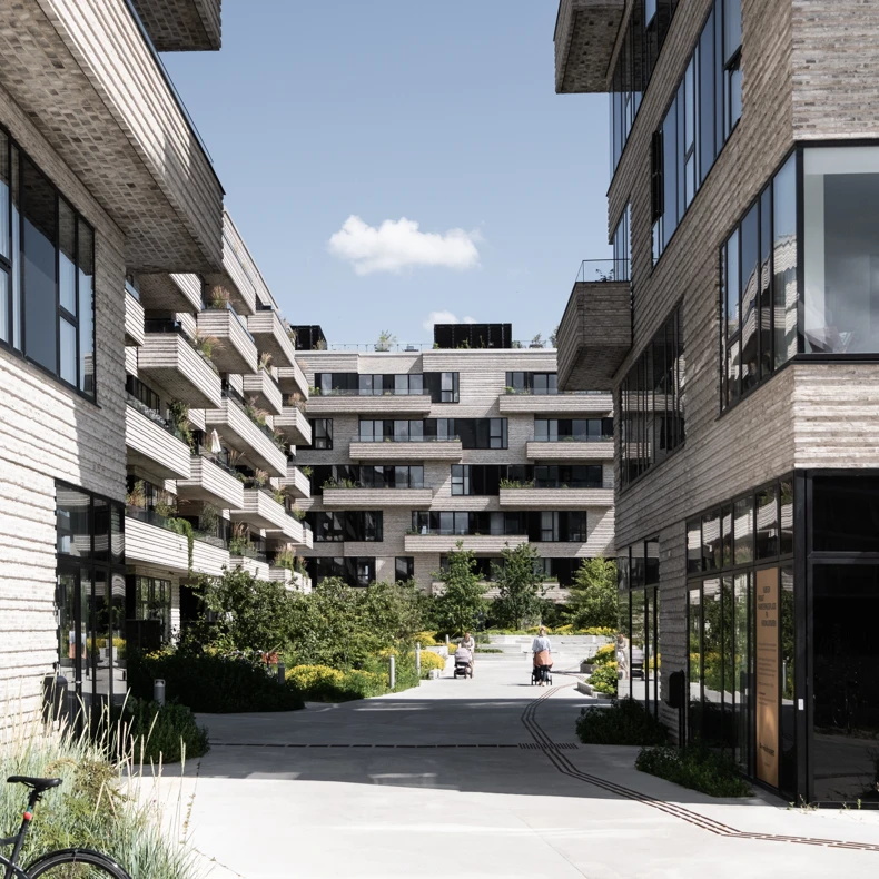 Den nye ø er som en monolit med en gennemgående materialitet, der både giver øen sin egen identitet og danner slægtskaber med bygningsmassen i de tilstødende kvarterer.