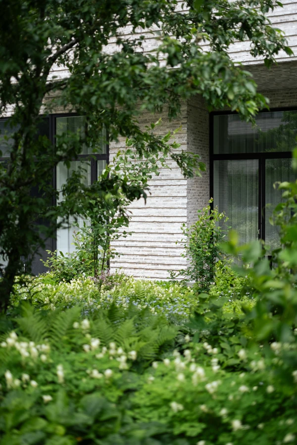 Facadens horisontale linjer, hulrum og udskæringer understreger stedets monolitiske fortælling, og tillader indskudte altaner som integrerer sig i bygningens rytme og lagdelte udtryk.