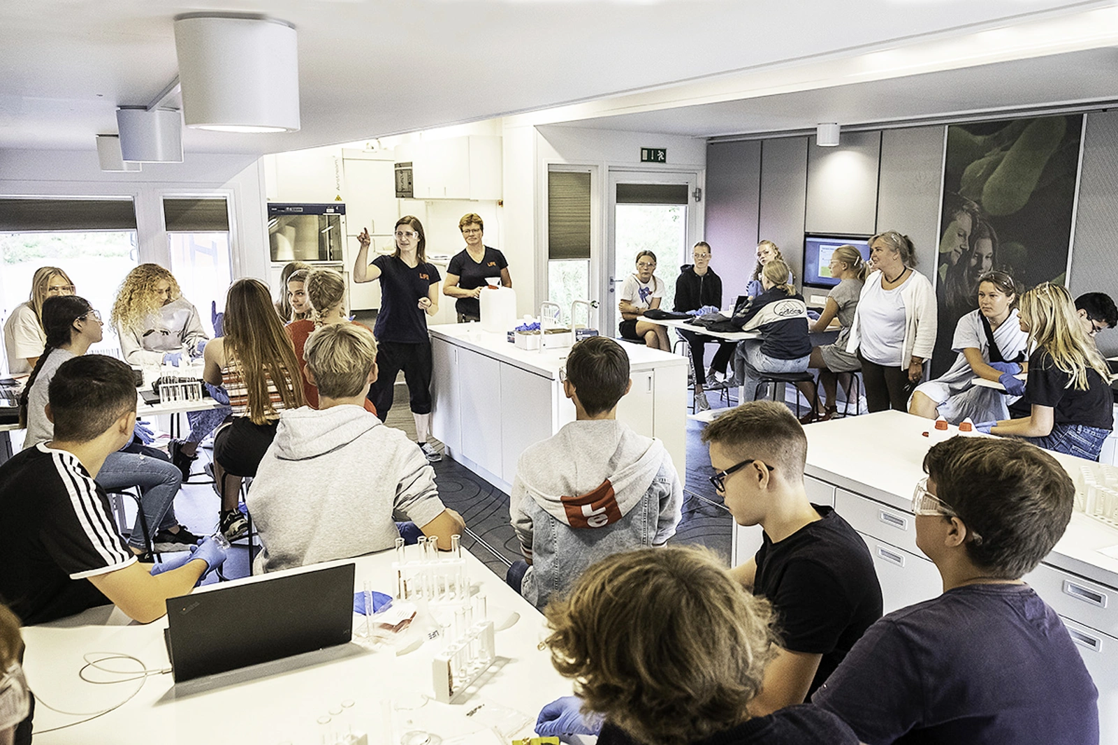 Der er fem store gruppeborde med hver sin skærm, der kan kobles op på udstyr med kamera. I midten er en stor skærm koblet op på LAF-bænken, så alle elever kan følge deltaljeret med i, hvad der sker i LAF-bænken. Flere borde er fleksible og kan flyttes rundt, hvis der er behov for at tilpasse opdelingen og indretningen i forhold til undervisningen i den enkelte klasse.