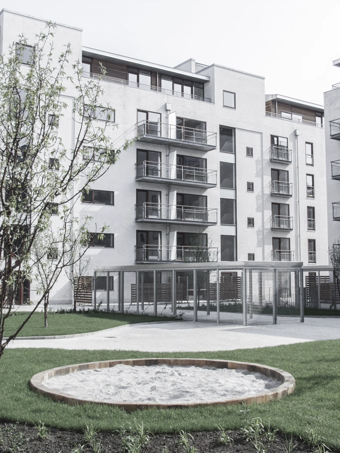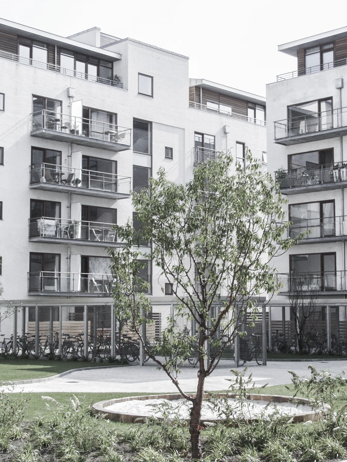 Ud mod Overgaden Neden Vandet rejser Løvens Gård sig i fire etager, plus en penthouseetage med kip, der i et nutidigt formsprog spejler tagene langs Christianshavns kanal. Tagetagen er tre steder udsparet for at give plads til generøse tagterrasser. Den L-formede mere homogene del af byggeriet – Elefantens Gård og Enhjørningens Gård – løfter sig op i 5 etager plus penthouse med fladt tag. Denne del forholder sig til den modernistiske, tæt komprimerede del af Christiansbro langs Hammershøis Kaj og Wildersgade, der bl.a. huser Nordea.