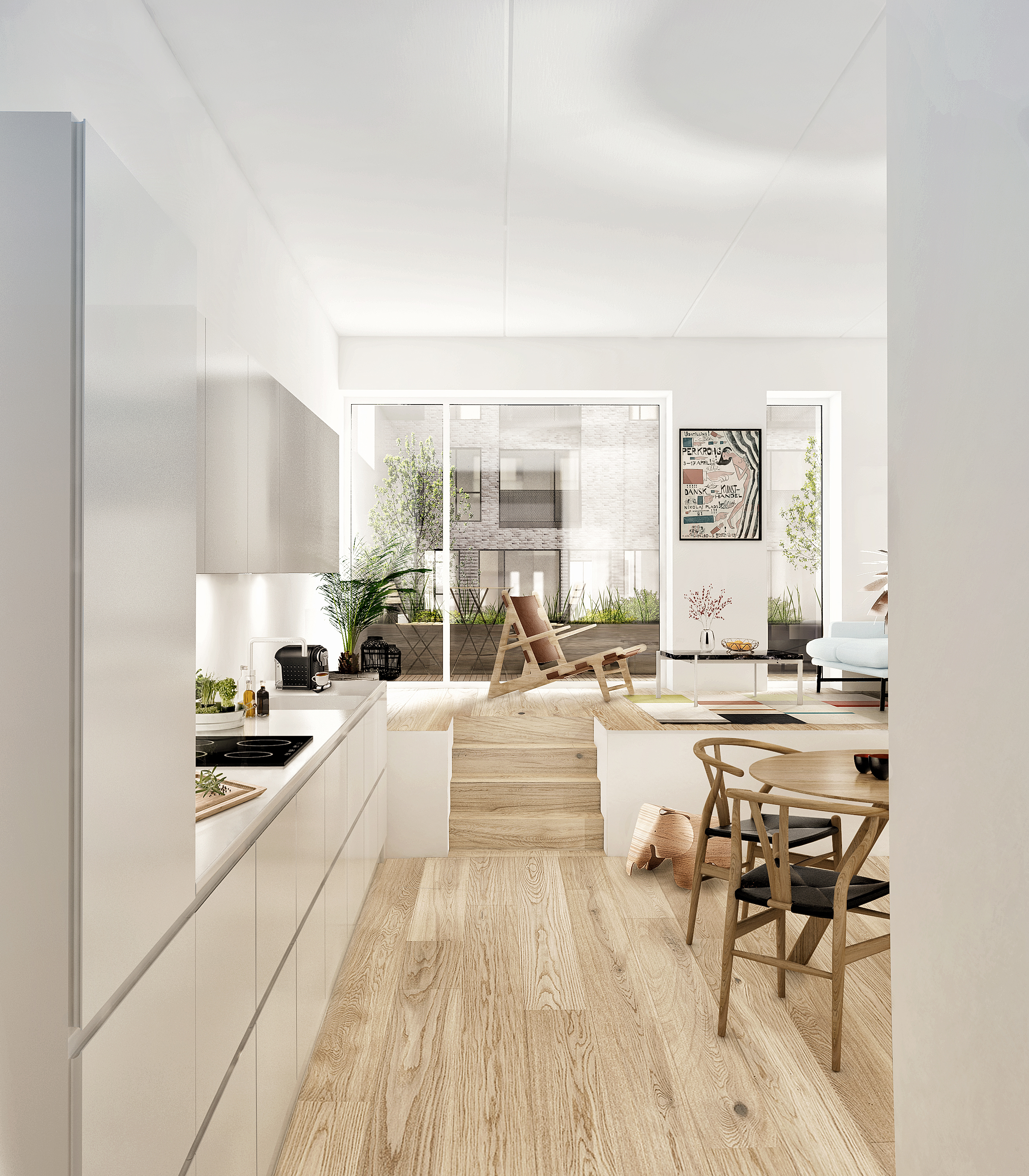 Bebyggelsen fordeler sig som et vinkelhus i fem til seks etager med lejligheder og to længer med rækkehuse i tre etager. Der er indrettet tagterrasser på alle bygningerne. Udearealerne er begrønnede både omkring husene og i det intime gårdrum. Rækkehusene har egne haver, og i stuelejlighederne er der afskærmede uderum til ophold. Som nabo på landsiden er der langs Sundkaj etableret et offentligt tilgængeligt parkstrøg hele vejen ud mod spidsen af kajen. Den forbipasserende cykel- og fodgængertrafik skærer sig forbi huset sådan, at den ikke virker generende for beboerne.