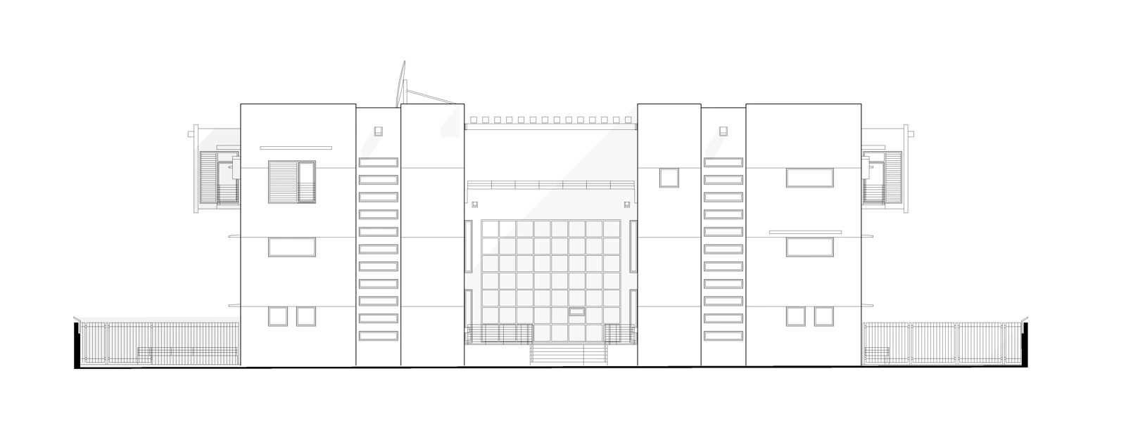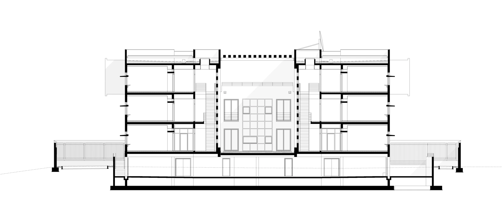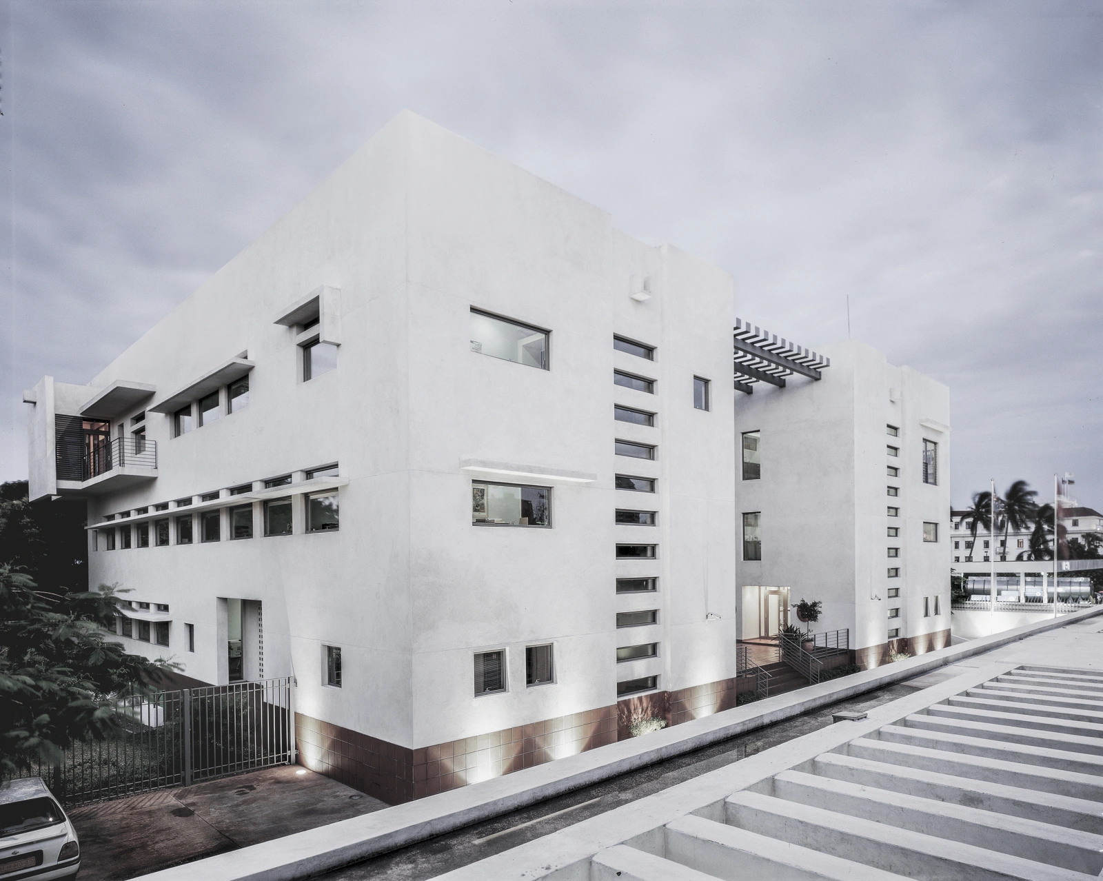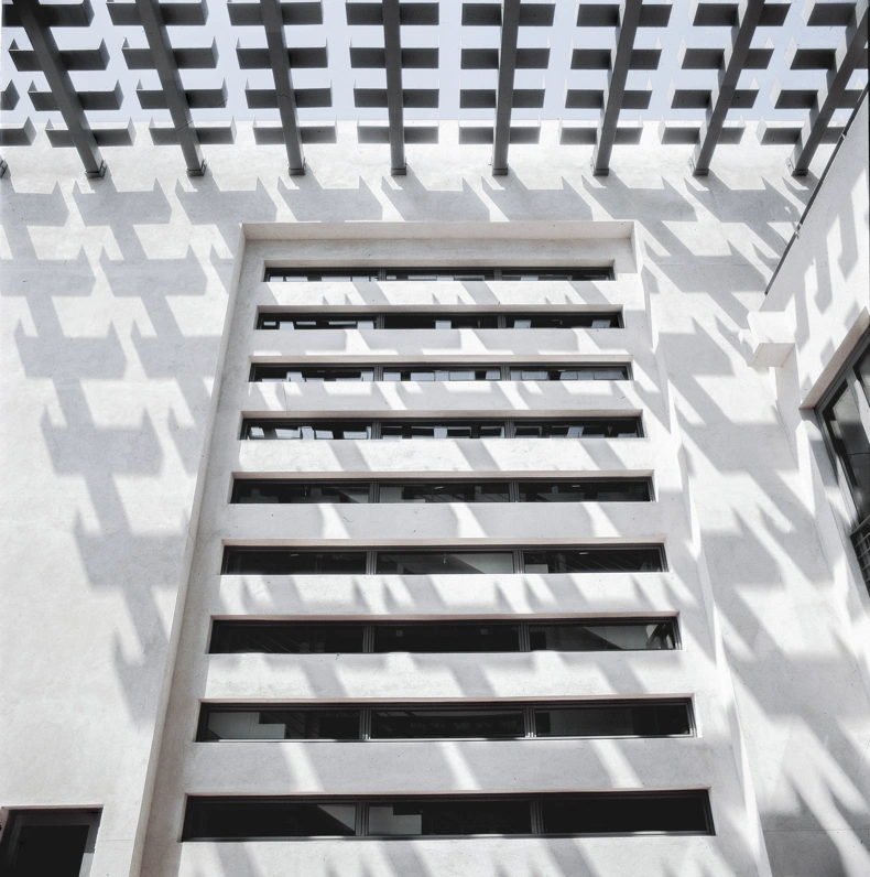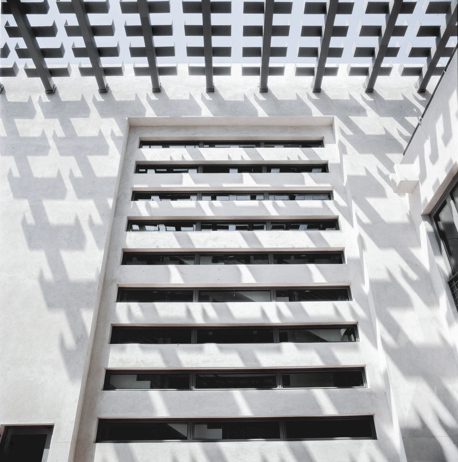 En stålpergola i taghøjde underbygger konceptet om en helhed og de fælles faciliteter, som brugerne deler: Biblioteket, mødelokalerne, kantinen og køkkenet. I materialitet, volumen og vinduesproportioner forholder bygningen sig til det lokale klima.