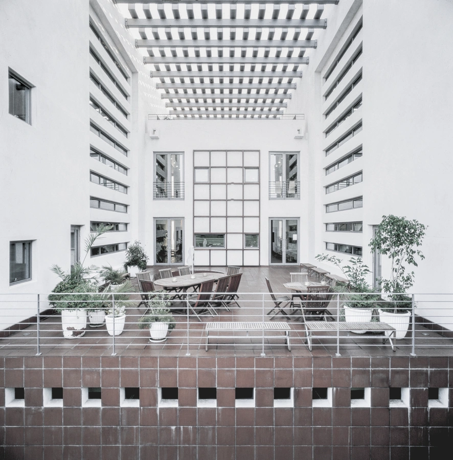 De hvidmalede vægge omslutter de trefløjede terrassemurstensfliser, som for en stor dels vedkommende holdes kølige og skyggefulde af en konstruktiv løsning.
