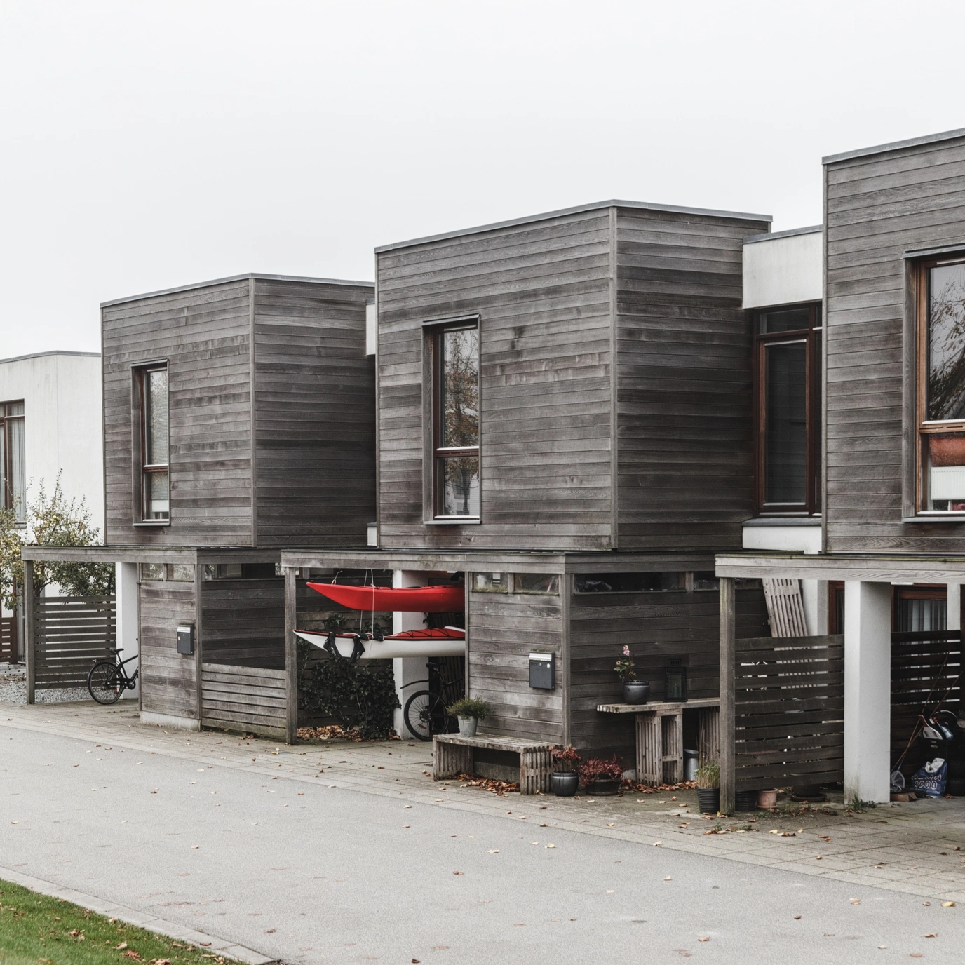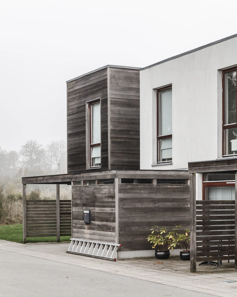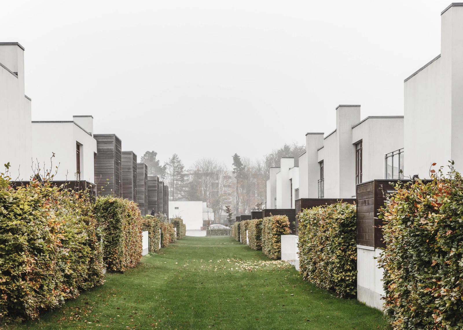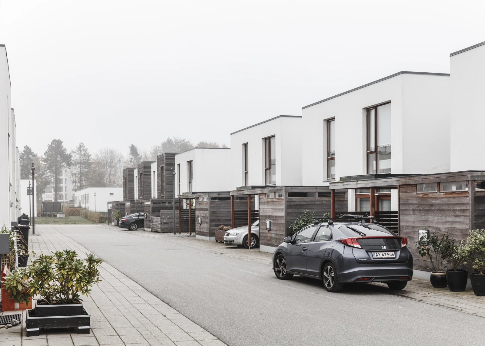 Boligerne på den gamle kasernegrund i Farum ligger i en tæt struktur og selvom de er individuelle boliger, er husene en homogen helhed.
