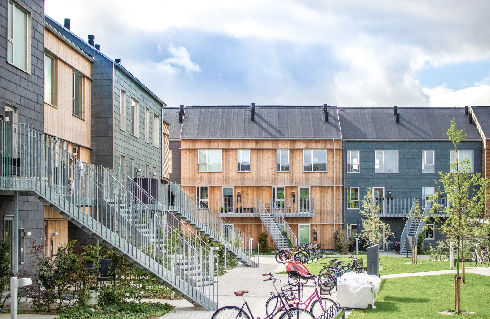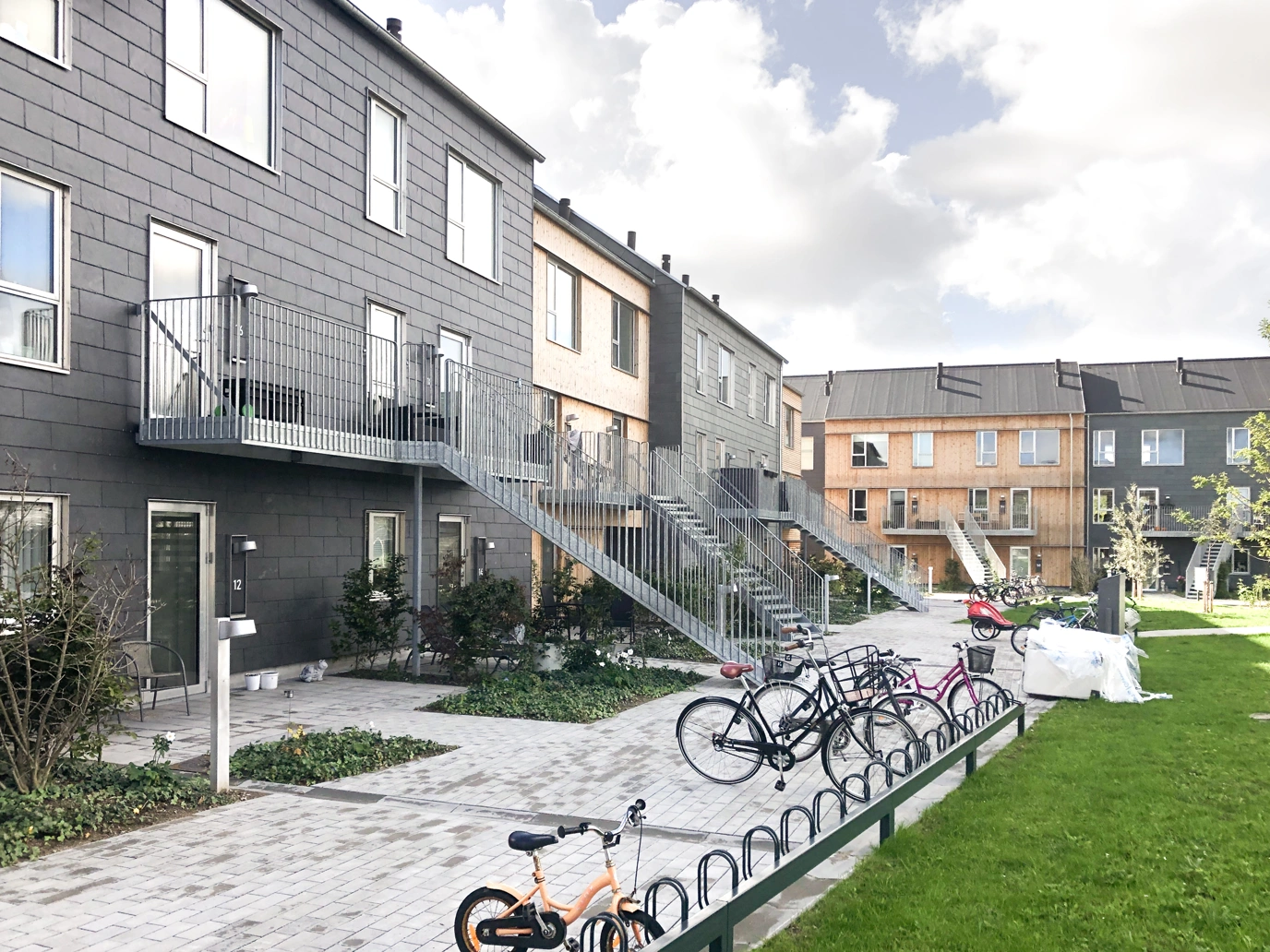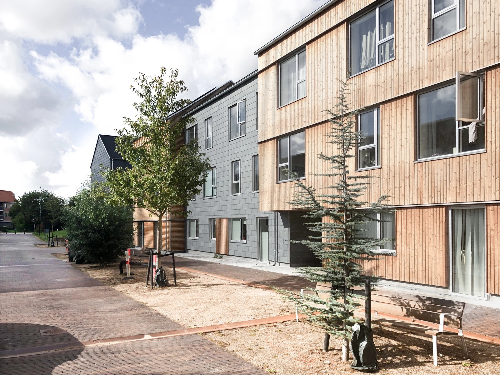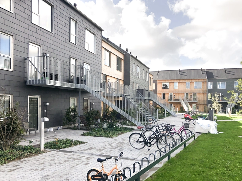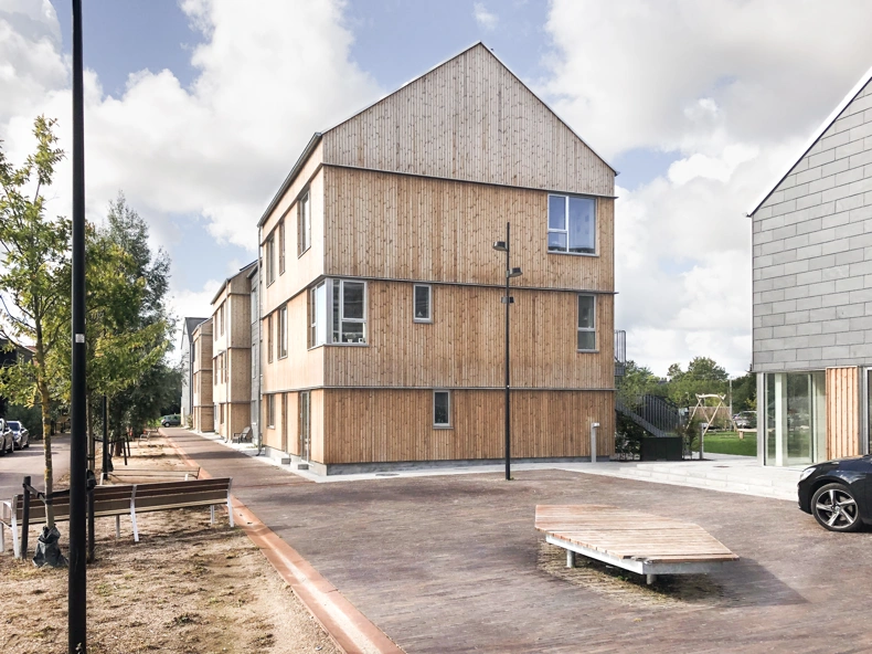 Boligerne varierer i størrelse fra 41 til 115 m² og er designet med forskudte facader og materialeskift for at skabe et varieret og nedskaleret udtryk af mindre, selvstændige byhuse.