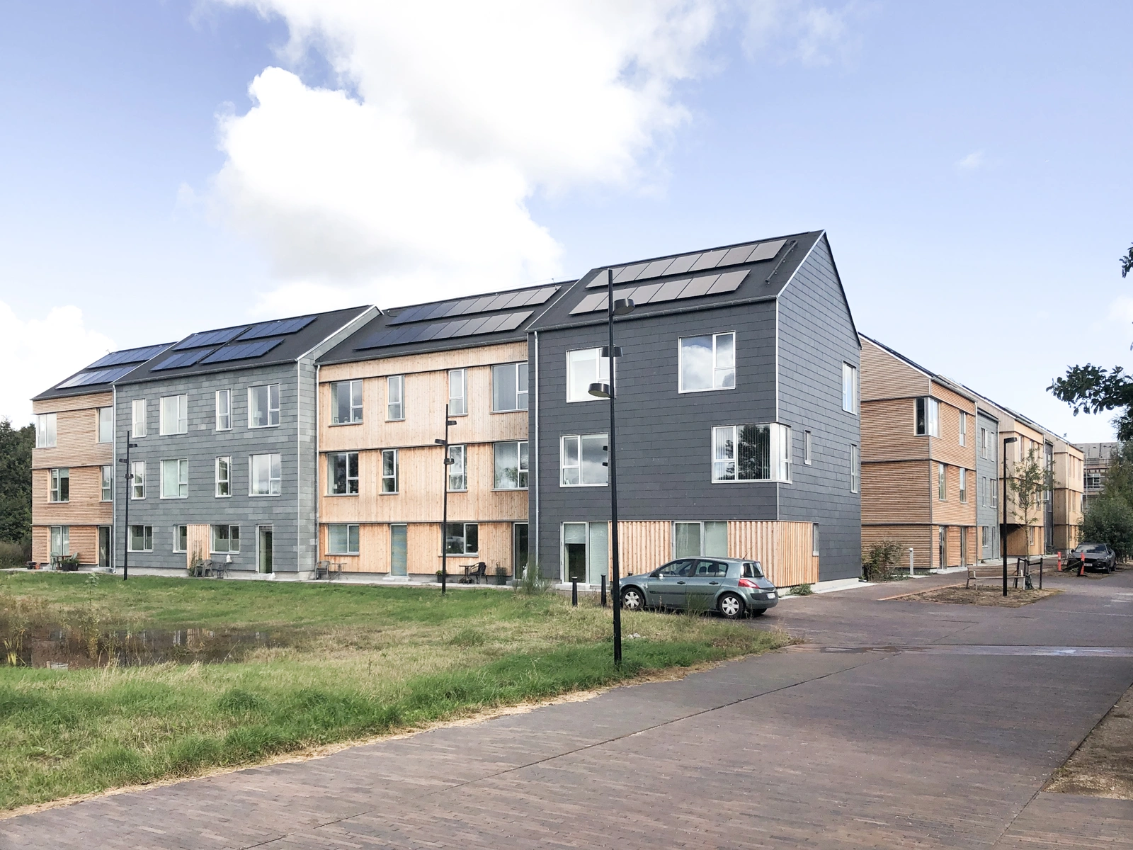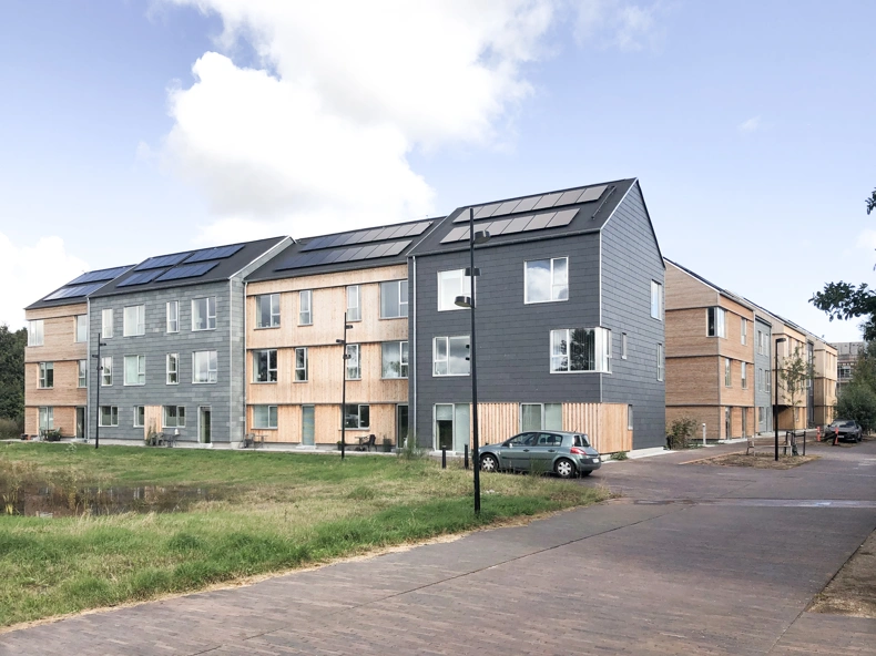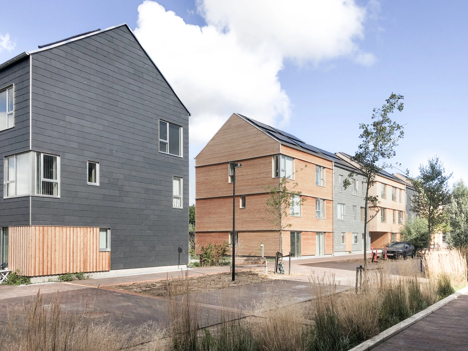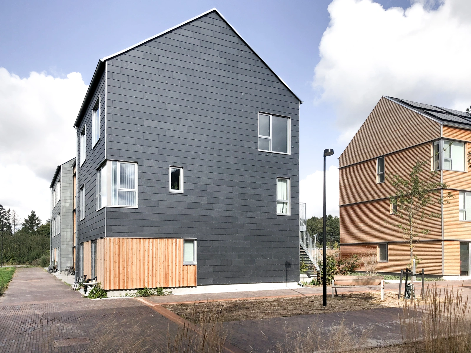 Boligerne varierer i størrelse fra 41 til 115 m² og er designet med forskudte facader og materialeskift for at skabe et varieret og nedskaleret udtryk af mindre, selvstændige byhuse.