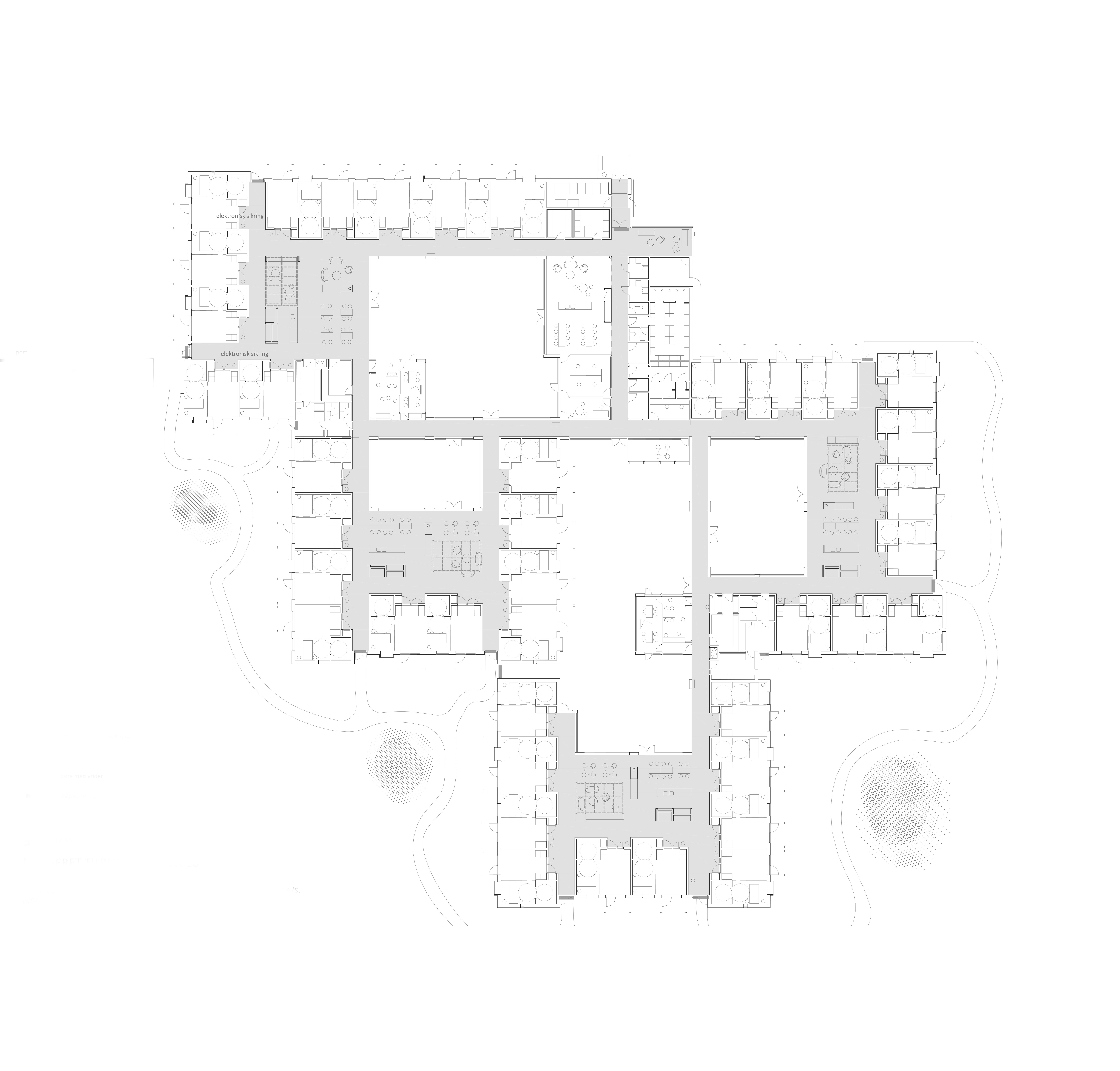 Hver bo-enhed er disponeret med 10 boliger, der har eget badeværelse og have samt fællesarealer og personaleområder.