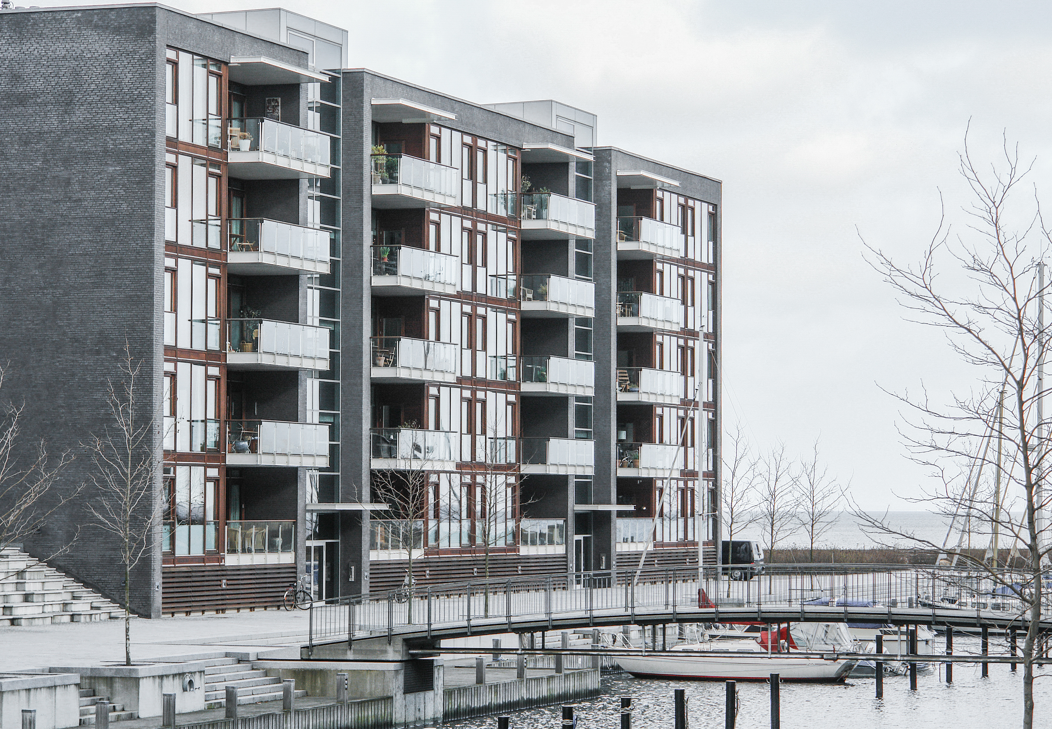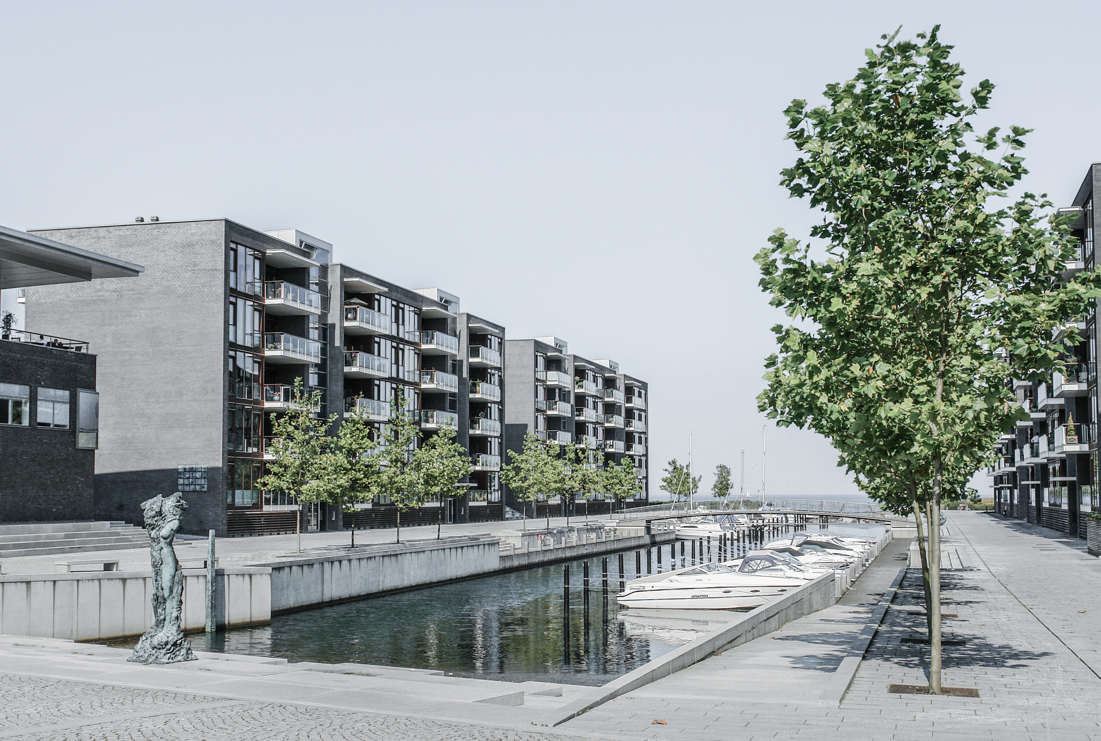 Området ligger smukt ud til Øresund med en kanal som det samlende element, der spejler de i alt fire længebygninger, som bebyggelsen består af.